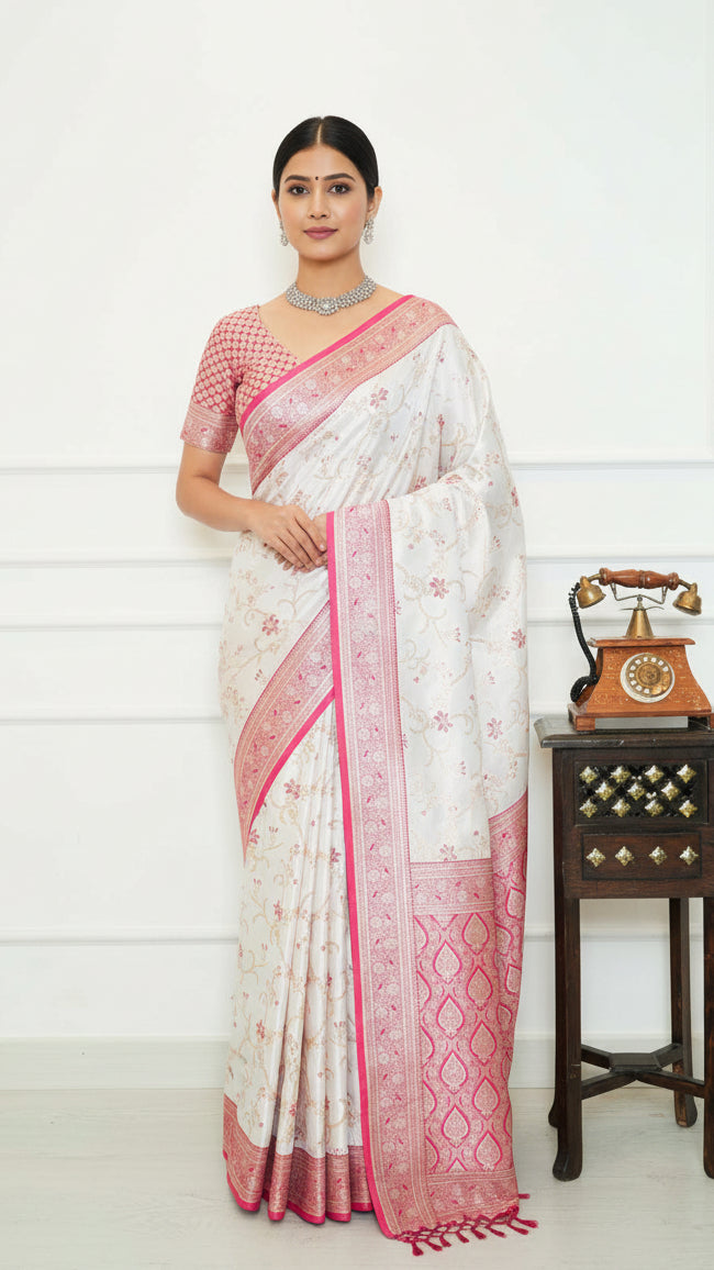 Elevate your saree collection with the Kaira—a stunning contrast silk saree that blends traditional craftsmanship with modern appeal. Featuring a rich silk base paired with a striking contrast border, this piece showcases intricate woven embroidery that catches the light beautifully. Perfect for weddings, festivals, or special celebrations, the Kaira drapes elegantly and offers that timeless sophistication every wardrobe deserves. A versatile investment piece that works for both formal occasions and festive gatherings.