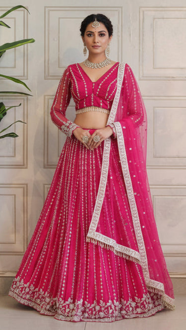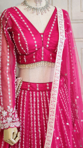 Hot Pink Pearl and Beads Handembroidered Lehenga Panache