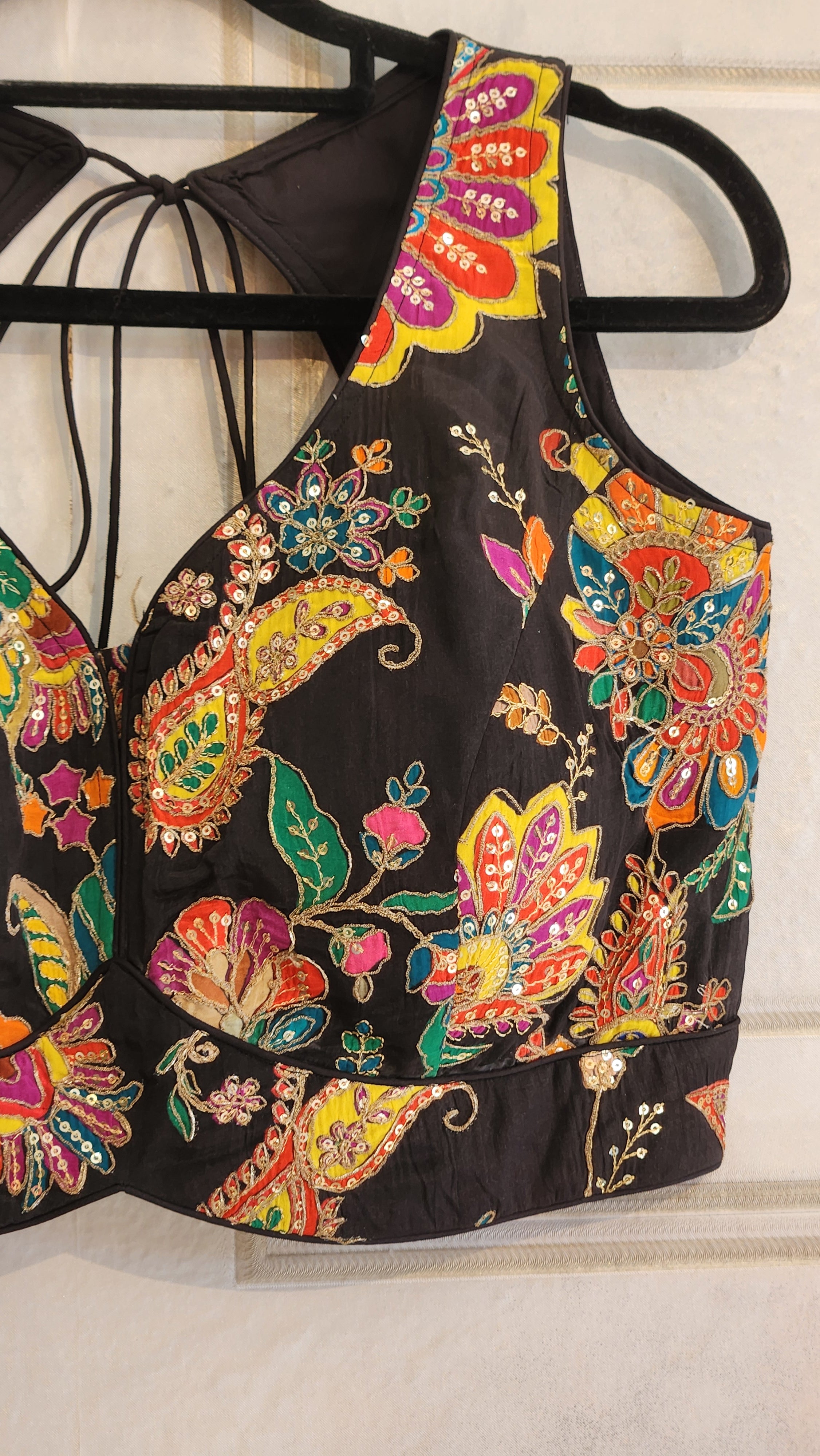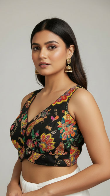 This multicolor half sleeve blouse with a red base is designed in Australia and crafted in Nepal. Made from premium fabric with excellent finishing, it features an inner lining and padded cups for comfort. The blouse showcases trendy, one-of-a-kind designs and includes extra fabric for resizing. Please note, since each blouse is hand-tailored, slight variations like changes in necklines and tassels may occur.