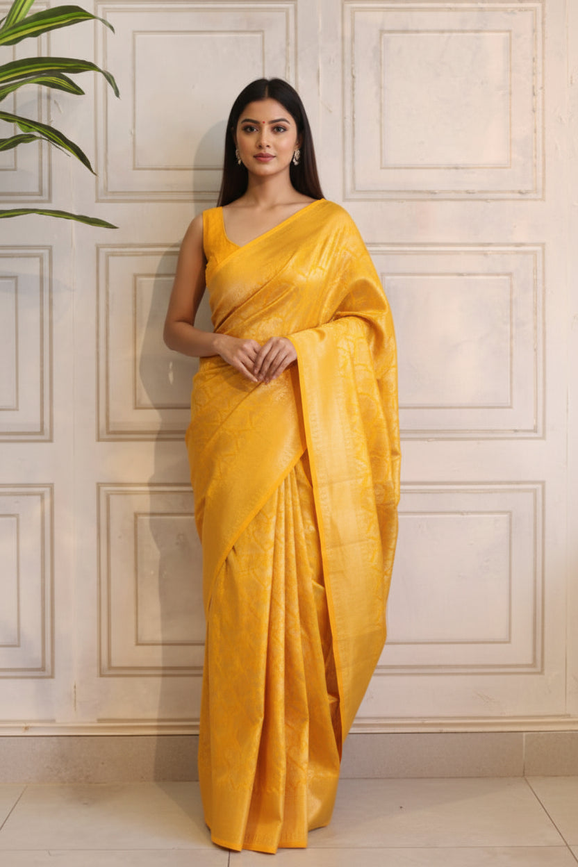 This Silk Saree with Floral Prints is a graceful blend of timeless elegance and modern charm. Crafted from smooth, lustrous silk, it features delicately designed floral patterns that add a refreshing and feminine appeal. The soft sheen of the fabric enhances the vibrant prints, creating a look that is both sophisticated and effortlessly beautiful. Perfect for festive gatherings, celebrations, or elegant daytime occasions, this saree offers comfort, style, and refined elegance in every drape.
