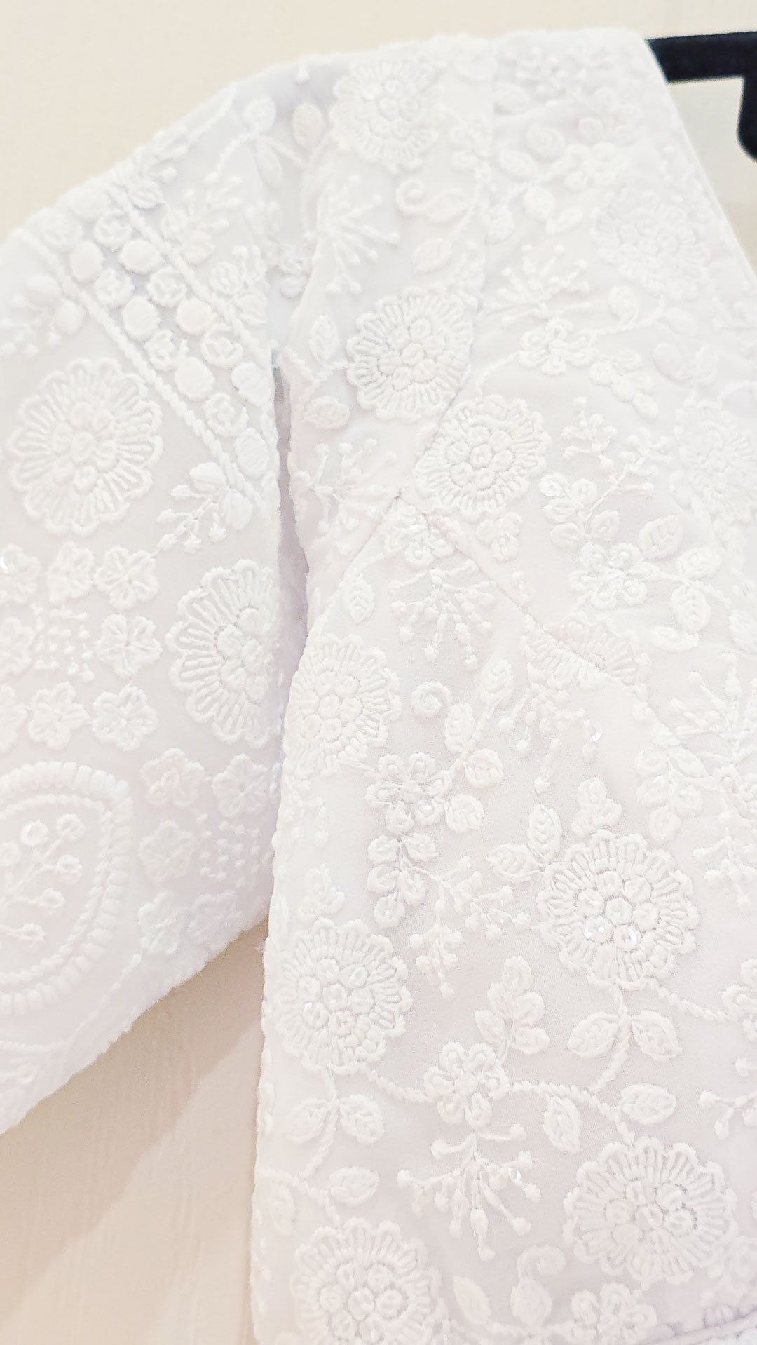 Elevate your ethnic wardrobe with this exquisite chikankari blouse, featuring delicate hand-embroidered detailing on premium fabric. The flattering V-neckline front pairs beautifully with a V-cut backline and decorative tie-back with latkan accents for a refined finish. Built-in inner lining and padded cups provide comfortable support and structure, while the generous tailoring allows for up to two sizes of adjustment—perfect for customizing the fit to your preference. Ideal for pairing with sarees or lehengas for weddings, celebrations, or everyday elegance.