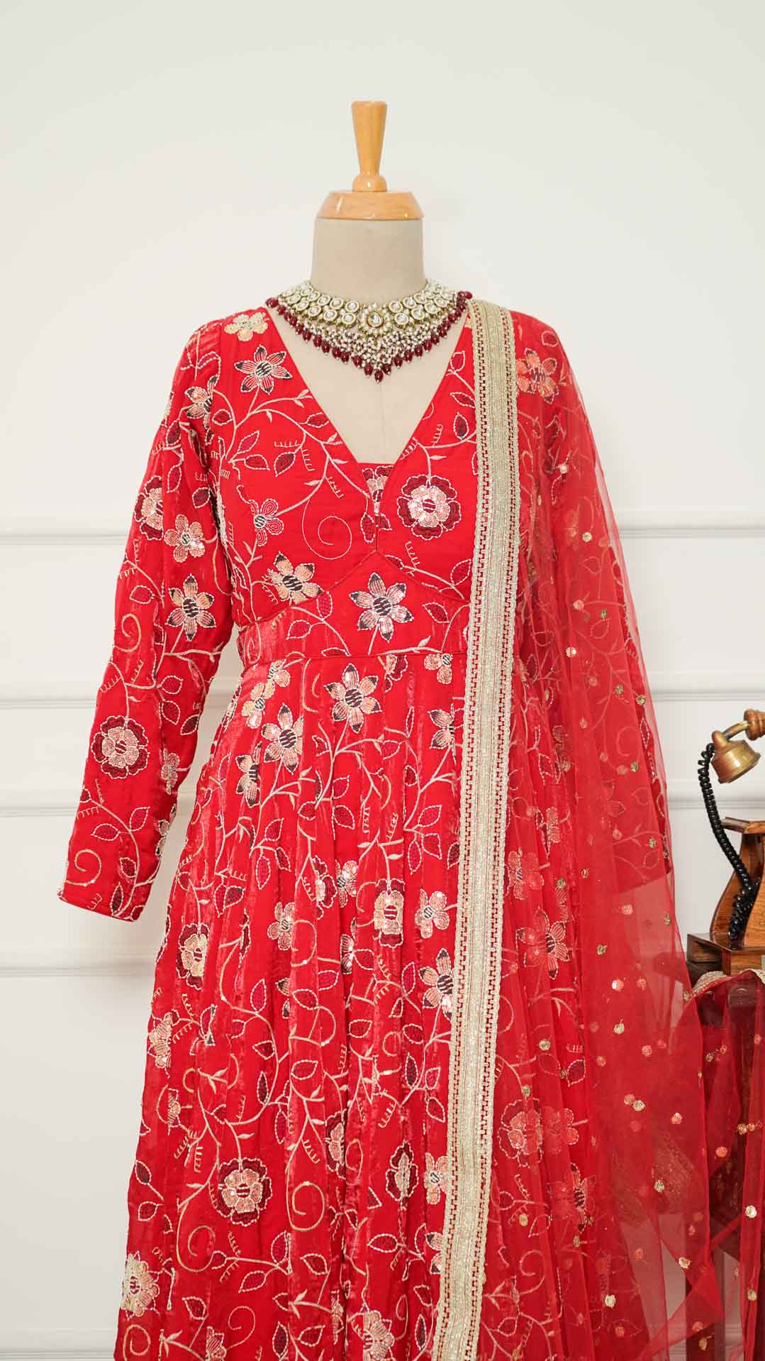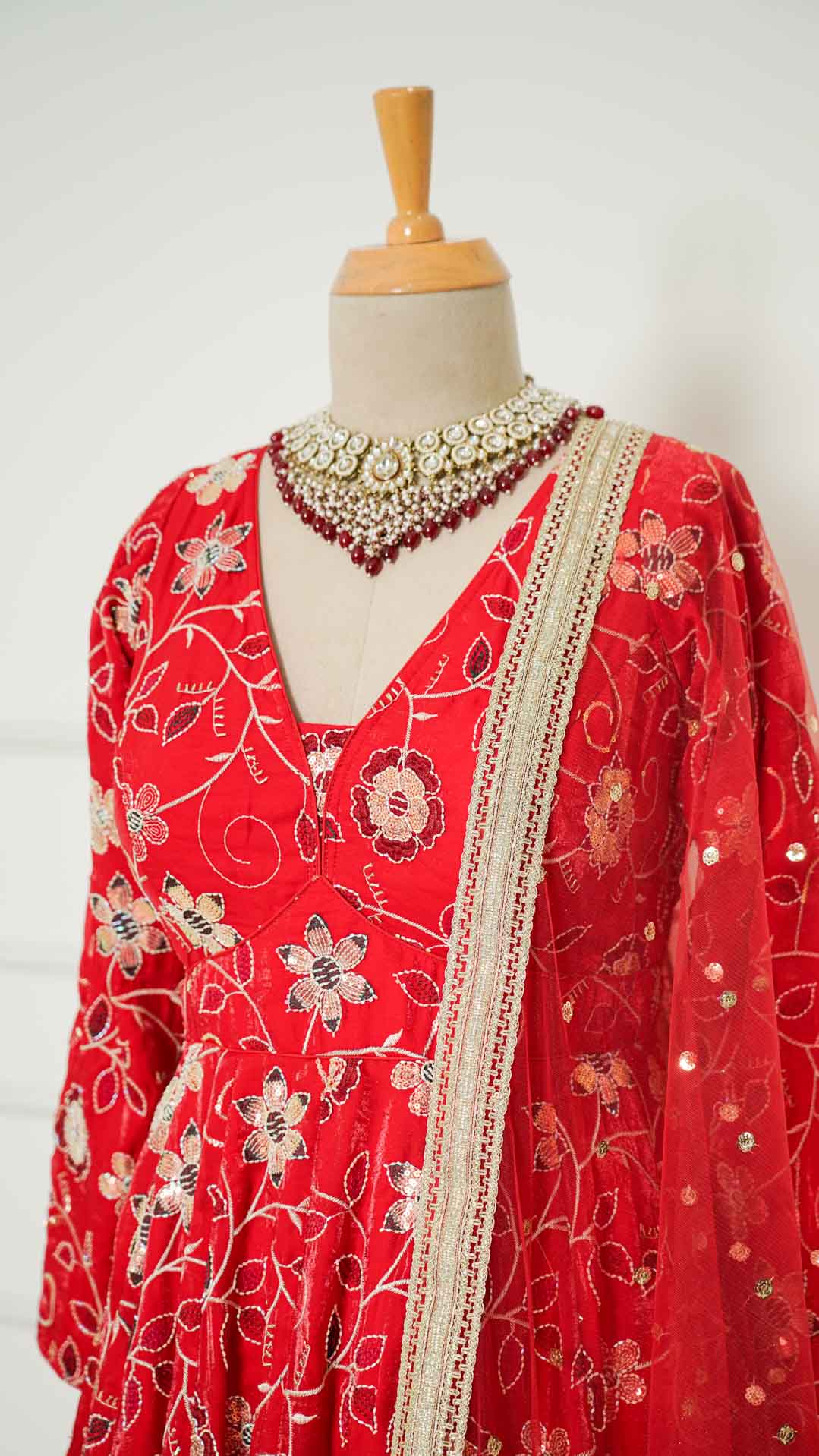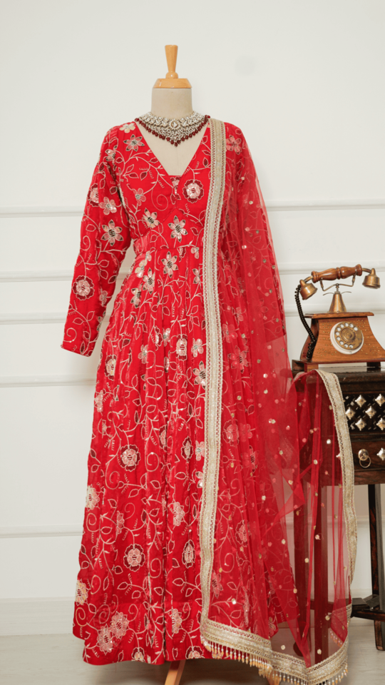 Red Floral Sequinwork Anarkali with Chudidar and Shawl
