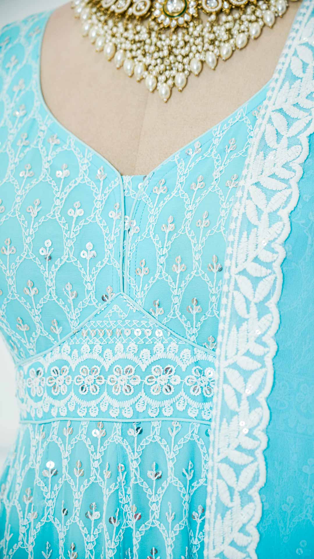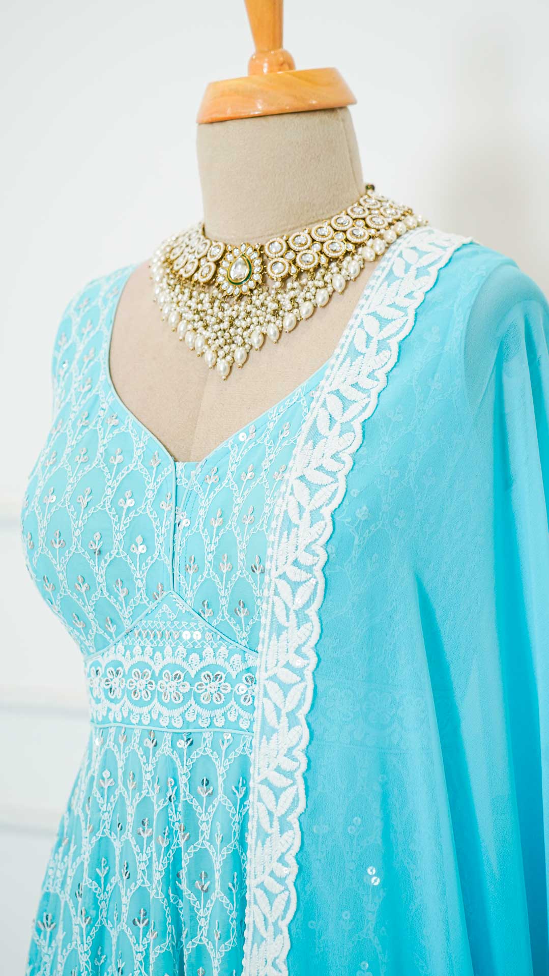 Paired with a mirror and zari work anarkali in georgette.