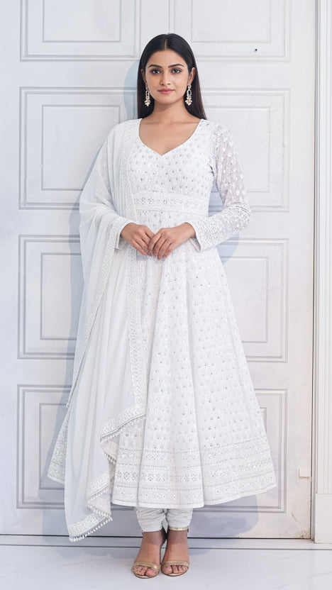 White Motif Threadwork Anarkali with Chudidar and Shawl