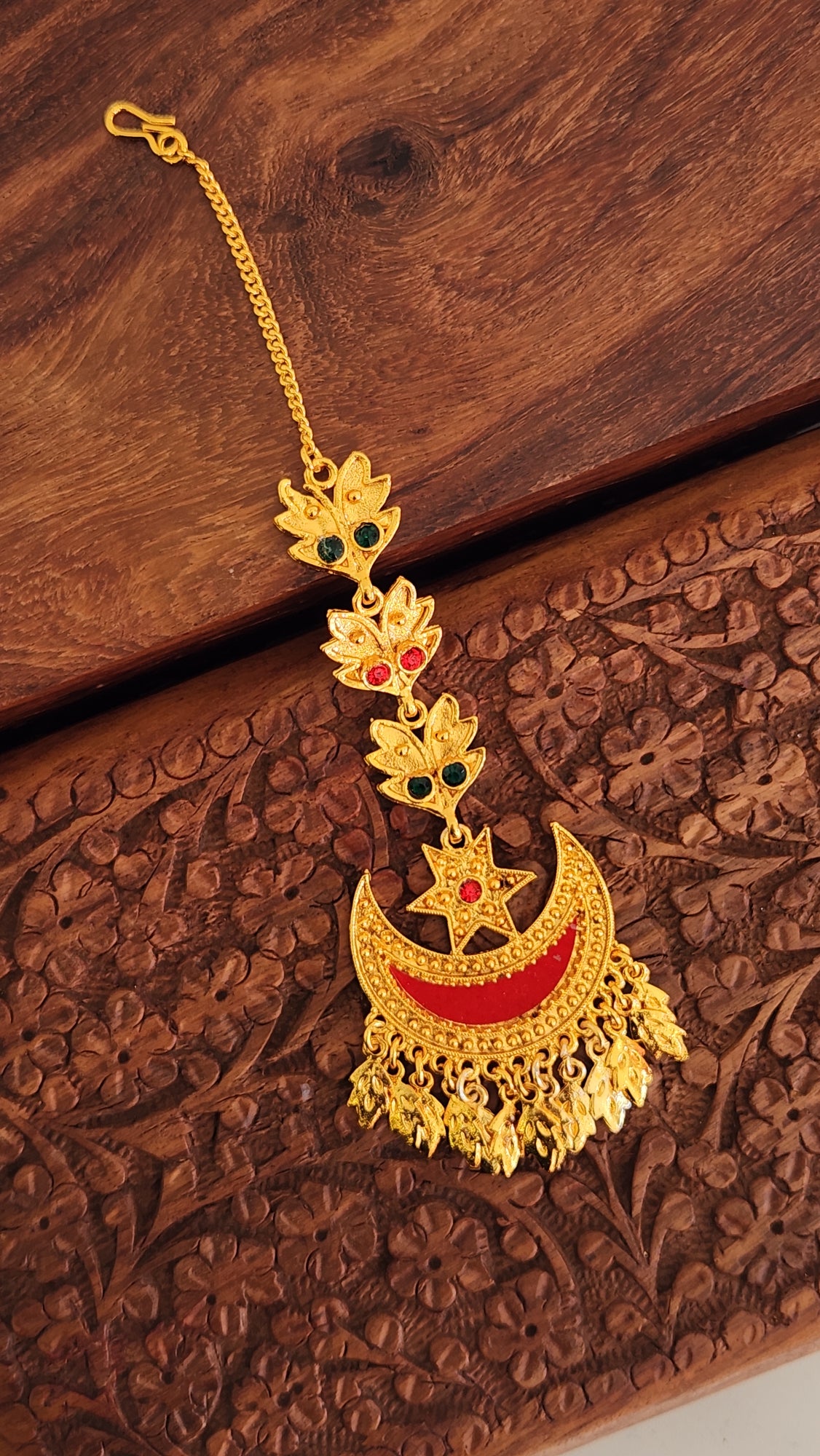 The Gold and Red Nepali Sirbindi is a traditional forehead ornament worn by women. Crafted with a lustrous gold base, it symbolizes purity and protection. The red element which is a stone gem represents vitality, strength, and good fortune. This elegant piece reflects cultural pride and spiritual significance, making it a cherished symbol of marital status in Nepalese tradition.