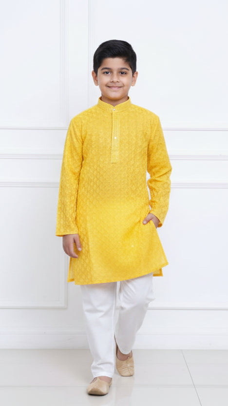 Rayon Chikankari Kurta Pajama for Boys in Yellow