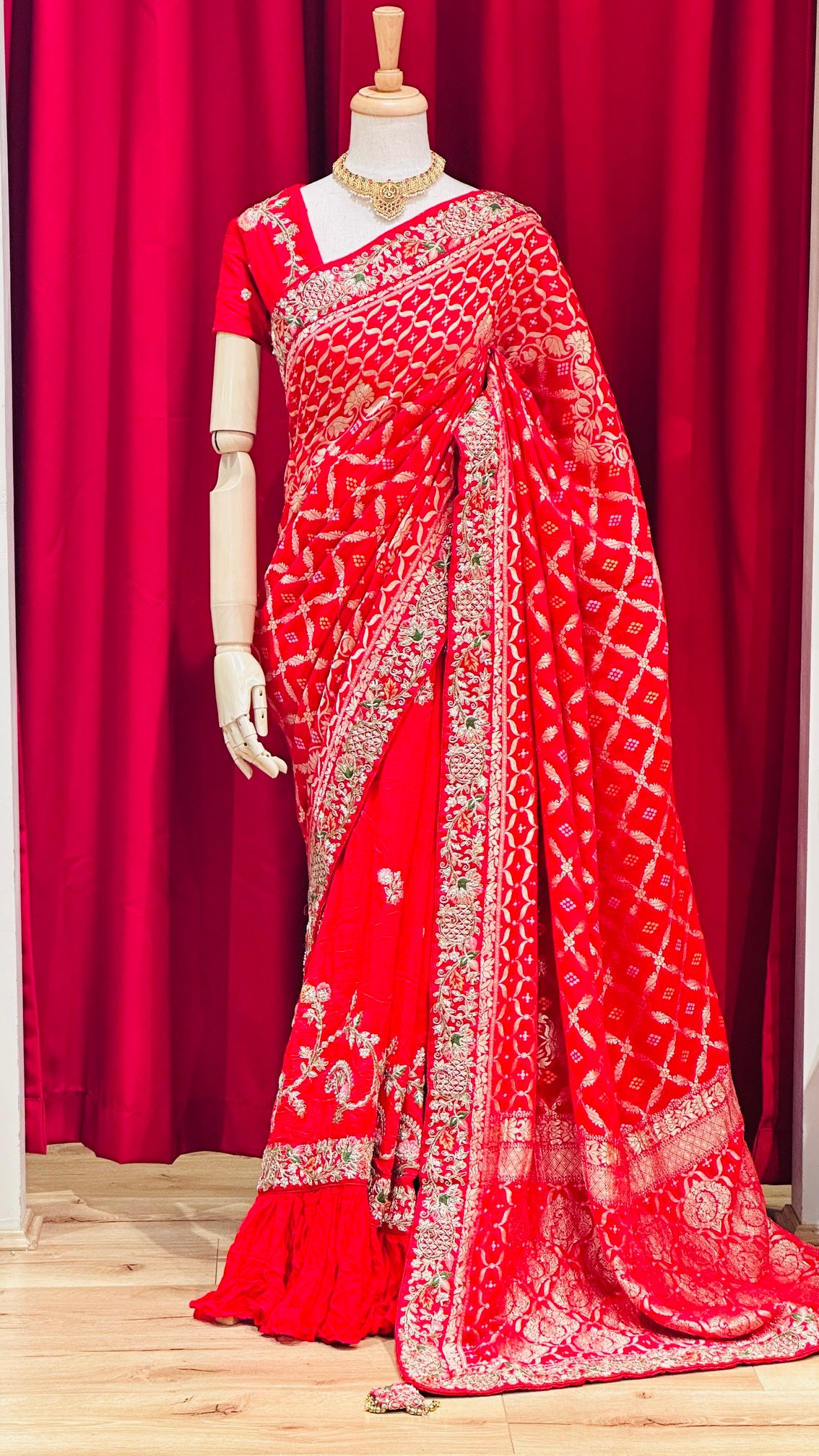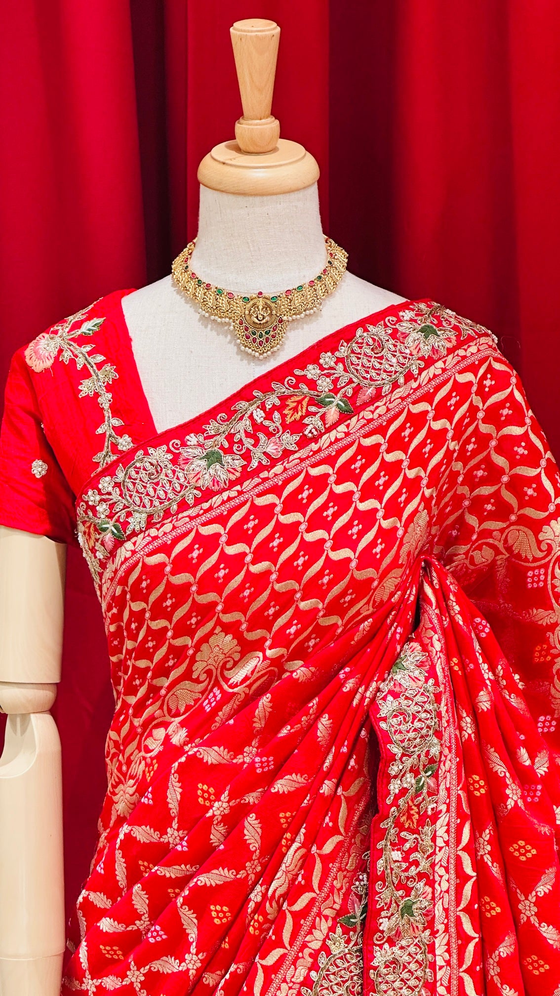 This exquisite Khaddi georgette saree features intricate stone and zari handwork in beautiful floral motifs, adding a luxurious and timeless touch to the fabric. The delicate embroidery enhances the graceful flow of the georgette, making it perfect for festive occasions. The saree is finished with expertly crafted falls and edging work, ensuring a smooth and elegant drape. An unstitched blouse piece is included, allowing for customization to suit your personal style. With its blend of traditional craftsmanship and modern elegance, this saree is sure to make a stunning statement.