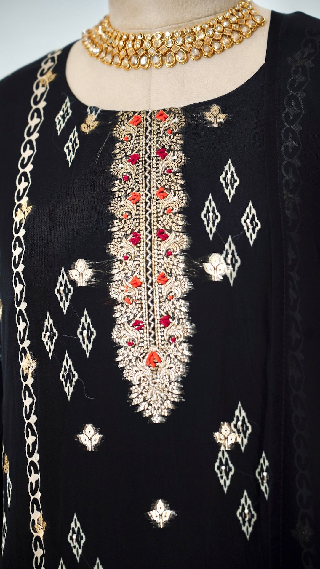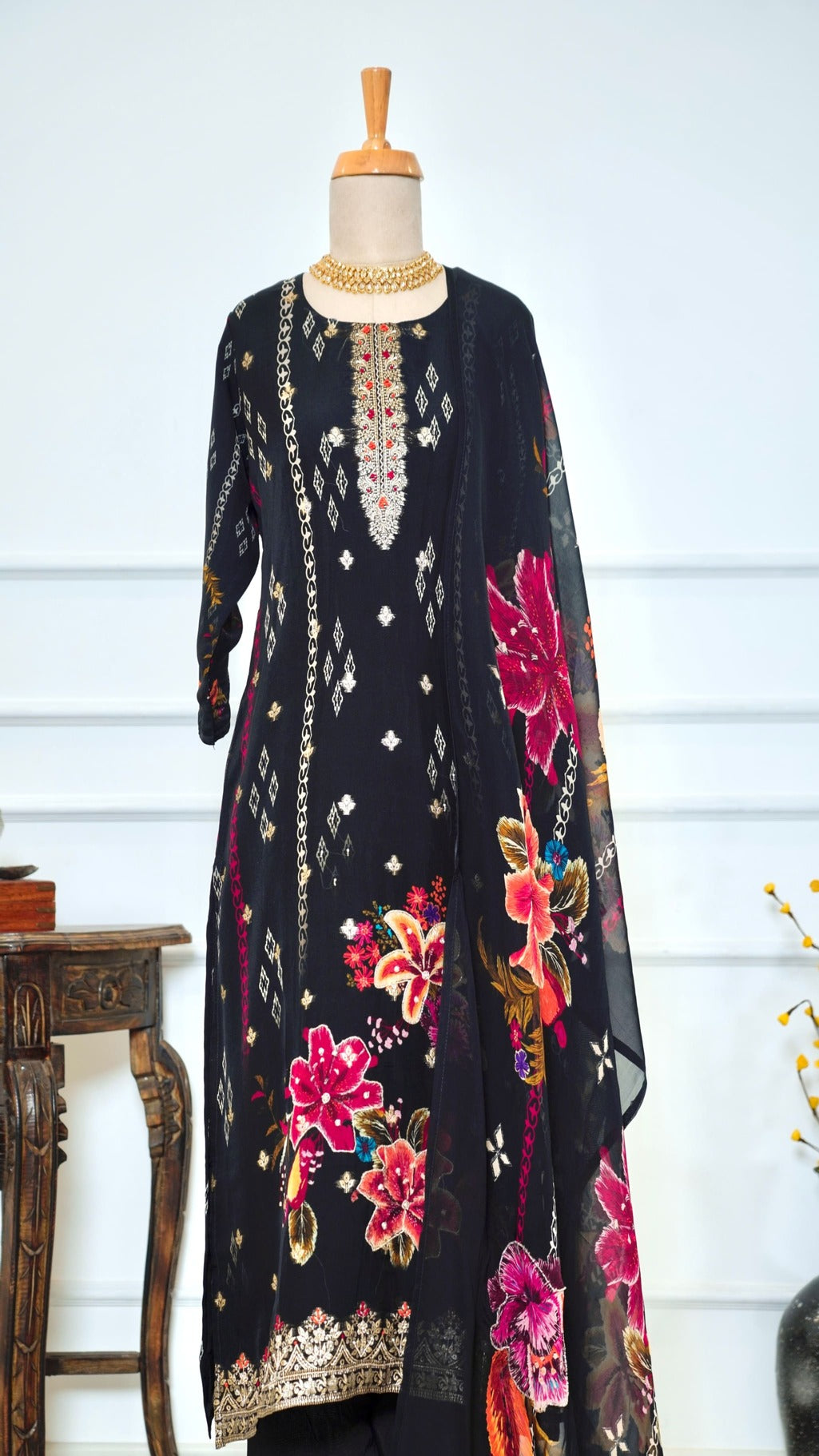 This black kurta set features delicate handwork that adds a touch of elegance to your everyday look. Paired with a rich floral shawl, it offers both comfort and style, perfect for casual outings or relaxed gatherings. The combination brings a subtle yet sophisticated charm to your wardrobe.