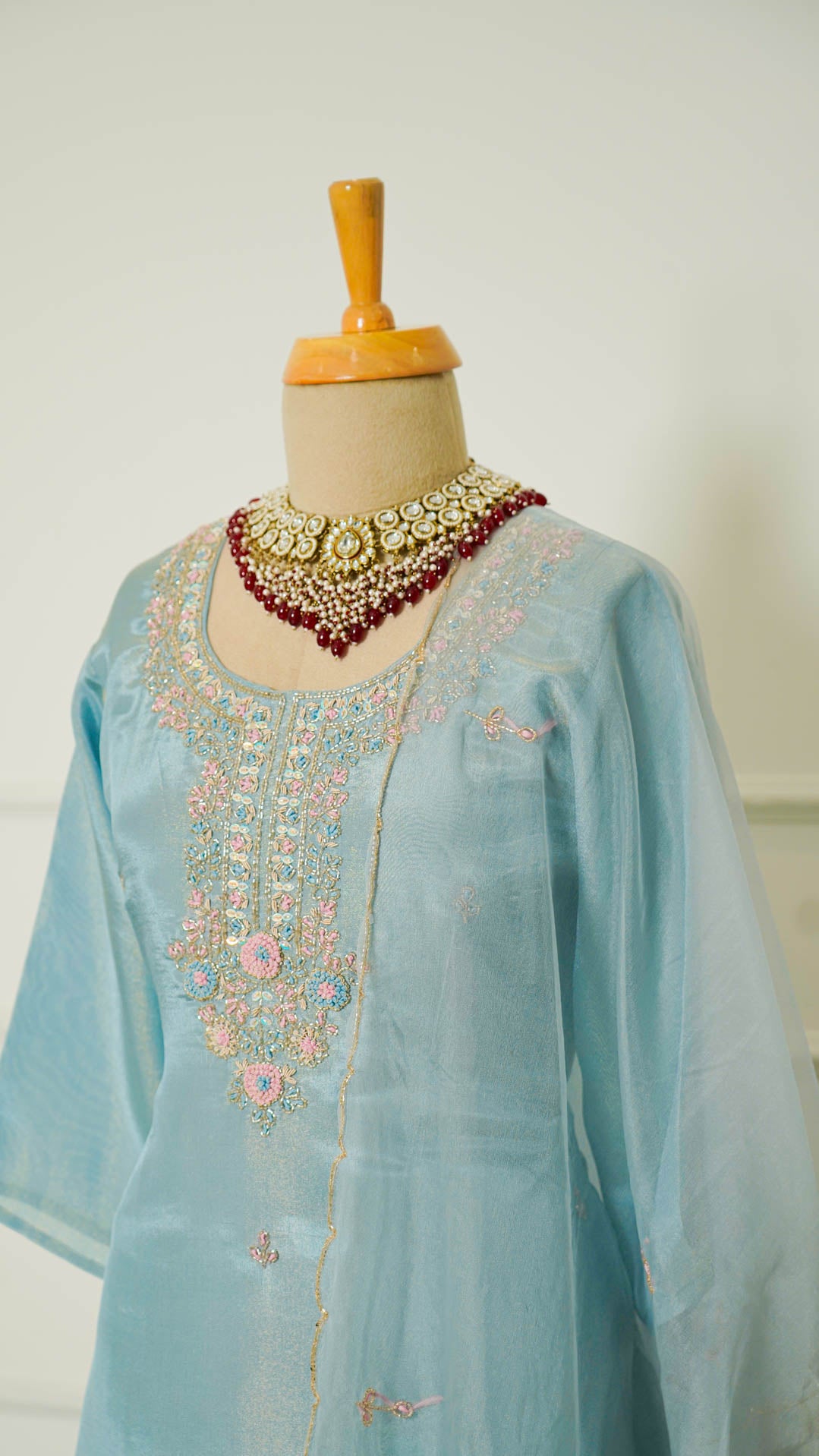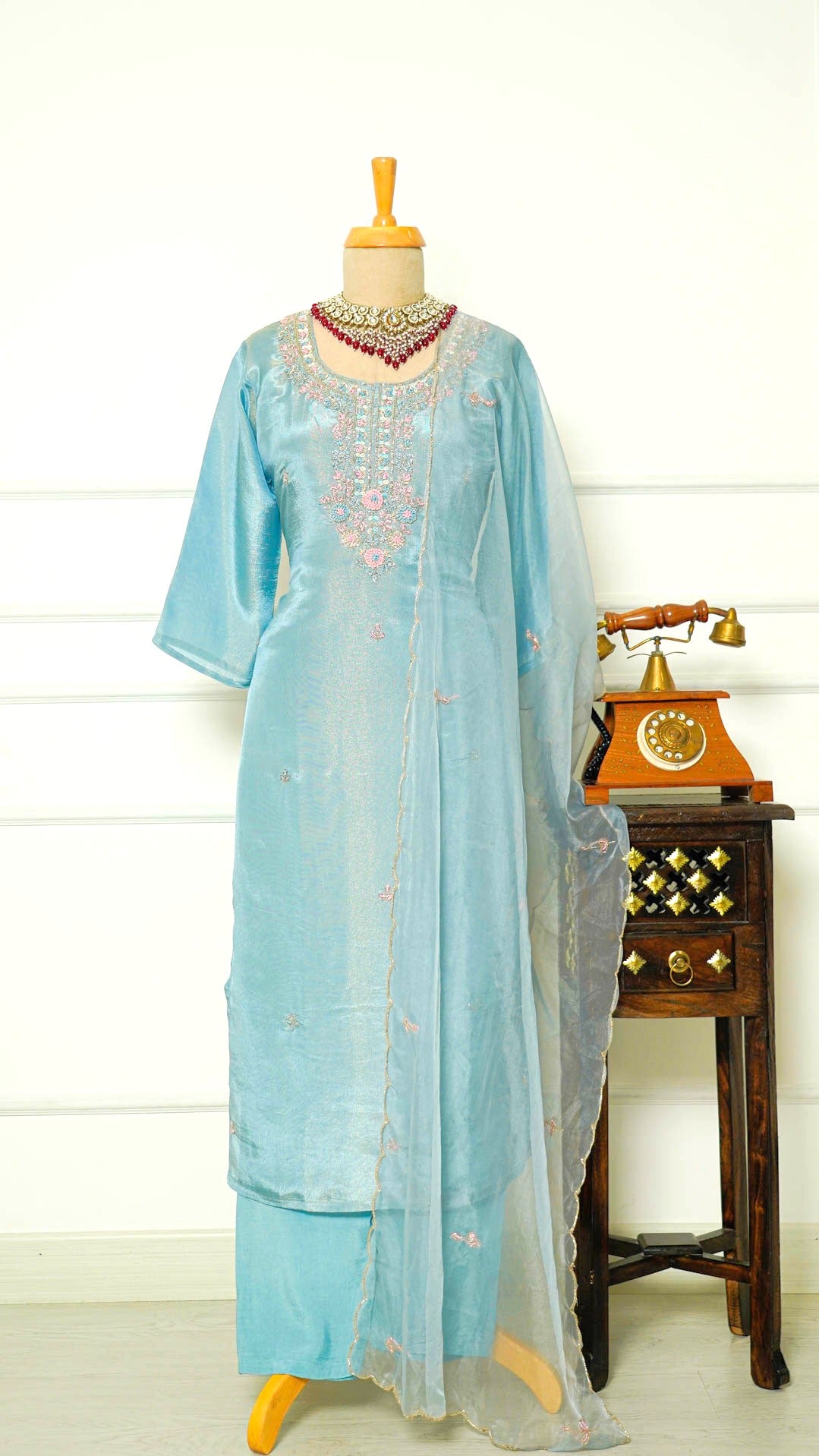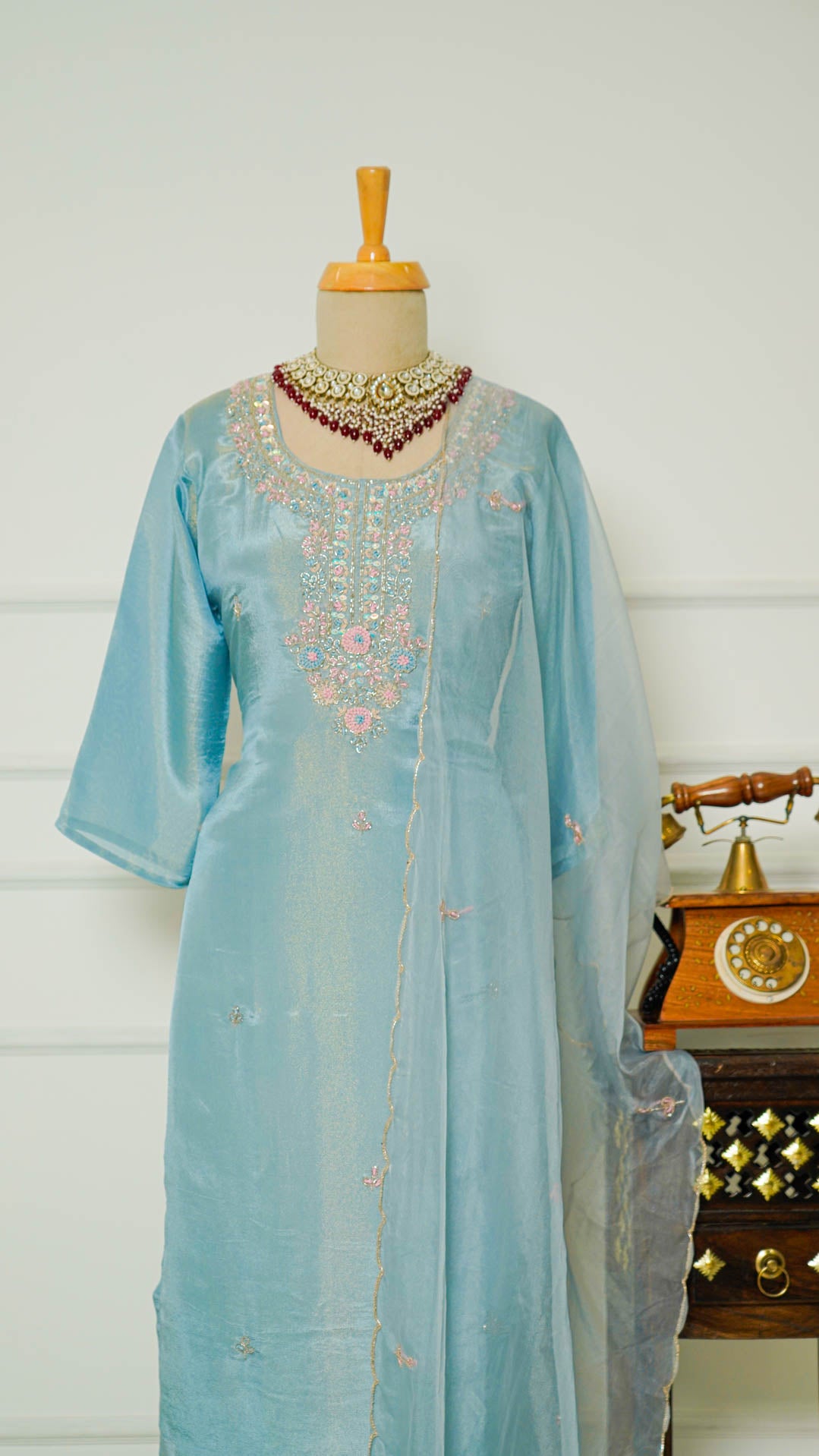 Icy Blue Kurti Suit with Hand Embroidered Neckline