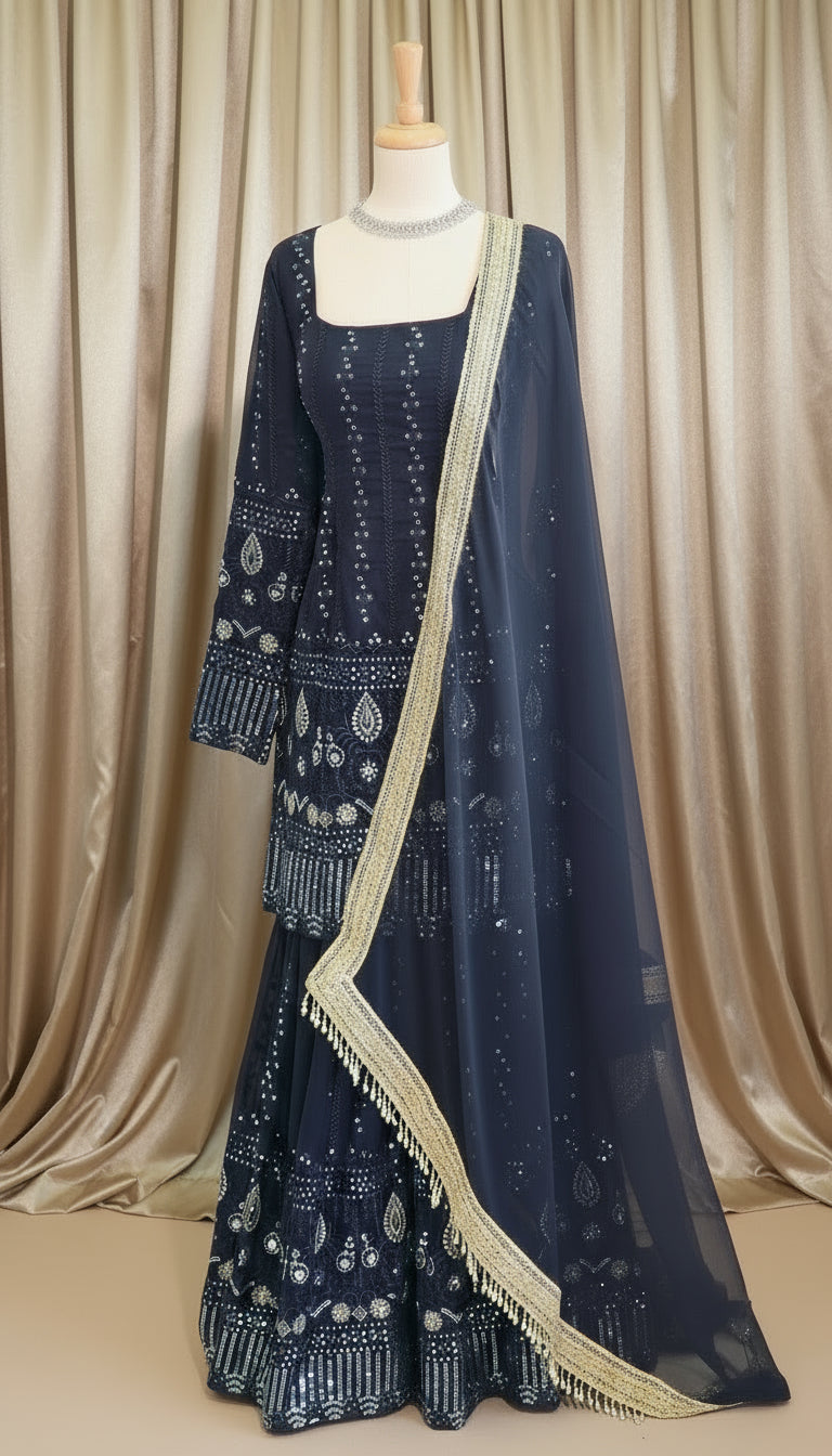 Elevate your style with our exquisite Boutique Garara Suit. Immerse yourself in intricate sophisticated design, and a fusion of tradition and contemporary elegance.