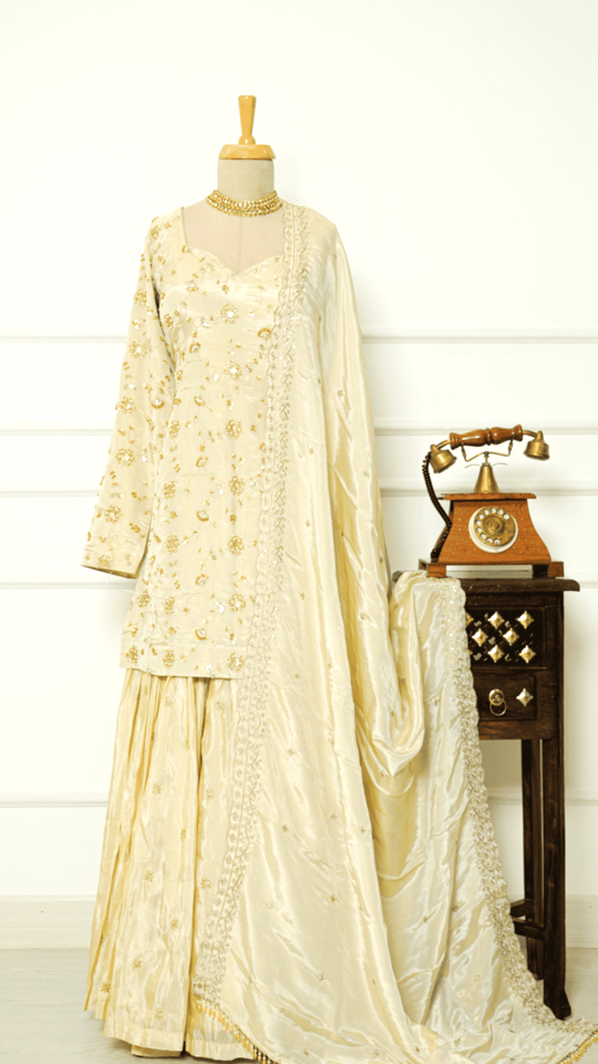 Elevate your style with our exquisite Boutique Garara Suit. Immerse yourself in intricate sophisticated design, and a fusion of tradition and contemporary elegance.
