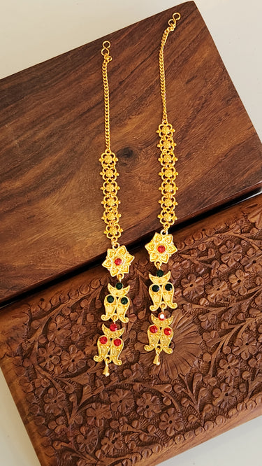 Yarling earrings are traditional jewelry worn by the Limbus and other ethnic groups in Nepal, known for their intricate design and cultural significance. This earring is crafted from gold imitation metal and is characterized by its bold, circular and spiral shapes and is embellished with small stones and detailed engravings.