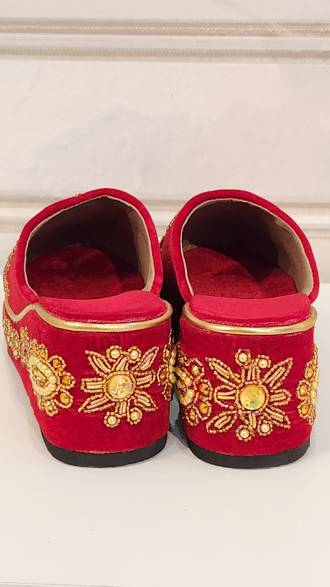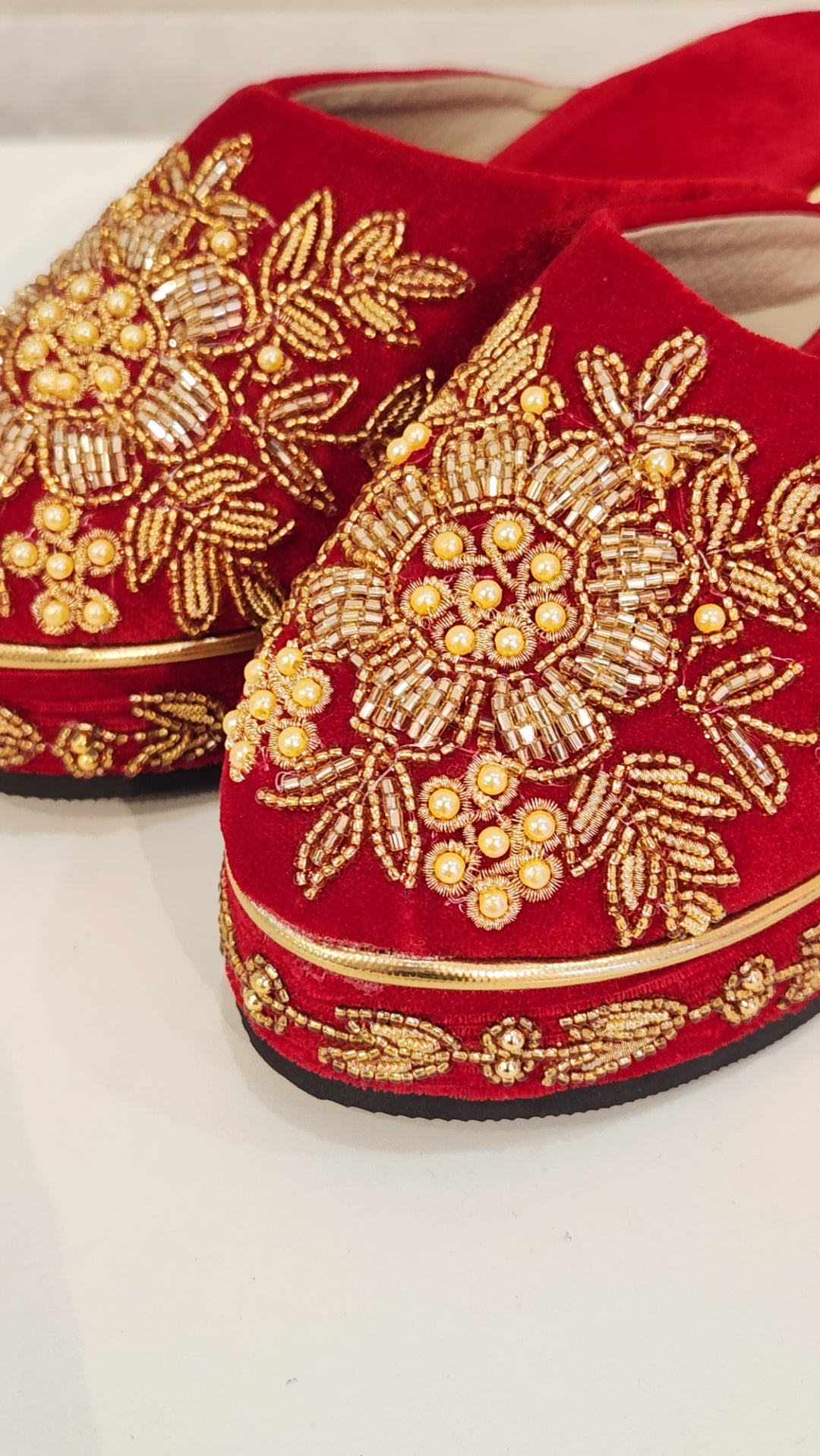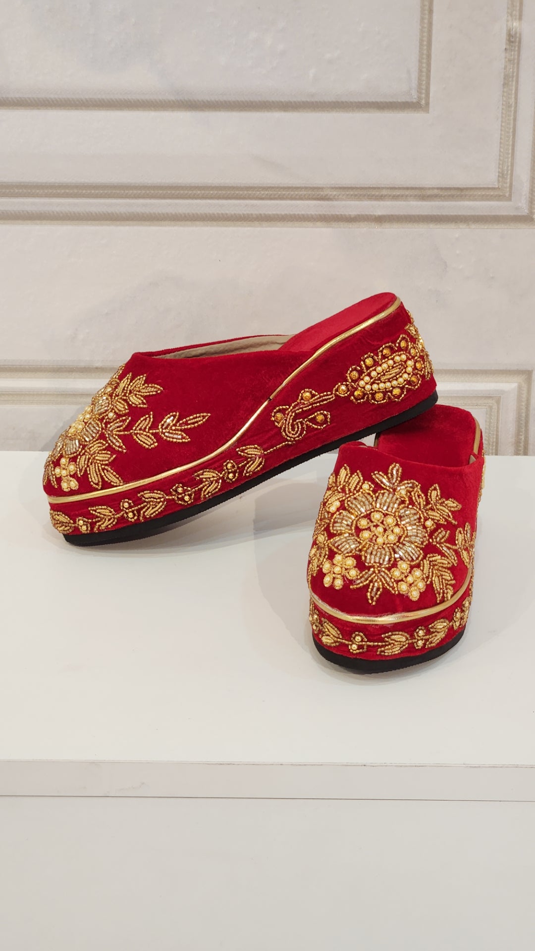 Step into elegance with our Velvet Bridal Shoes, designed to make your special day unforgettable. Crafted from luxurious velvet, these shoes feature exquisite hand-embroidered details that add a touch of personalized artistry and sophistication. The comfortable wedge heels offer both style and stability, ensuring you can dance the night away with ease. Perfectly combining opulence and practicality, these bridal shoes are the ideal choice for a bride seeking both beauty and comfort on her wedding day.