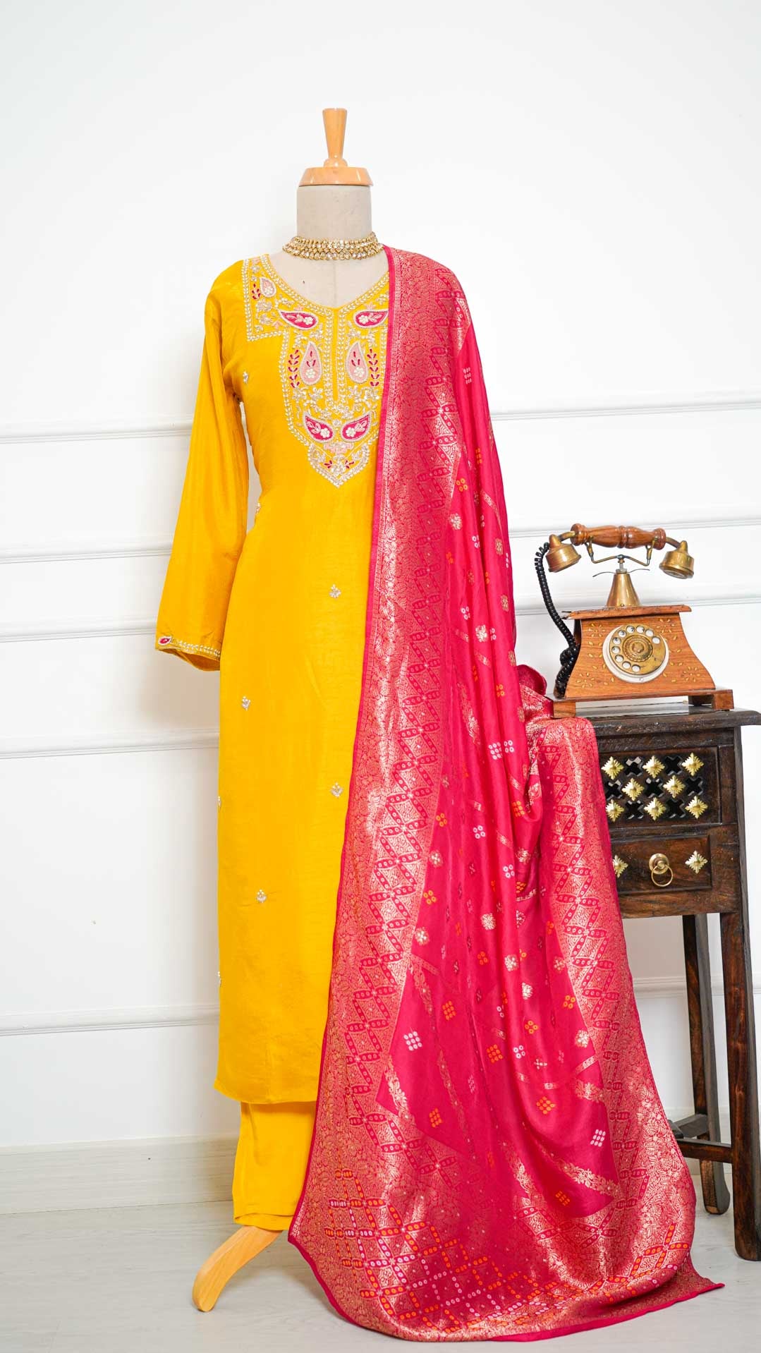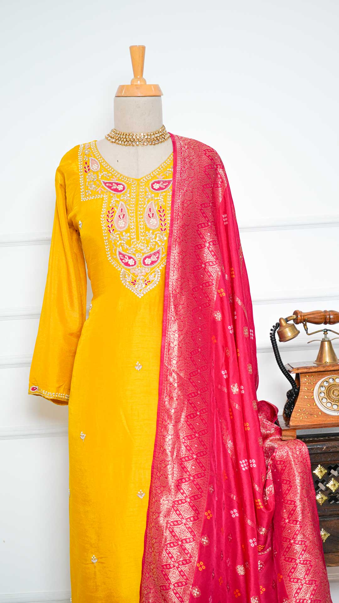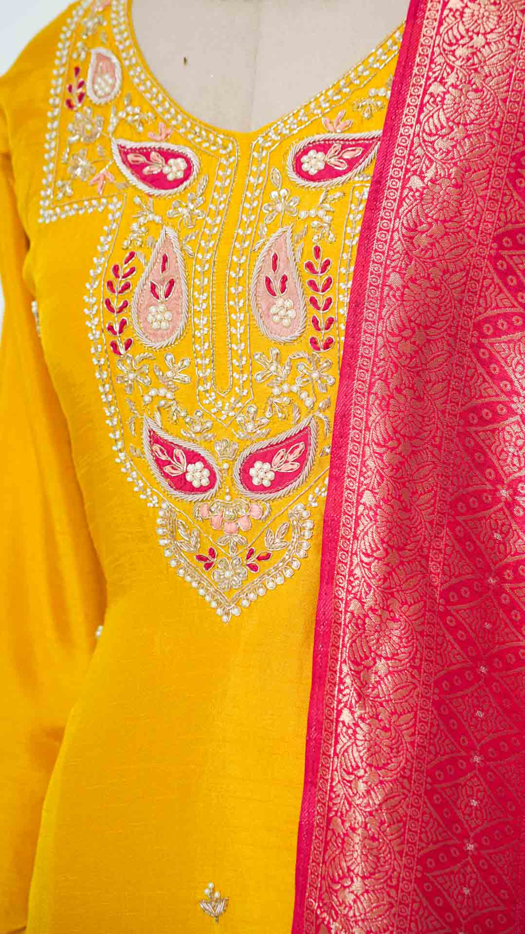 This kurta set features delicate handwork that adds a touch of elegance to your everyday look. Paired with a contrast banarasi shawl and handembroidered neckline, it offers both comfort and style, perfect for casual outings or relaxed gatherings. The combination brings a subtle yet sophisticated charm to your wardrobe.