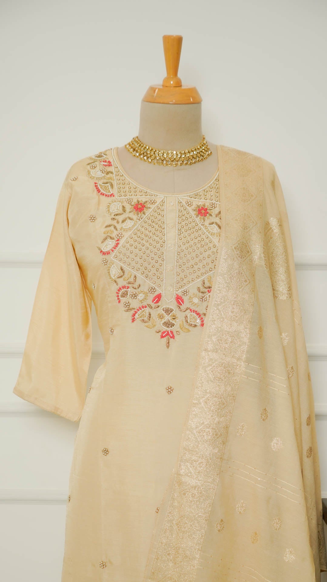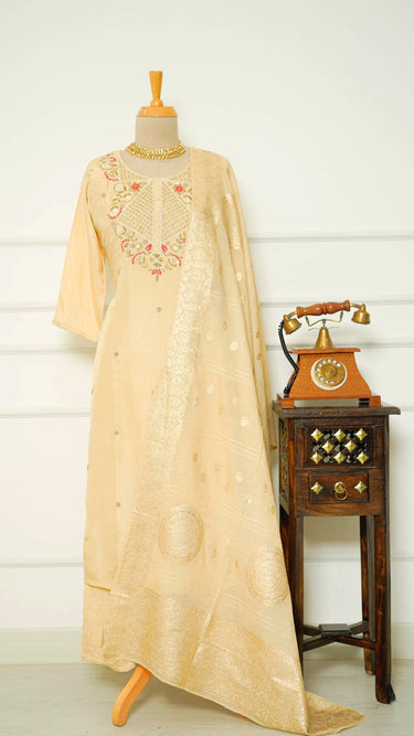 This kurta set features delicate handwork that adds a touch of elegance to your everyday look. Paired with a rich Banarasi shawl, it offers both comfort and style, perfect for casual outings or relaxed gatherings. The combination brings a subtle yet sophisticated charm to your wardrobe.