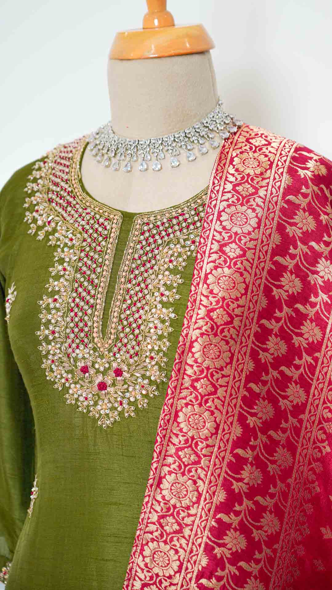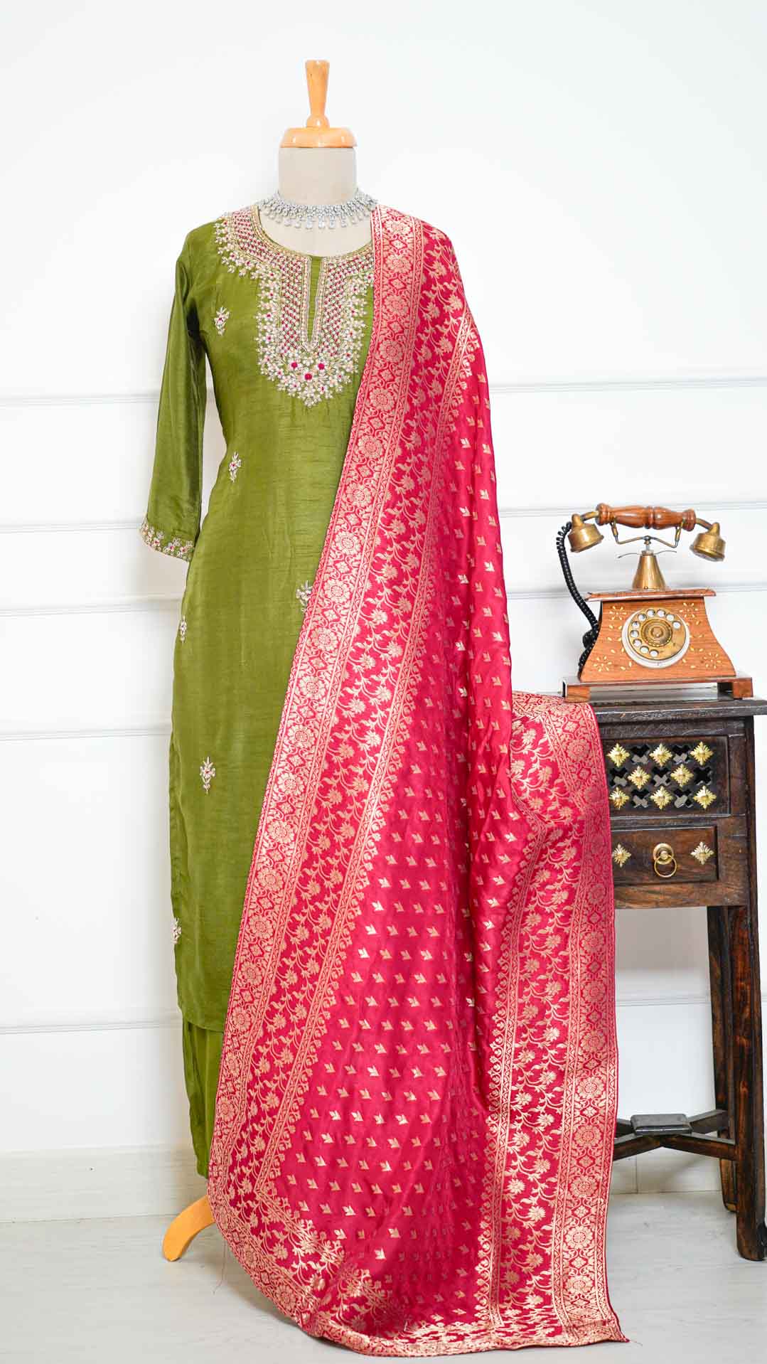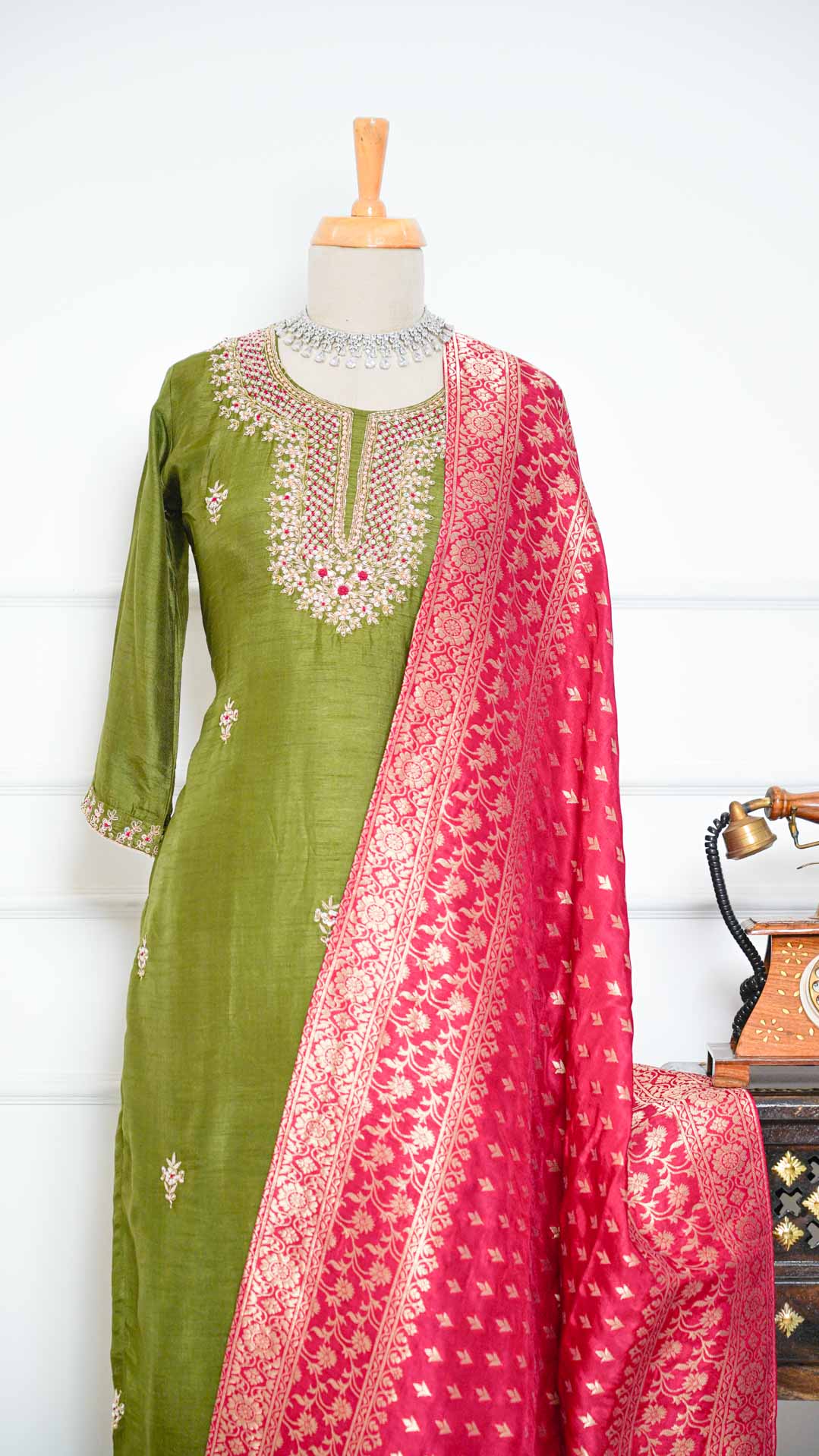 Mehendi Green with Contrast Pink Shawl Kurti Suit