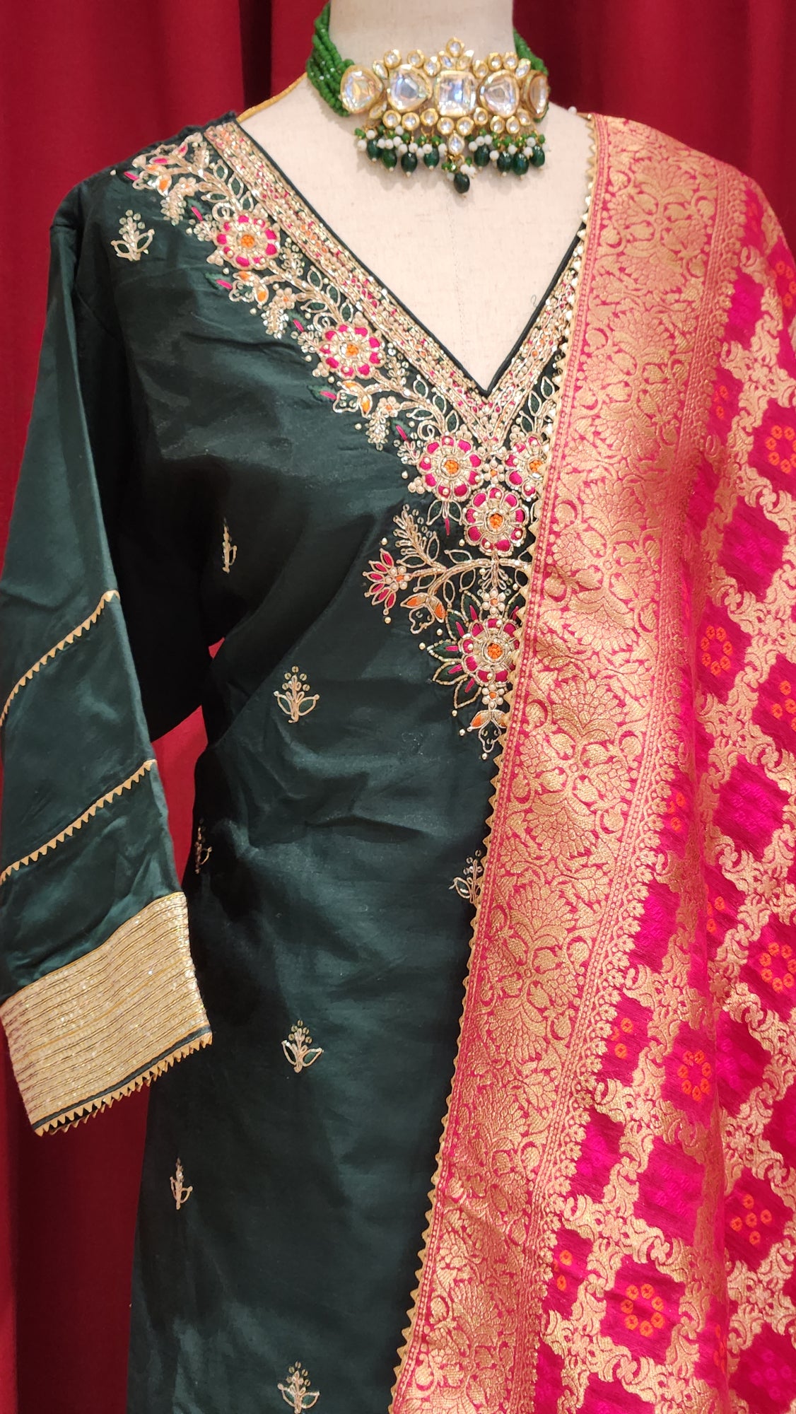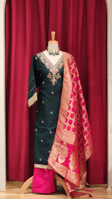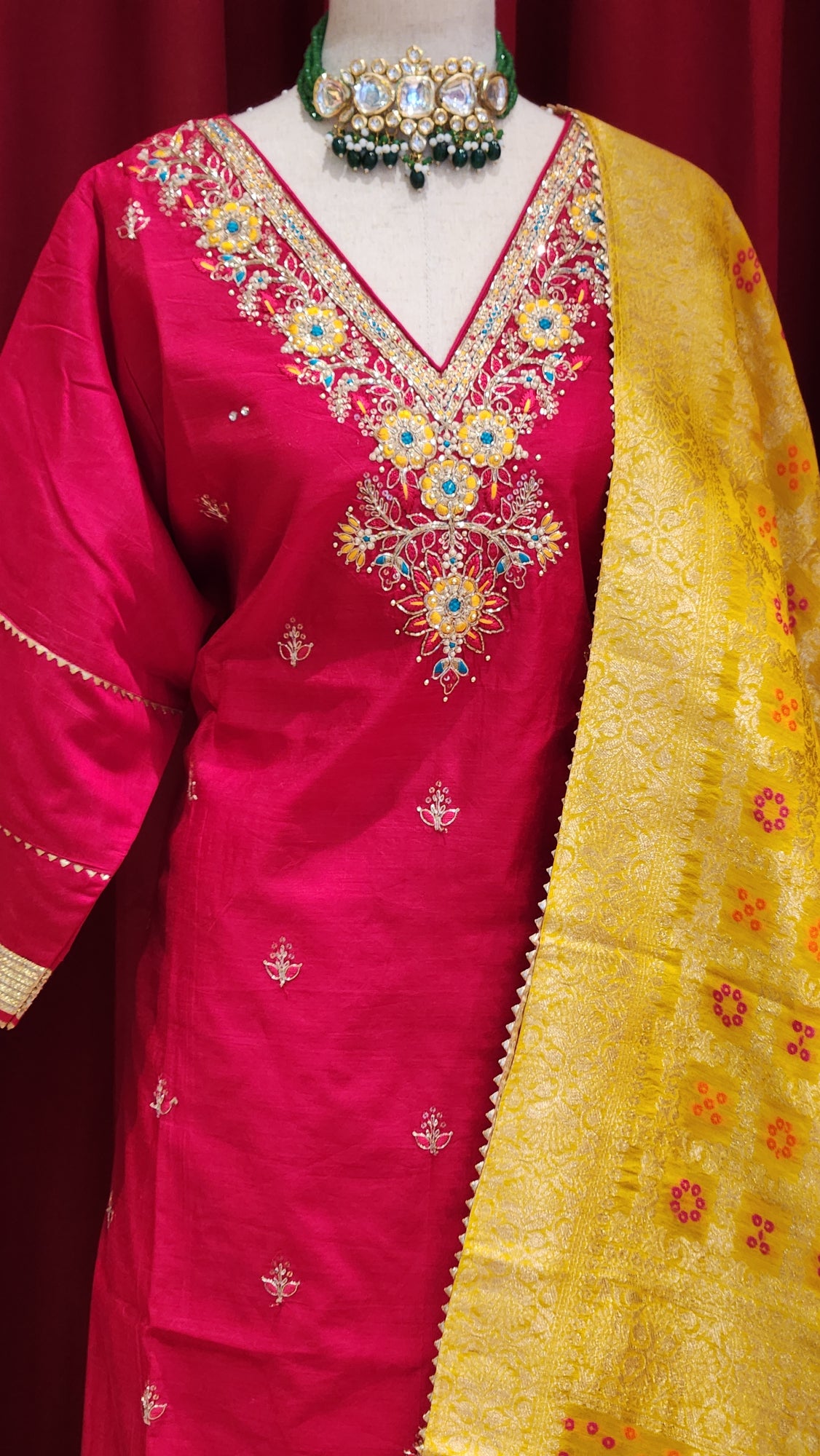Discover effortless elegance with this exquisite cotton kurta set. The kurta features a beautifully detailed hand-embroidered neckline, adding a touch of artisanal charm to the classic design. Made from soft, breathable cotton, it ensures comfort and style for any occasion. Paired with versatile, easy-to-wear pants with an elastic waistband, this set offers a flattering fit and unmatched ease. Complete the look with the coordinating floral shawl, which adds a burst of vibrant color and delicate patterns, perfect for draping over your shoulders or tying as a stylish accent. Whether for a casual day out or a festive gathering, this ensemble combines traditional craftsmanship with contemporary comfort.