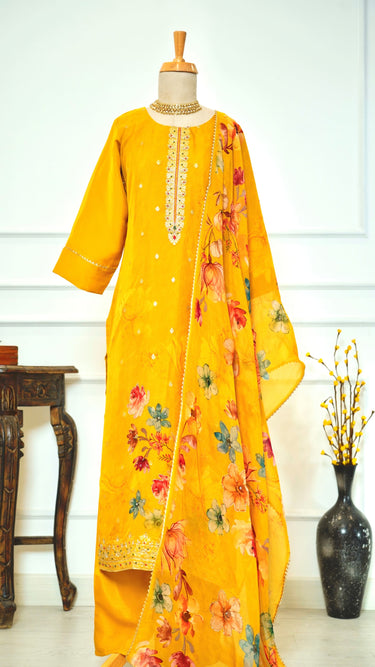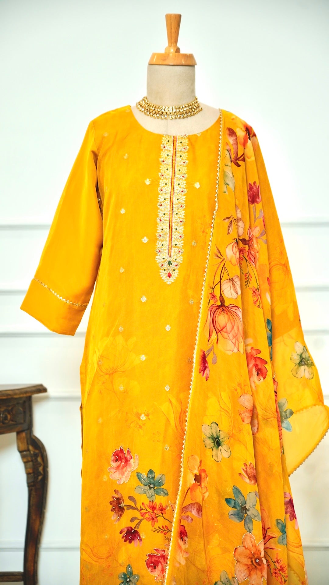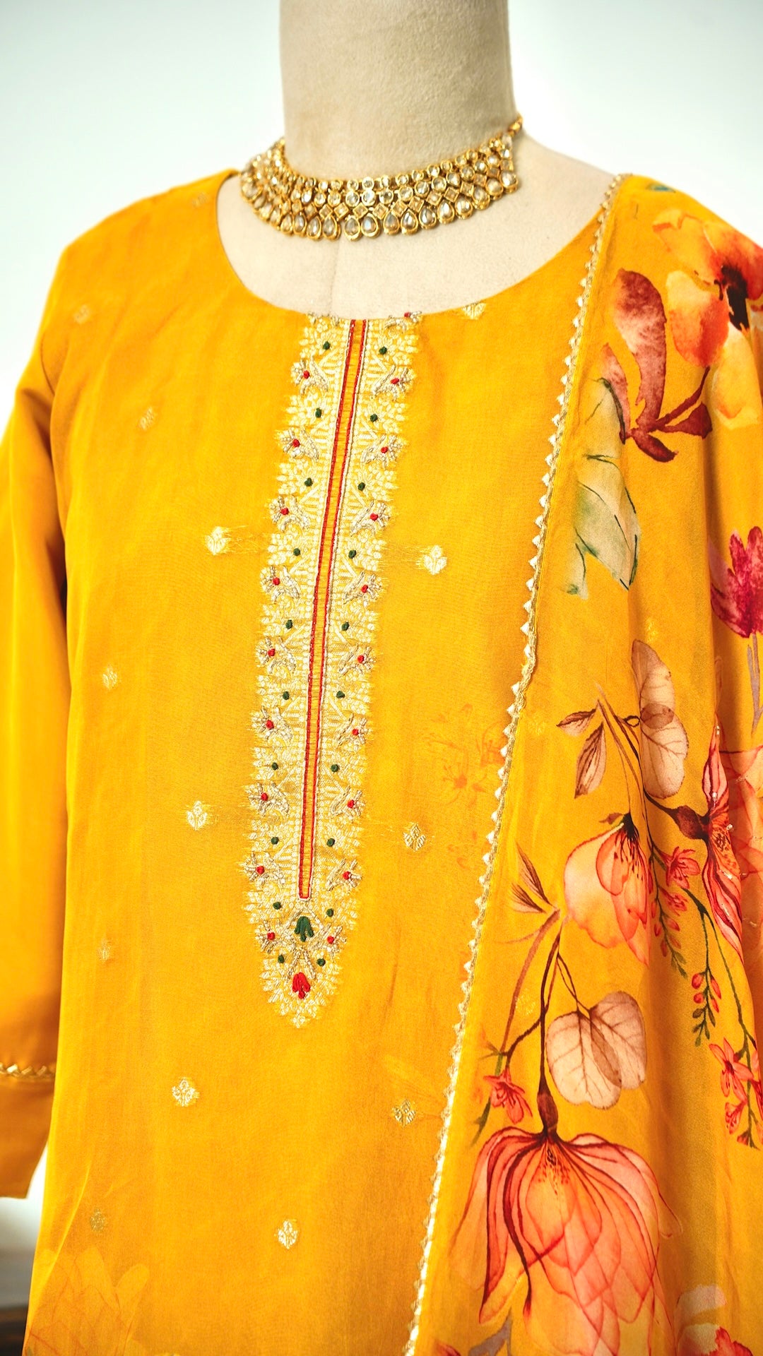 Mustard Yellow Handwork Women's Kurta Set with Floral Shawl