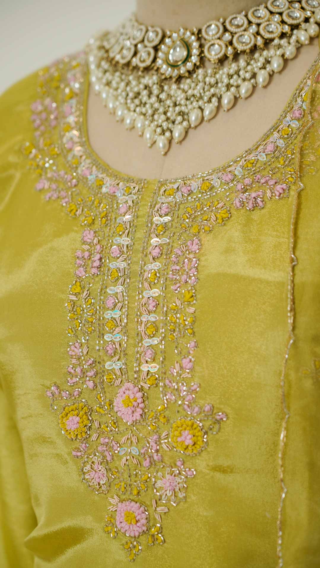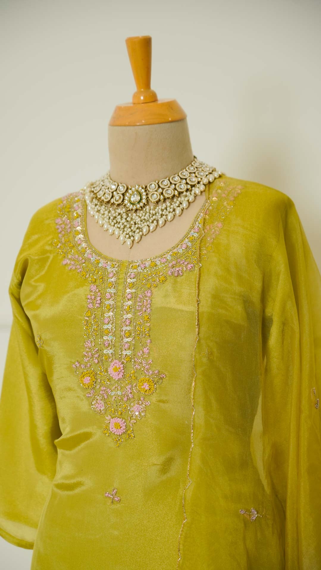Mustard Green Kurti Suit with Hand Embroidered Neckline