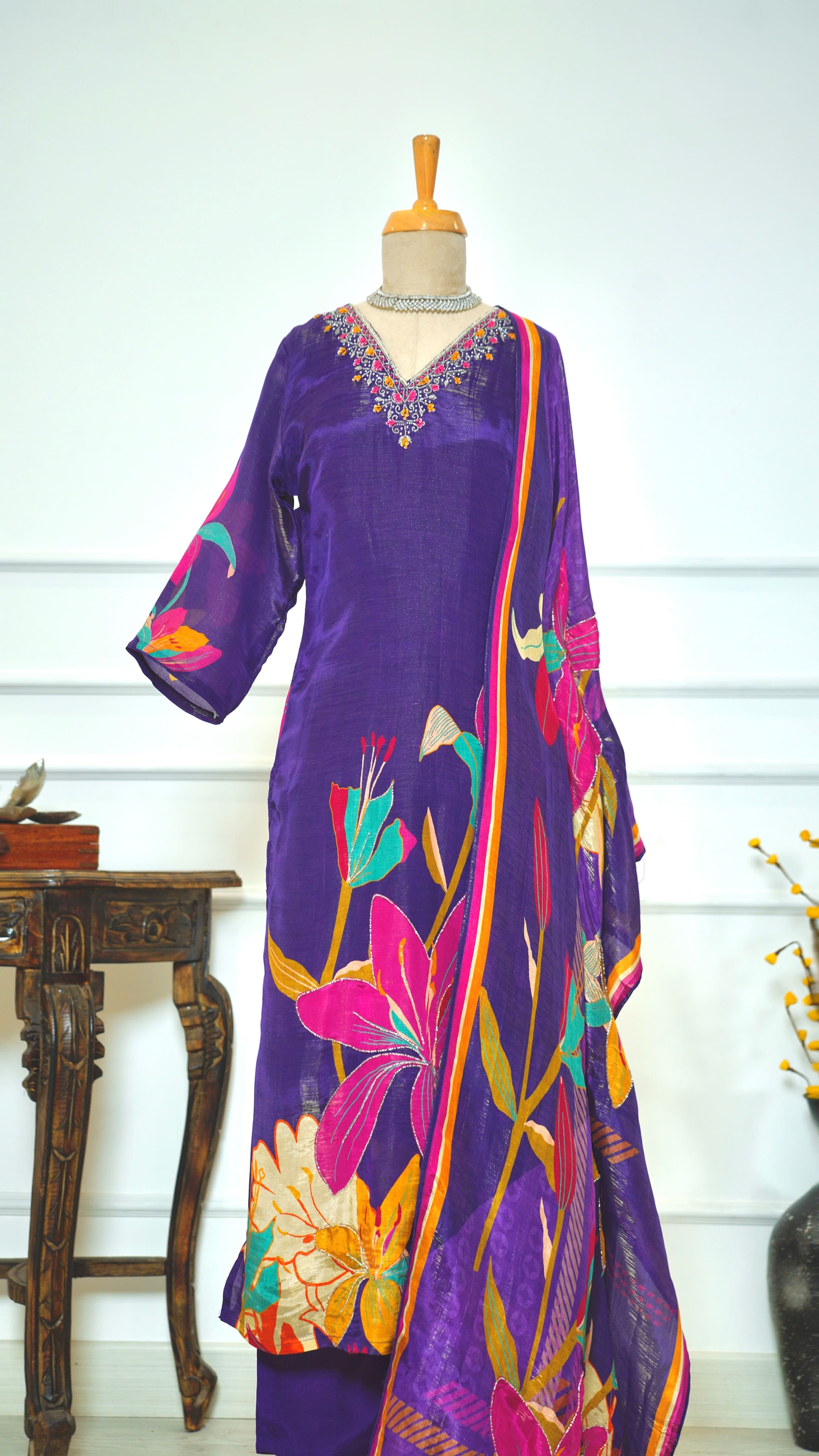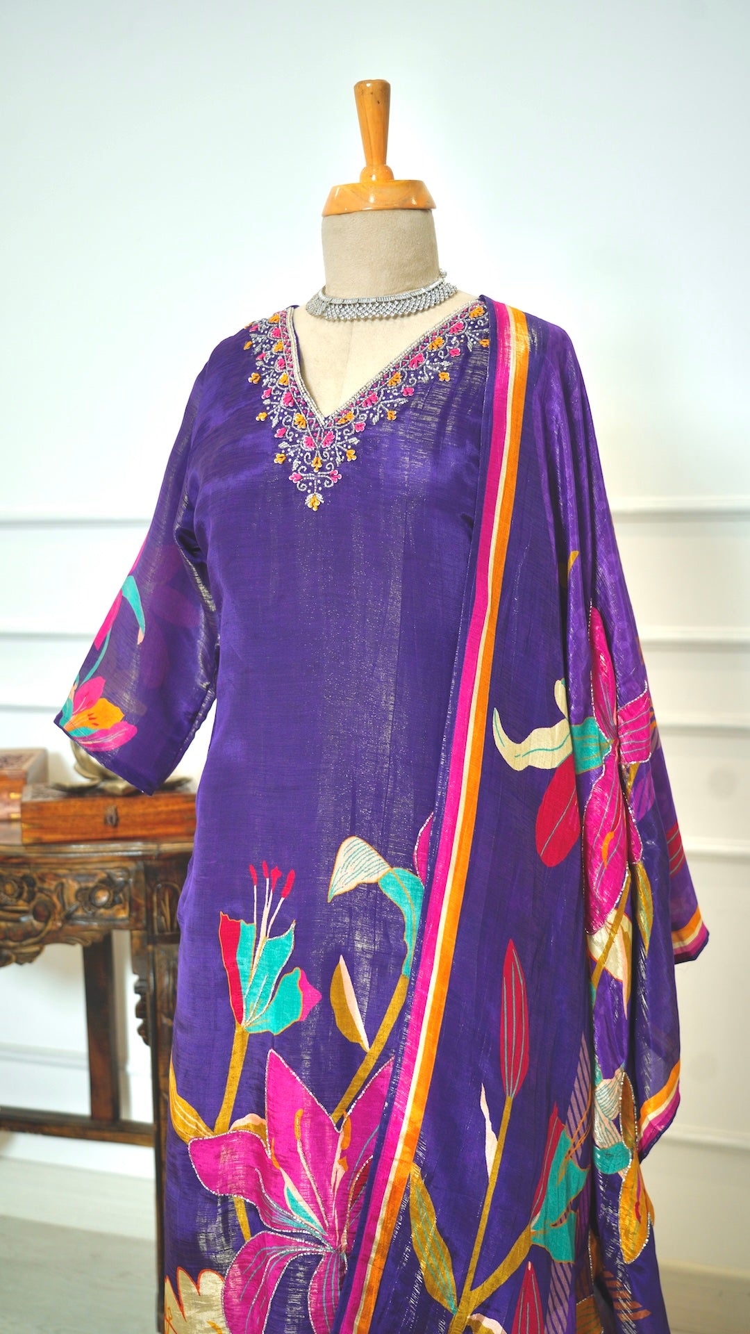 This elegant purple kurta set features a subtle shine that adds a touch of sophistication to your everyday look. Paired with a beautifully patterned floral shawl, it offers both comfort and style for casual outings or relaxed gatherings. Perfect for those who appreciate effortless charm with a splash of color.