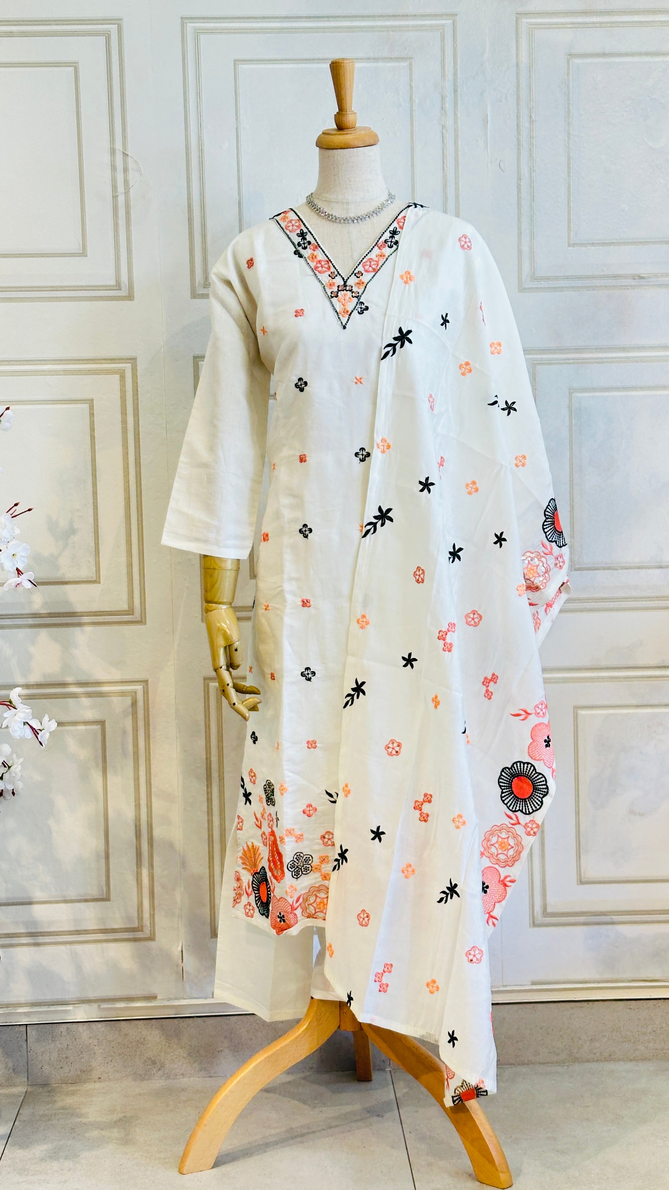 Discover effortless elegance with this exquisite cotton kurta set. The kurta features a beautifully detailed hand-embroidered neckline, adding a touch of artisanal charm to the classic design. Made from soft, breathable cotton, it ensures comfort and style for any occasion. Paired with versatile, easy-to-wear pants with an elastic waistband, this set offers a flattering fit and unmatched ease. Complete the look with the coordinating floral shawl, which adds a burst of vibrant color and delicate patterns, perfect for draping over your shoulders or tying as a stylish accent. Whether for a casual day out or a festive gathering, this ensemble combines traditional craftsmanship with contemporary comfort.