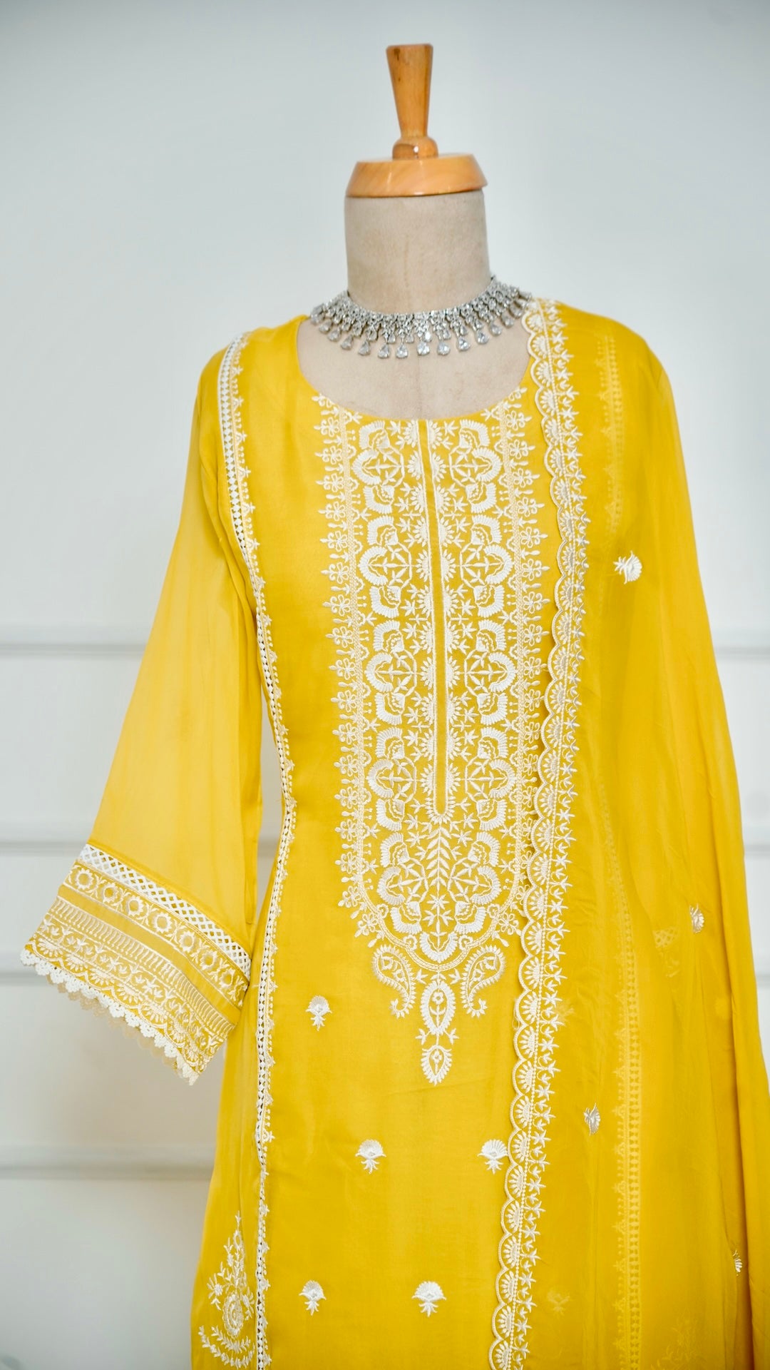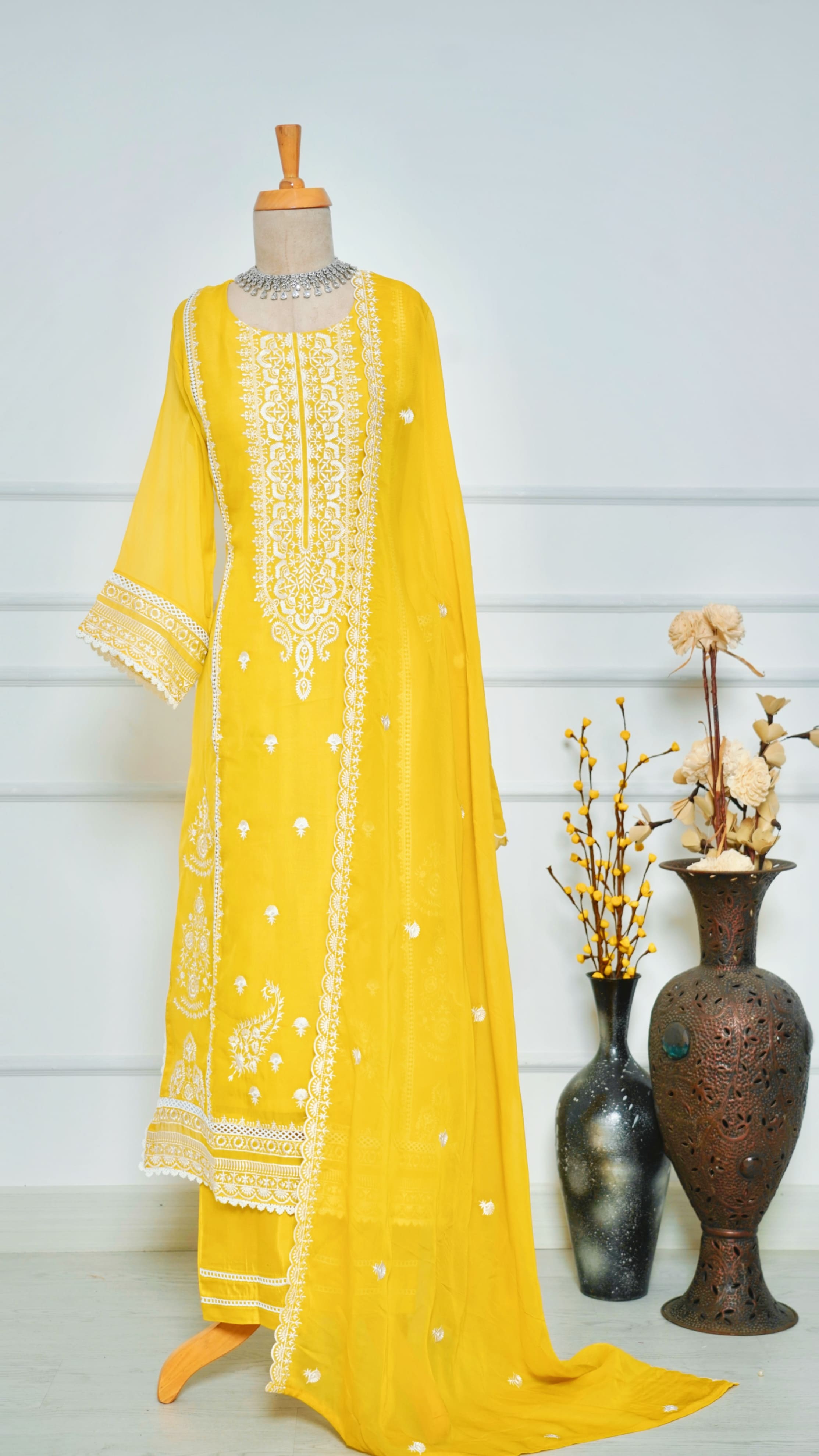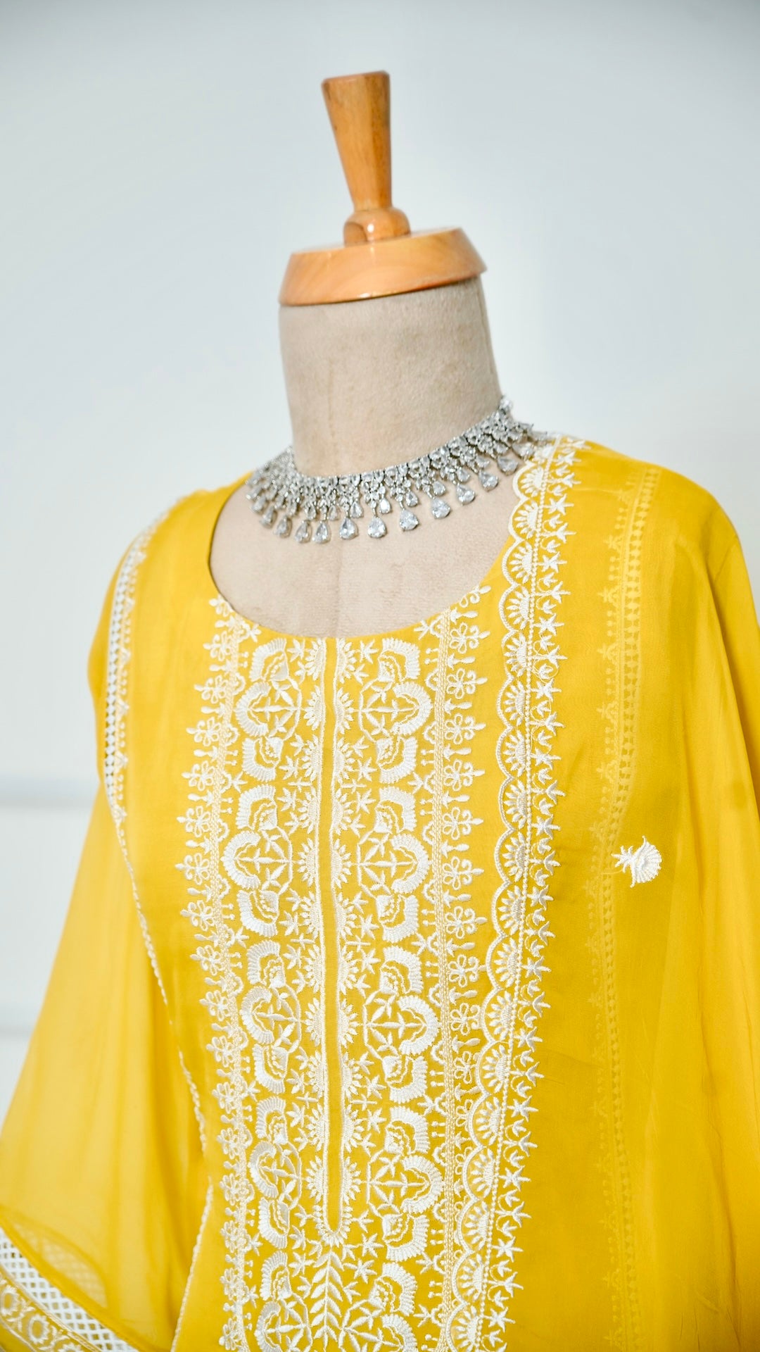 Brighten your casual wardrobe with this lemon-colored women's kurta set featuring delicate threadwork. Its vibrant hue and intricate detailing offer a fresh, stylish look while ensuring comfort throughout the day. Ideal for relaxed occasions, this set combines traditional craftsmanship with everyday ease.
