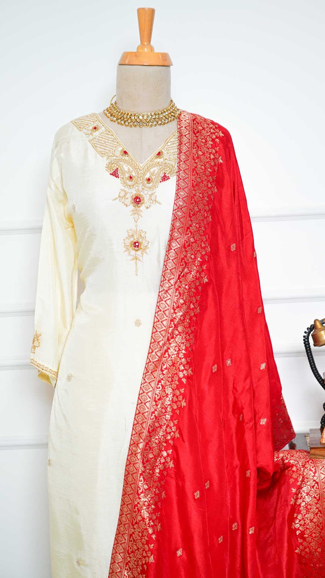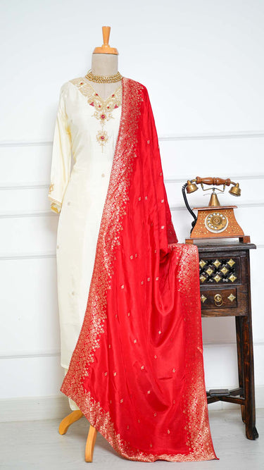 White Paisley Handwork Kurta with Red Contrast Shawl