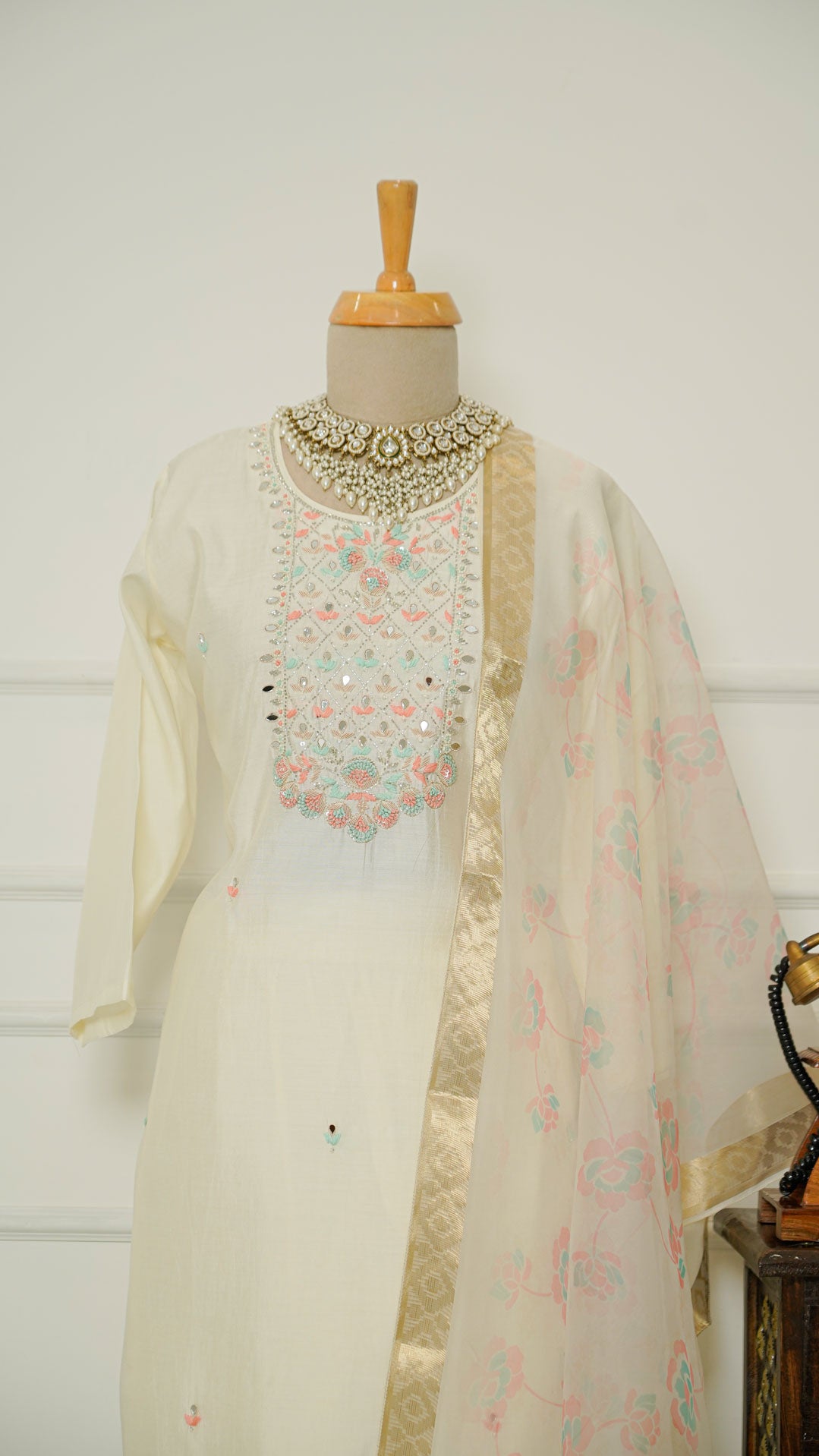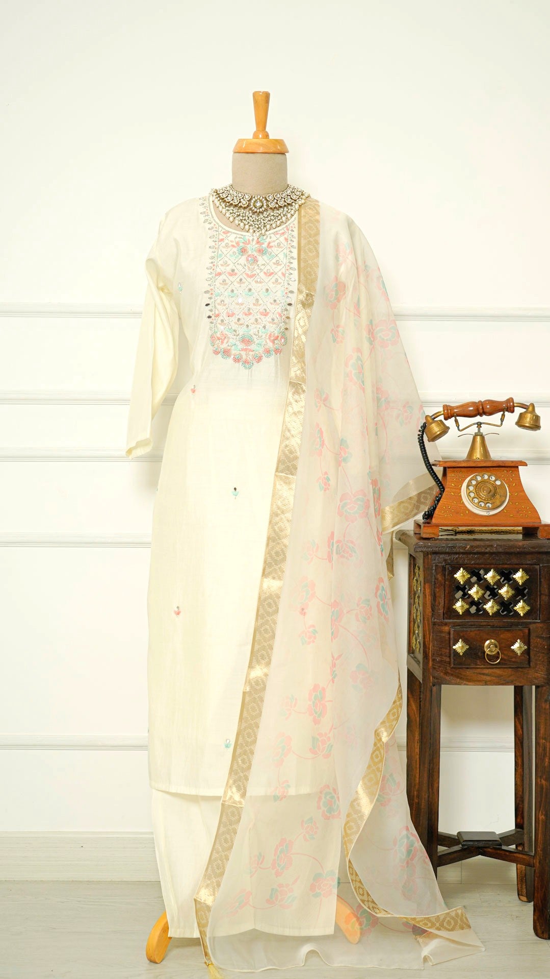 This kurta set features delicate handwork that adds a touch of elegance to your everyday look. Paired with a rich Banarasi shawl, it offers both comfort and style, perfect for casual outings or relaxed gatherings. The combination brings a subtle yet sophisticated charm to your wardrobe.