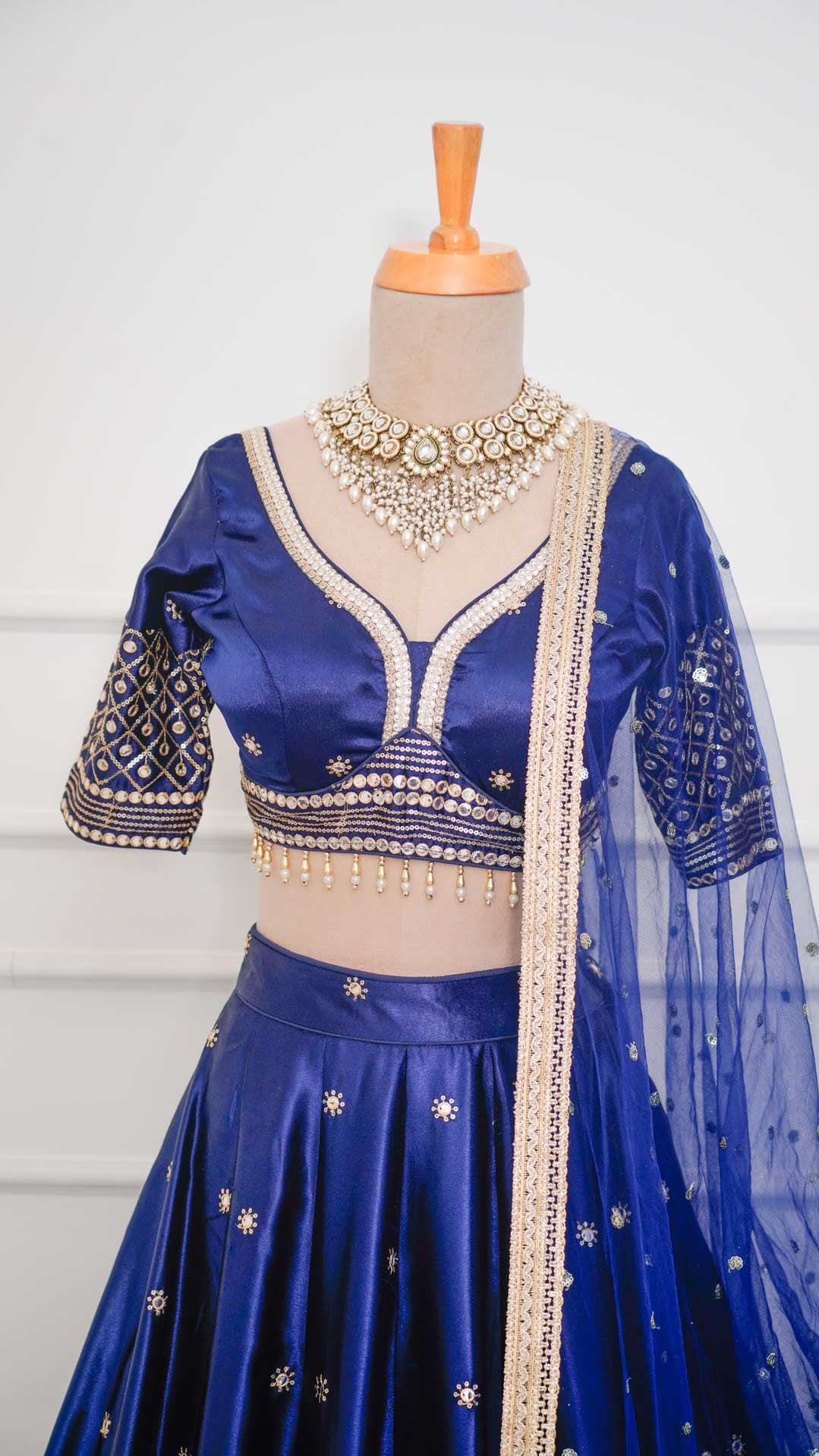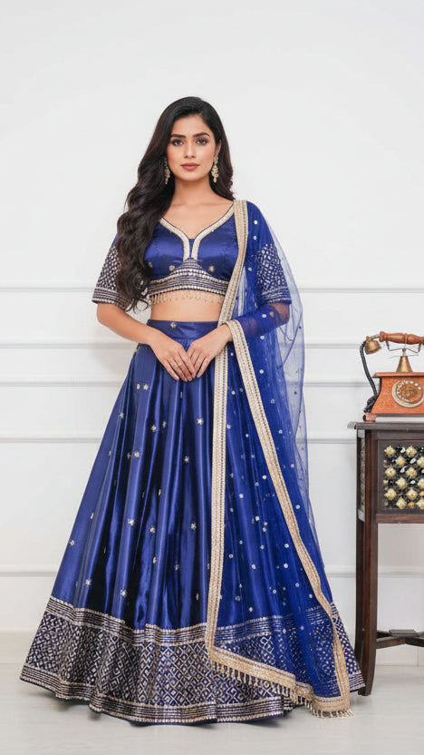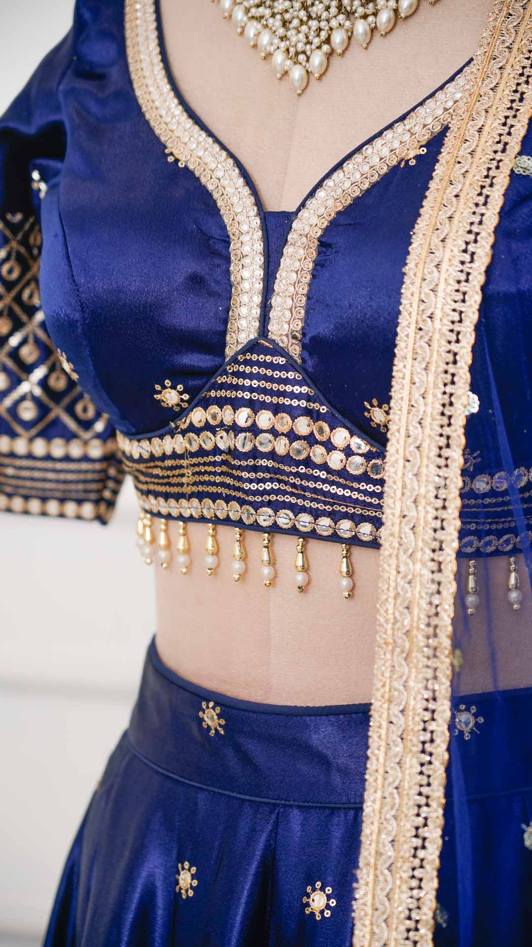 Step into the spotlight with this exquisite lehenga, designed to turn heads at every celebration. Crafted from satin fabric, this lehenga features intricate thread embroidery and delicate mirror embellishments that shimmer with every move. The voluminous flare adds dramatic grace, while the semi-sheer dupatta and embellished blouse bring a perfect blend of tradition and modern charm.