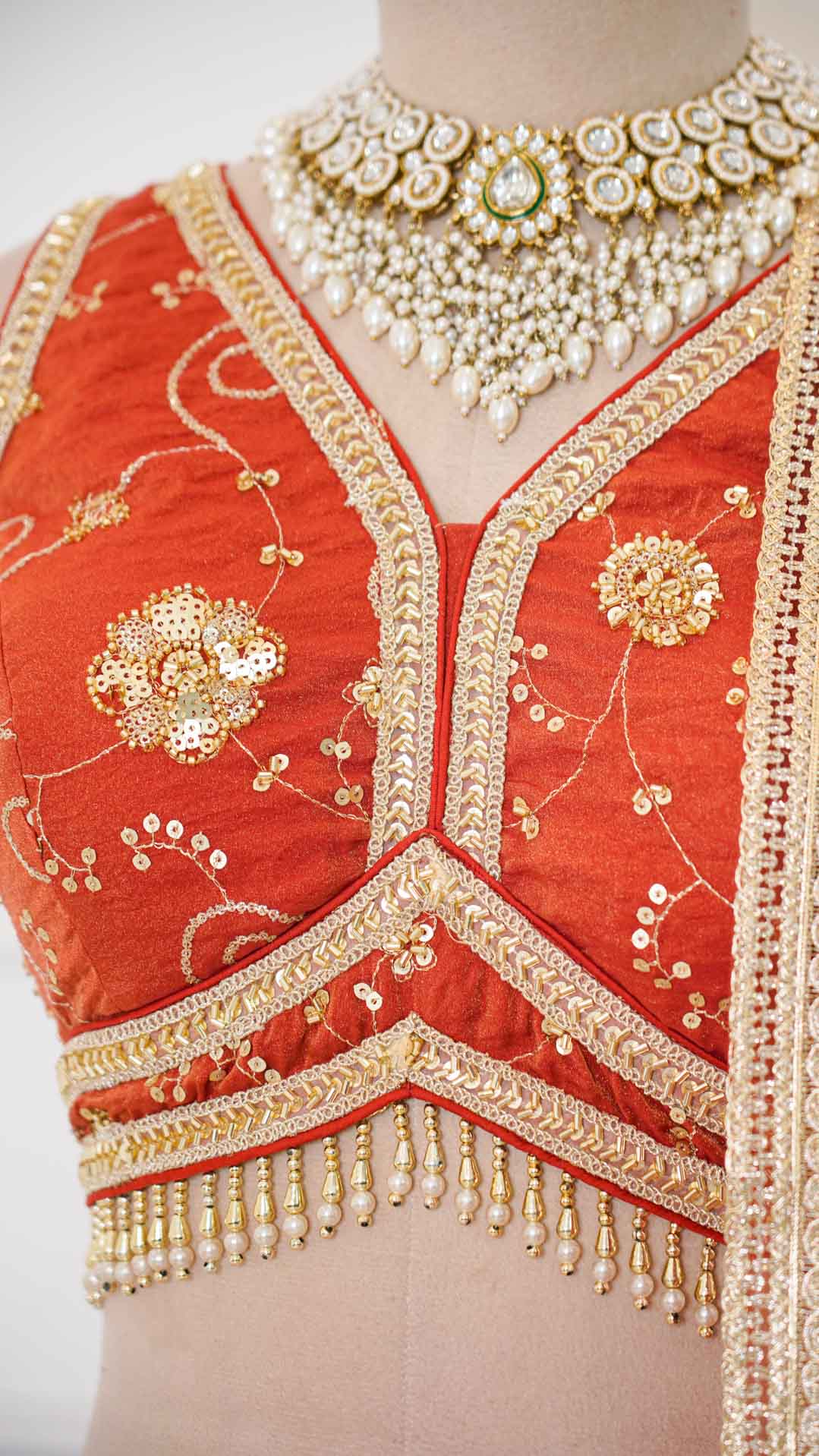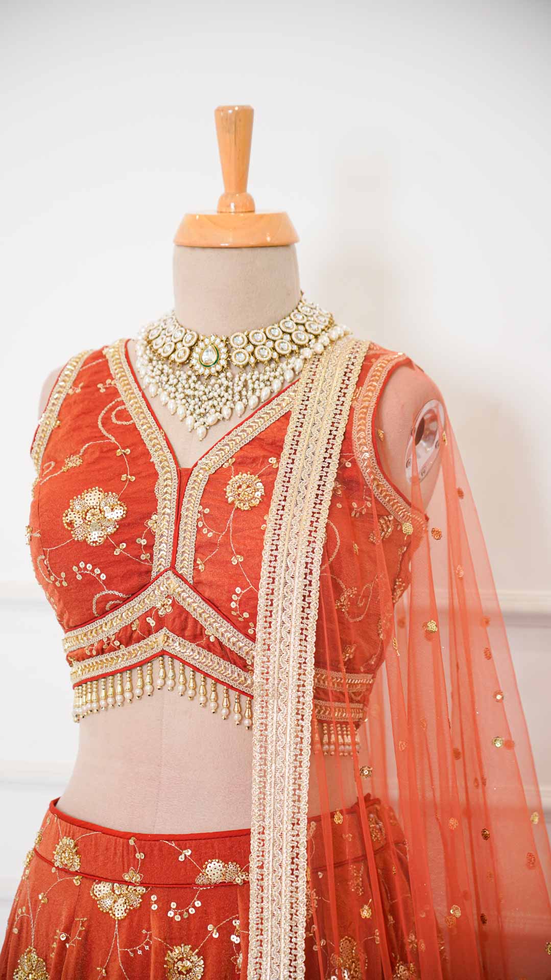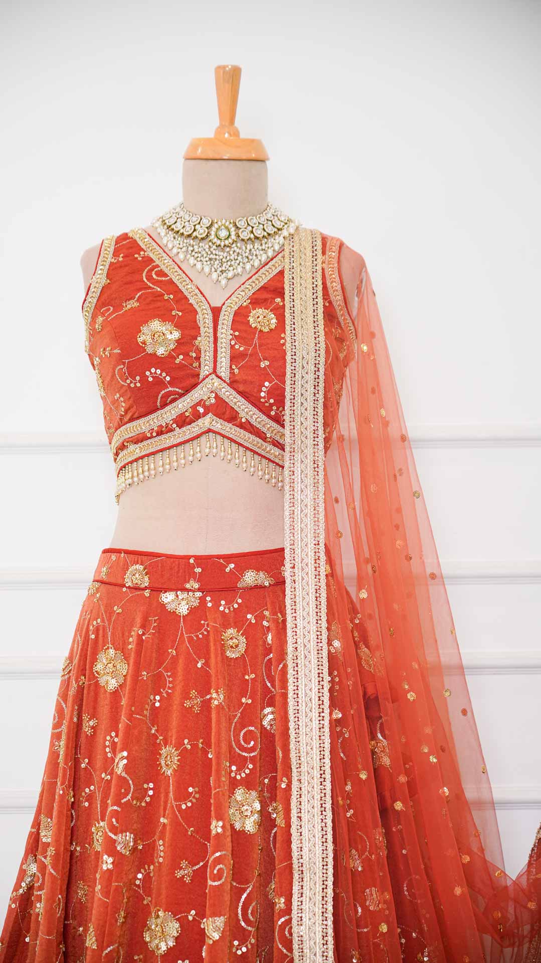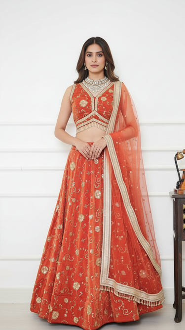 The blouse is designed to complement the lehenga flawlessly, with delicate back tie tassels that add a hint of charm. It includes padded cups for support and comfort, along with extra fabric for easy resizing to achieve a perfect fit. The ensemble is finished with a lightweight dupatta featuring a finely embroidered border, bringing the entire look together with grace. Perfect for weddings, receptions, or festive occasions, this lehenga set blends modern sophistication with timeless beauty.