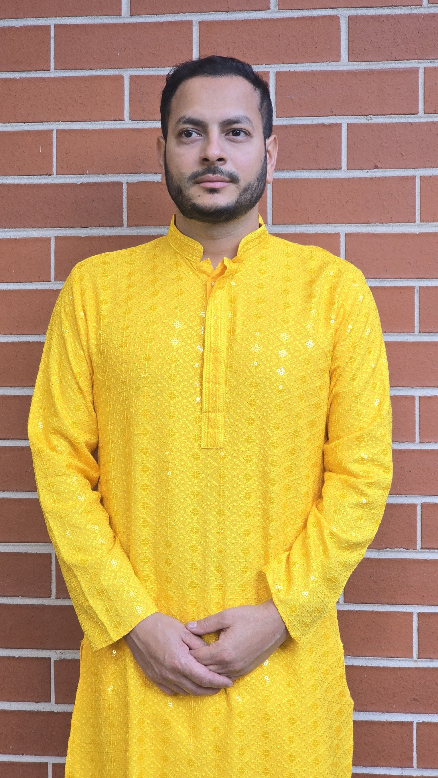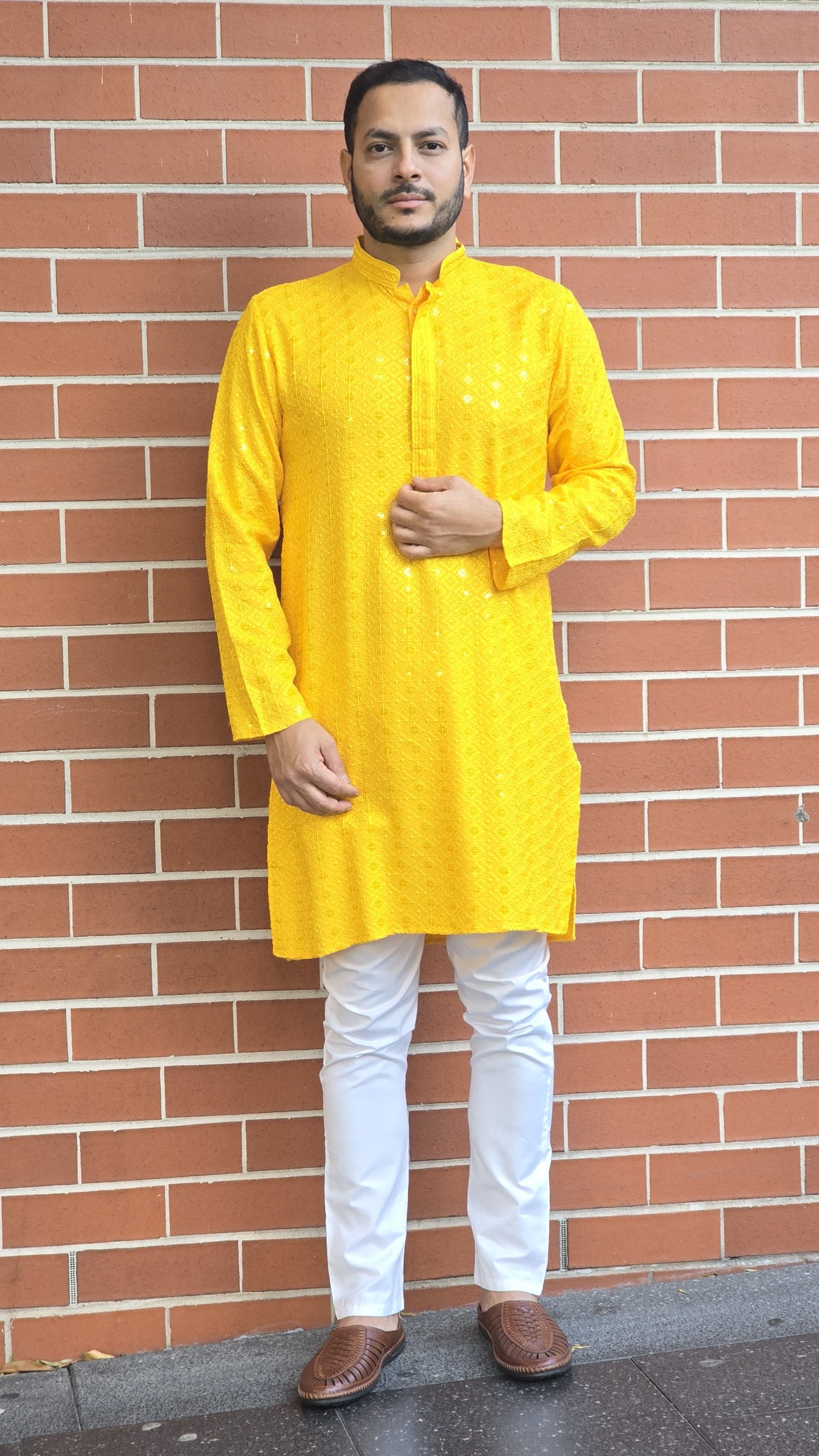 This exquisite Rayon Men's Kurta seamlessly blends traditional craftsmanship with modern design. Crafted from soft, breathable rayon, it ensures both comfort and style. The highlight of this kurta is the intricate Chikankari threadwork, a timeless hand-embroidery technique that adds delicate beauty and texture to the fabric. Enhanced with subtle sequin embroidery, it brings a touch of sparkle and sophistication to the overall design. The kurta features a mandarin collar with a button placket for a sharp, contemporary look, while the side pockets add both practicality and style. Perfect for festive occasions or any special gathering, this kurta offers a refined yet relaxed look with a nod to heritage.