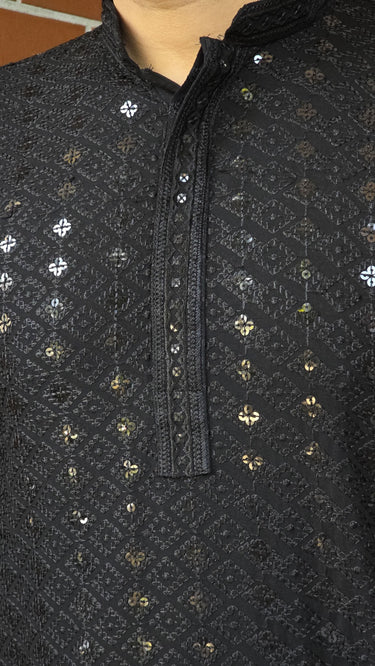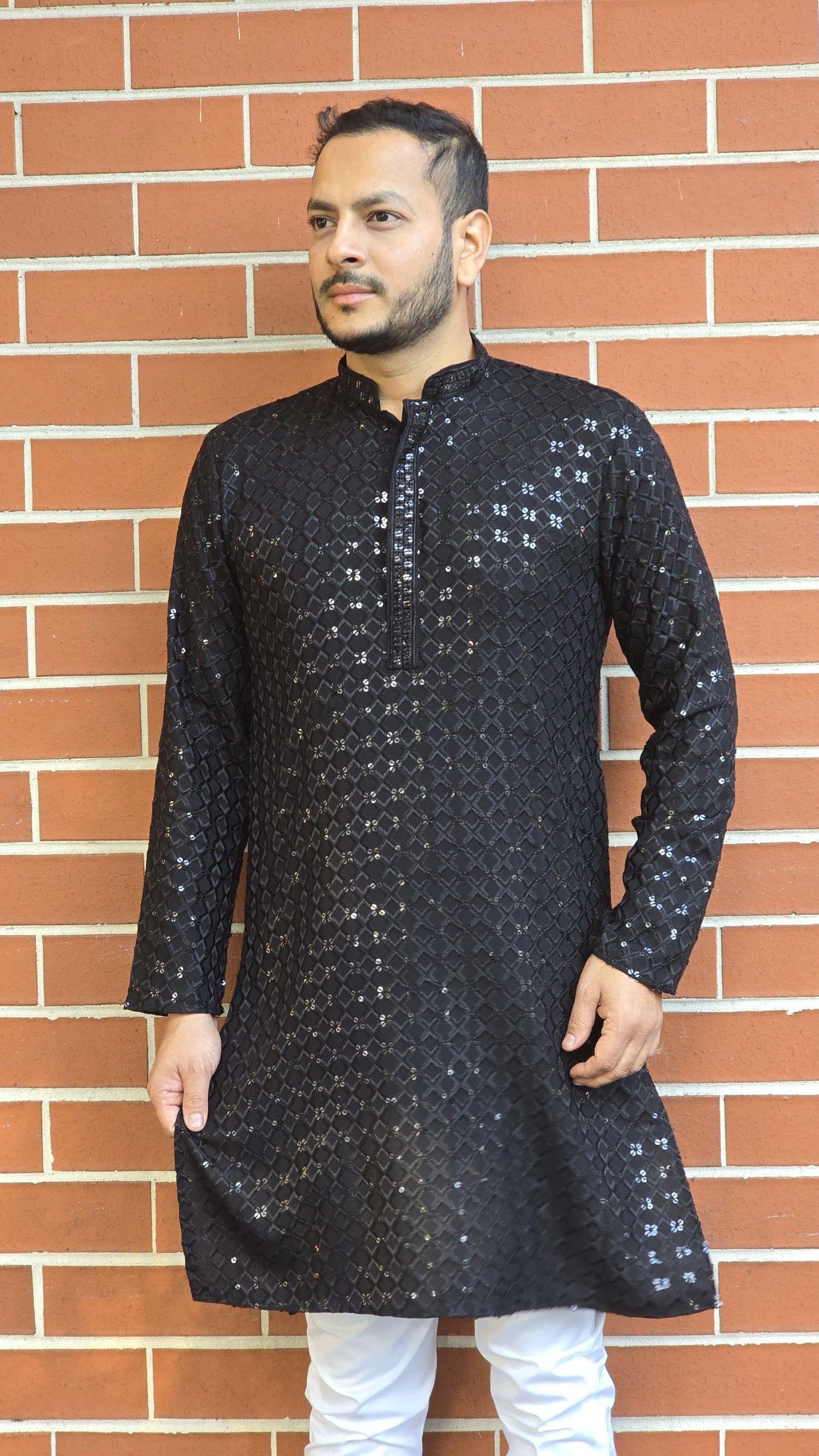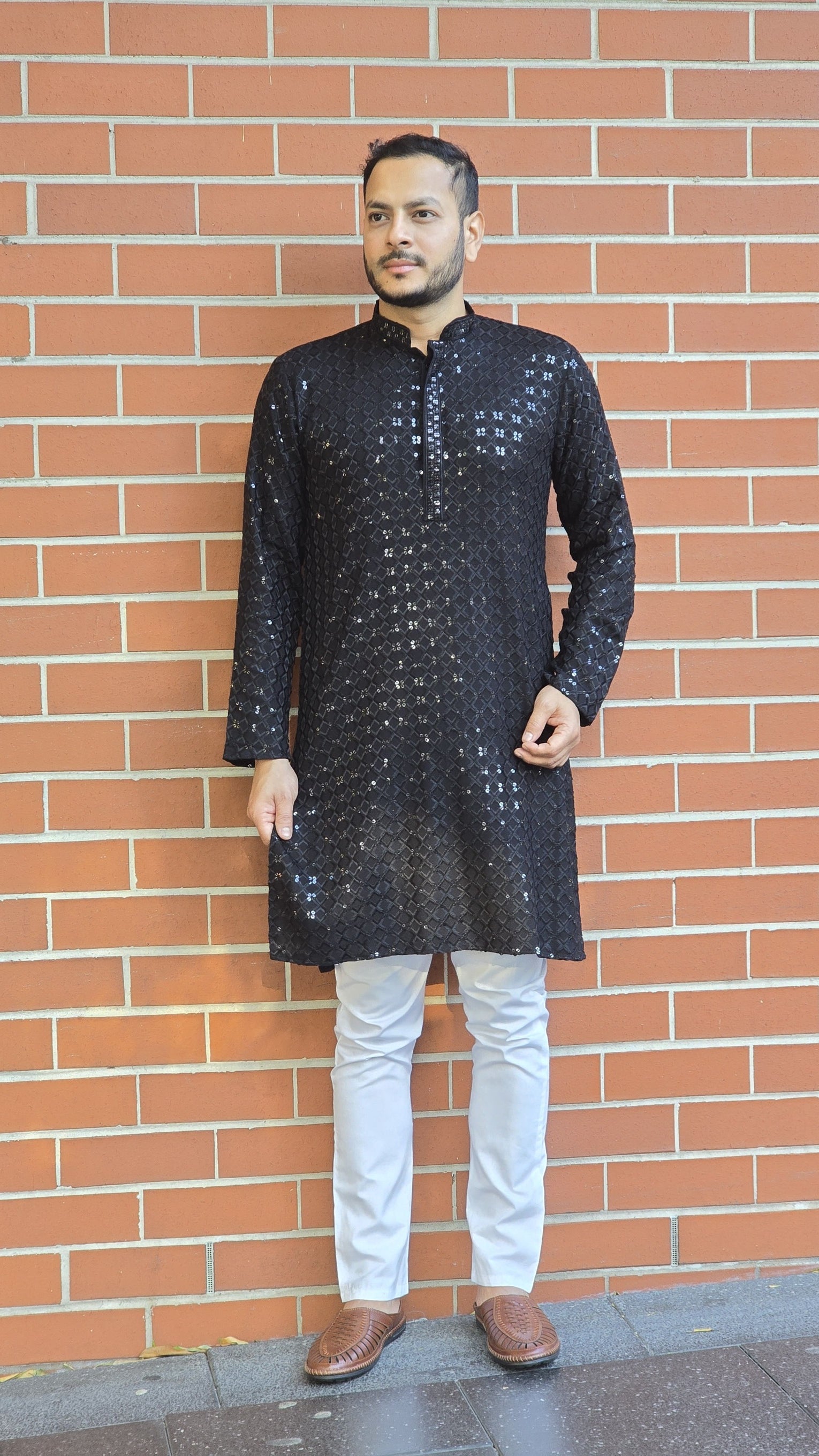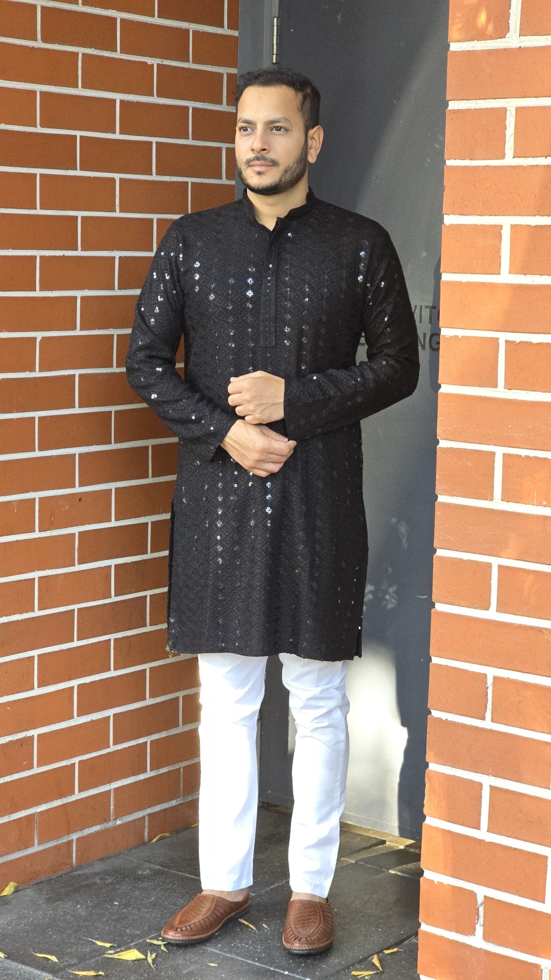 This exquisite Rayon Men's Kurta seamlessly blends traditional craftsmanship with modern design. Crafted from soft, breathable rayon, it ensures both comfort and style. The highlight of this kurta is the intricate Chikankari threadwork, a timeless hand-embroidery technique that adds delicate beauty and texture to the fabric. Enhanced with subtle sequin embroidery, it brings a touch of sparkle and sophistication to the overall design. The kurta features a mandarin collar with a button placket for a sharp, contemporary look, while the side pockets add both practicality and style. Perfect for festive occasions or any special gathering, this kurta offers a refined yet relaxed look with a nod to heritage.