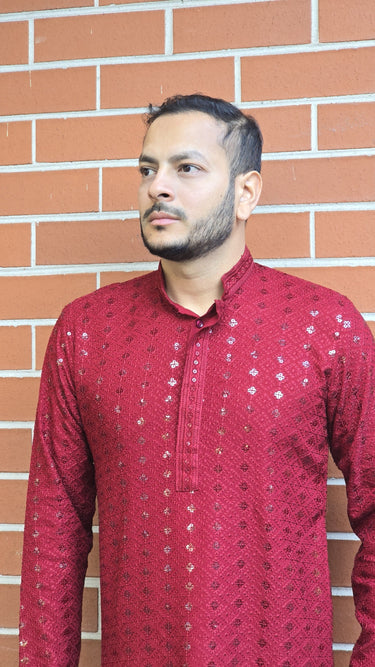 This exquisite Rayon Men's Kurta seamlessly blends traditional craftsmanship with modern design. Crafted from soft, breathable rayon, it ensures both comfort and style. The highlight of this kurta is the intricate Chikankari threadwork, a timeless hand-embroidery technique that adds delicate beauty and texture to the fabric. Enhanced with subtle sequin embroidery, it brings a touch of sparkle and sophistication to the overall design. The kurta features a mandarin collar with a button placket for a sharp, contemporary look, while the side pockets add both practicality and style. Perfect for festive occasions or any special gathering, this kurta offers a refined yet relaxed look with a nod to heritage.