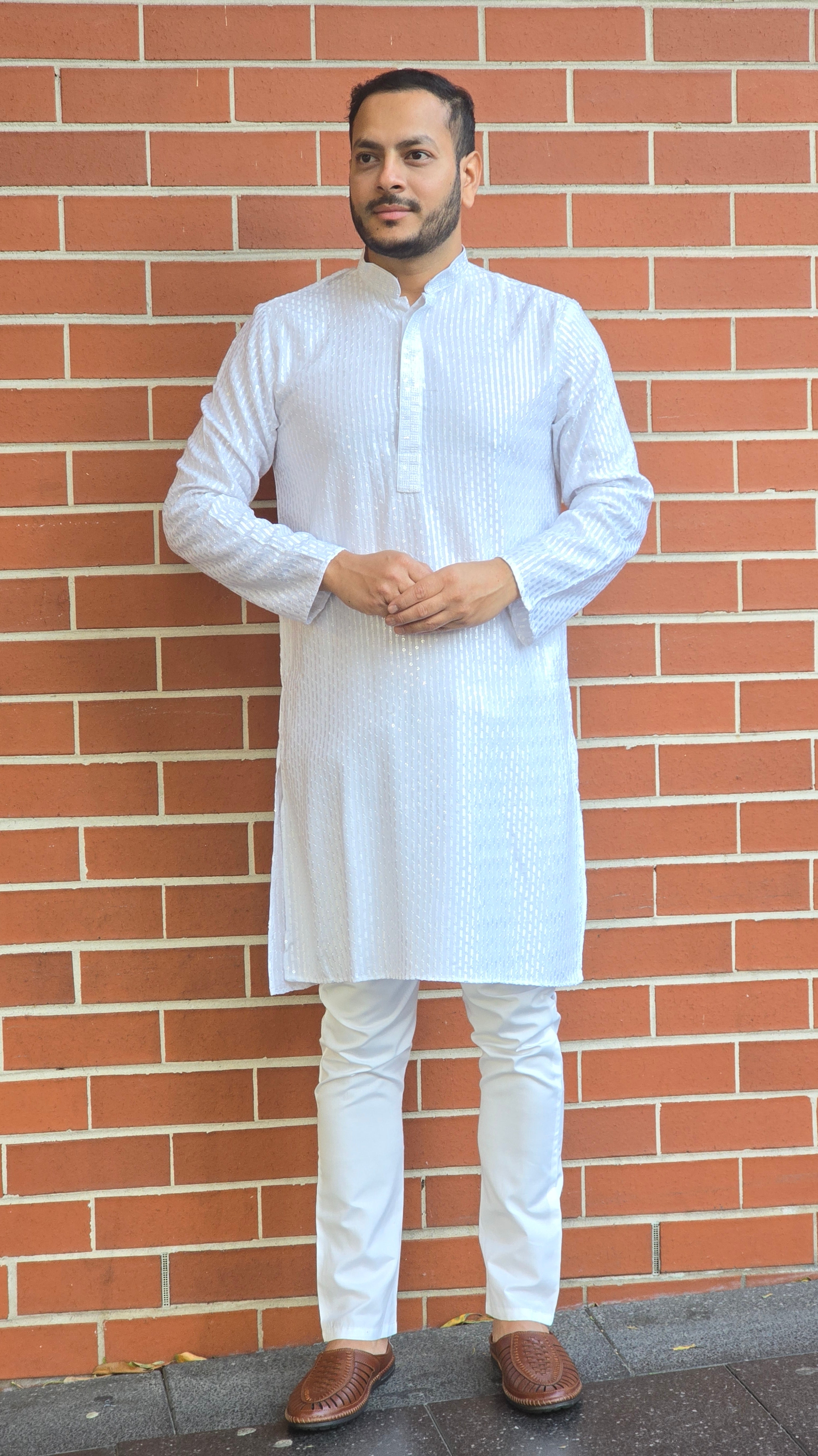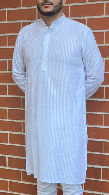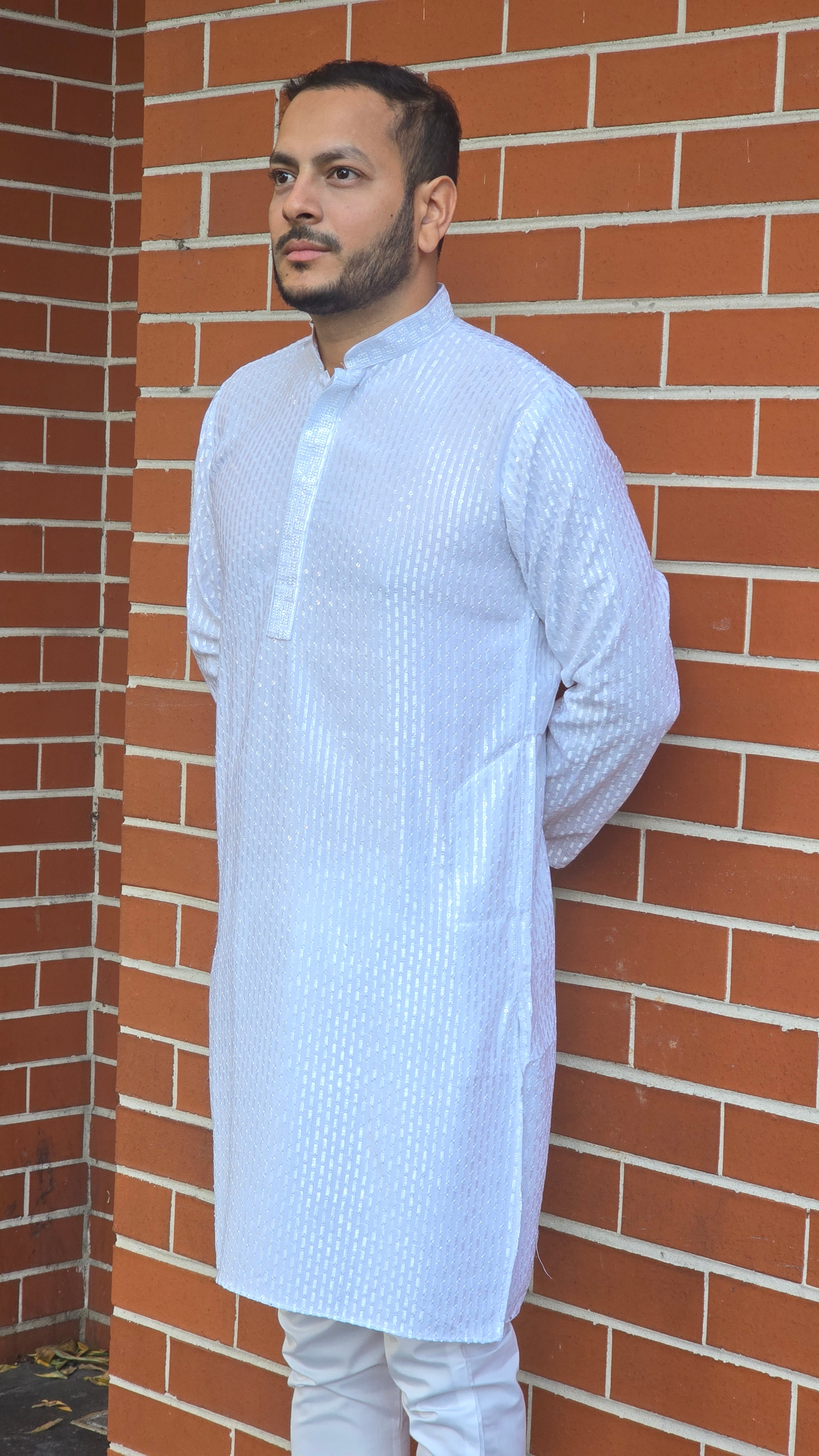 Discover the elegance of our Lucknowi Chikankari Men's Kurta, made from luxurious pure rayon fabric. Adorned with heavy 8mm sequin embroidery, this kurta sparkles like no other, blending traditional craftsmanship with modern style. The breathable fabric drapes beautifully, offering both comfort and a flattering fit. Perfect for festive occasions or casual outings, this versatile piece is a must-have for any stylish man's wardrobe.