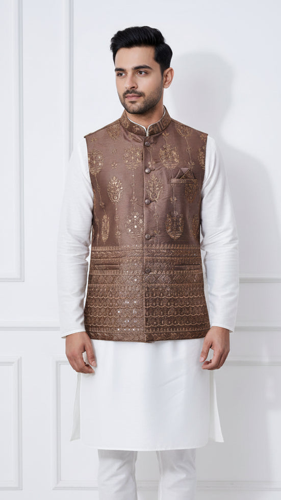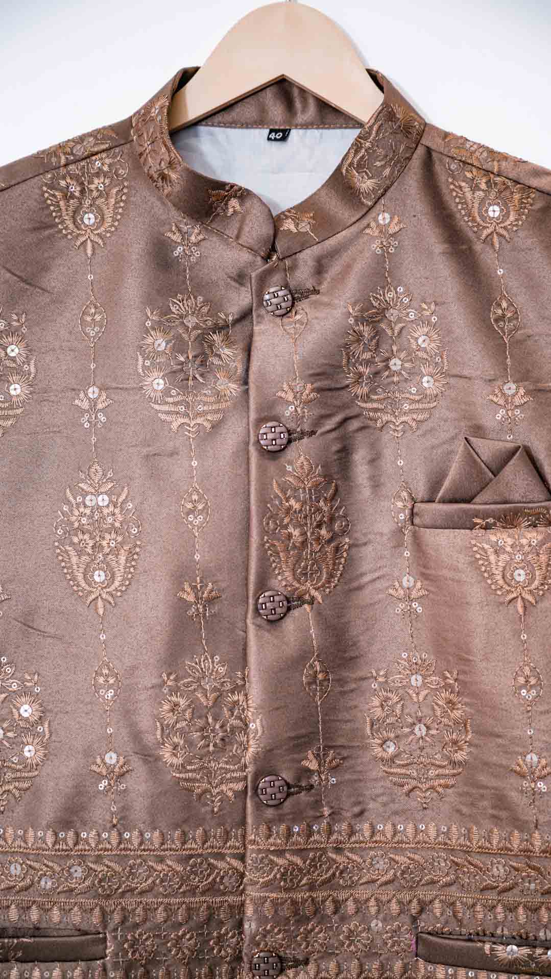 Impeccably tailored Nehru Jacket also known as Modi coat features a stand-up collar and intricate buttons. Exquisite zari and sequin embroidery elevates this piece to stand out. Perfect for weddings, cultural events, or formal occasions. Pair with a kurta or modern separates.