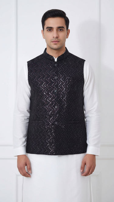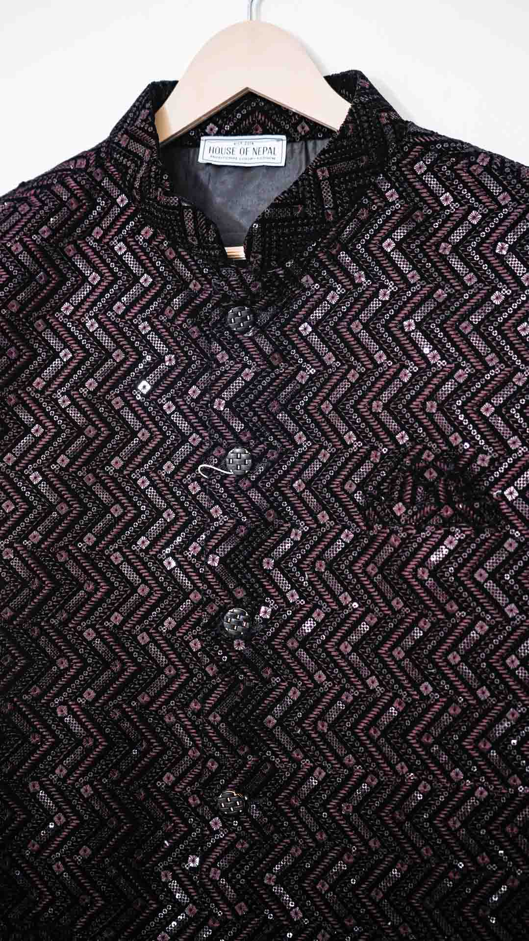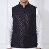 Impeccably tailored Nehru Jacket features a stand-up collar and intricate buttons. Exquisite zari and sequin embroidery elevates this piece to stand out. Perfect for weddings, cultural events, or formal occasions. Pair with a kurta or modern separates.