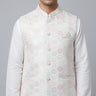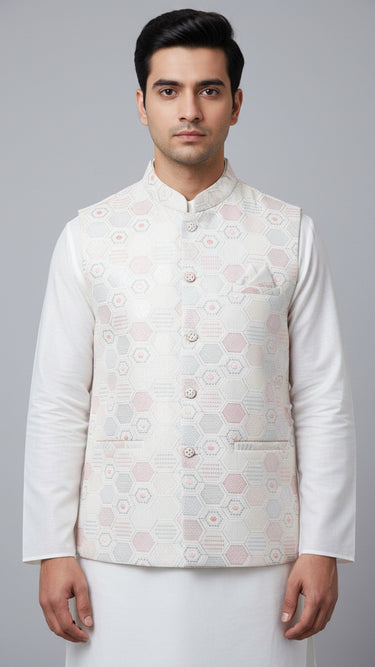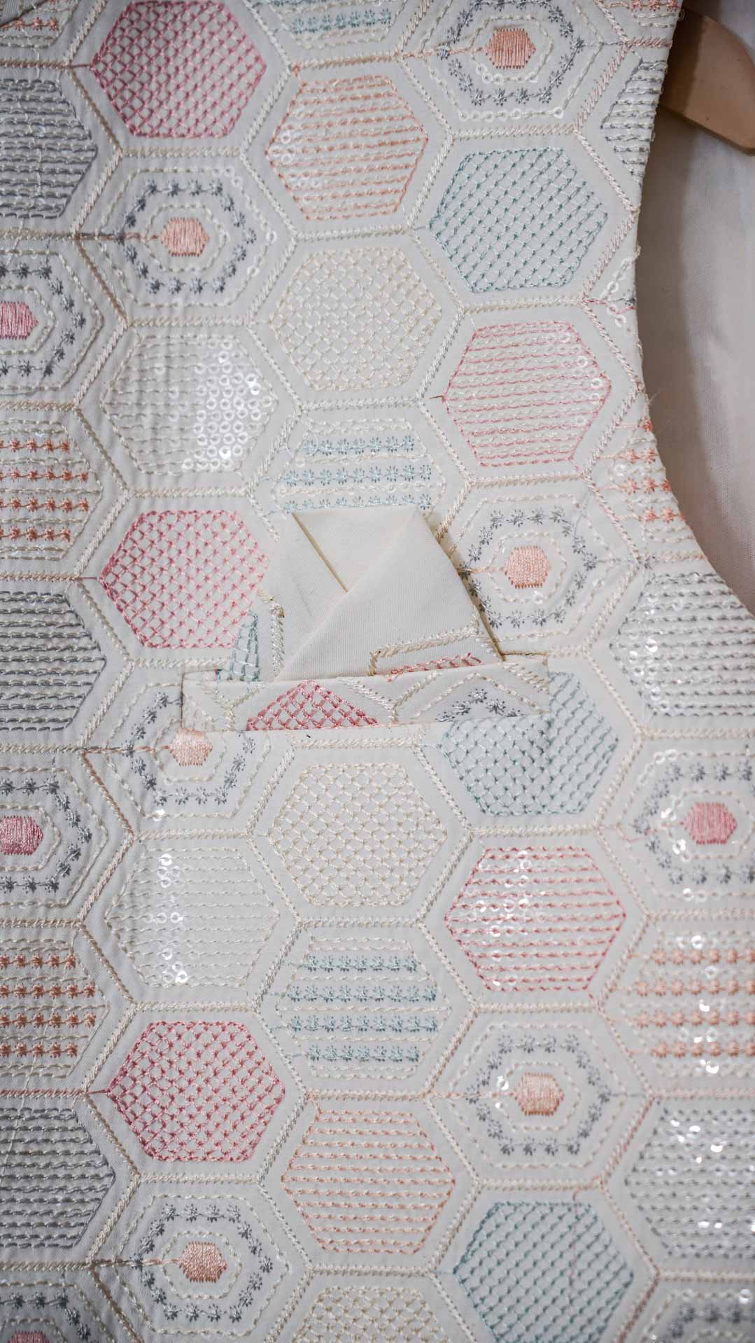 Impeccably tailored Nehru Jacket features a stand-up collar and intricate buttons. Exquisite zari and sequin embroidery elevates this piece to stand out. Perfect for weddings, cultural events, or formal occasions. Pair with a kurta or modern separates.