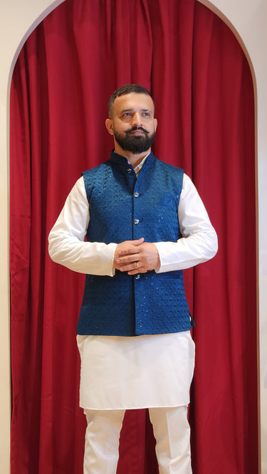 Impeccably tailored Nehru Jacket features a stand-up collar and intricate buttons. Luxurious Malai Silk Resham elevates this piece to stand out. Perfect for weddings, cultural events, or formal occasions. Pair with a kurta or modern separates.