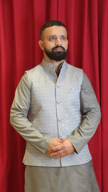 Impeccably tailored Nehru Jacket features a stand-up collar and intricate buttons. Luxurious Malai Silk Resham elevates this piece to stand out. Perfect for weddings, cultural events, or formal occasions. Pair with a kurta or modern separates.