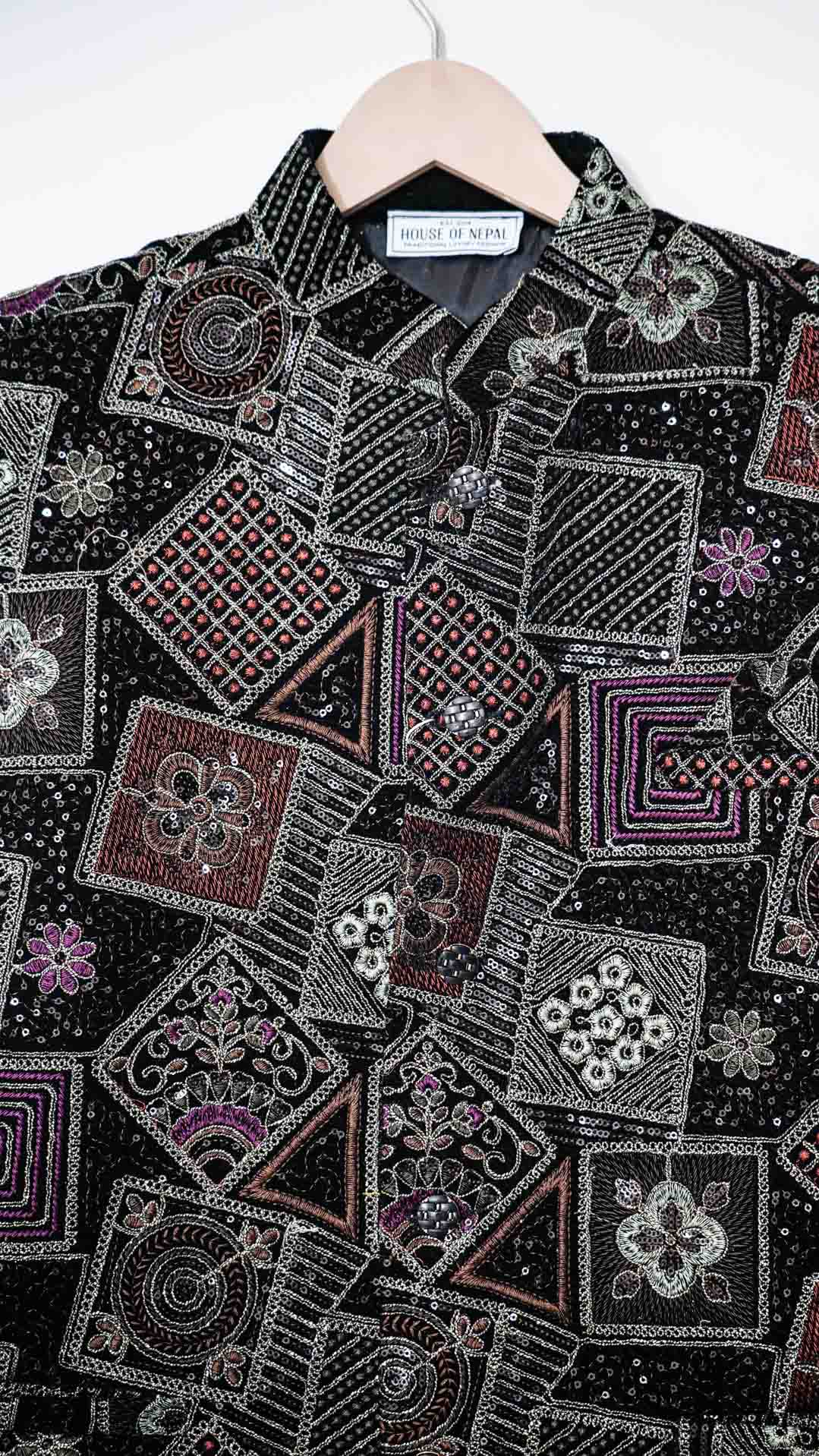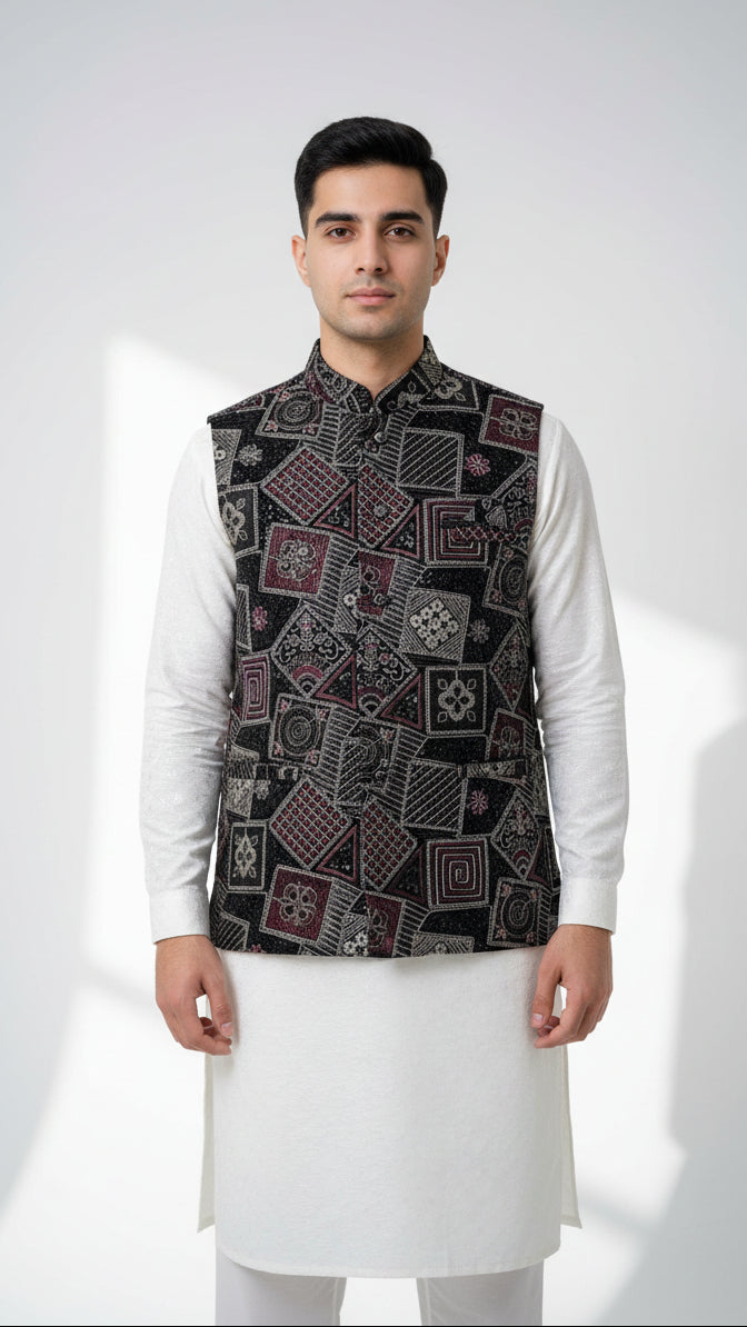 Impeccably tailored Nehru Jacket also known as Modi coat features a stand-up collar and intricate buttons. Exquisite zari and sequin embroidery elevates this piece to stand out. Perfect for weddings, cultural events, or formal occasions. Pair with a kurta or modern separates.