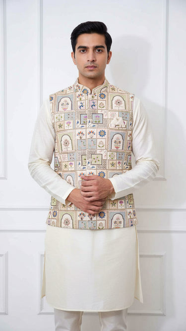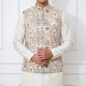 Impeccably tailored Nehru Jacket also known as Modi coat features a stand-up collar and intricate buttons. Exquisite zari and sequin embroidery elevates this piece to stand out. Perfect for weddings, cultural events, or formal occasions. Pair with a kurta or modern separates.