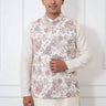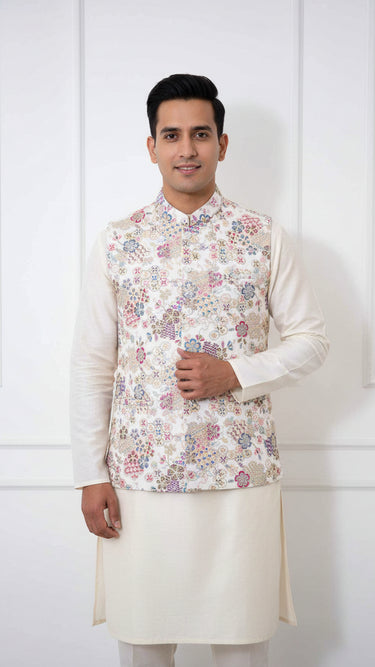 Elevate your wardrobe with this stunning Pastel Floral Nehru Jacket, crafted from luxurious jacquard silk. The cream base features delicate pastel flowers, complemented by intricate zari and sequin embroidery that catches the light beautifully. This button-up style combines traditional craftsmanship with contemporary flair, complete with stylish buttons, functional side pockets, and a coordinating pocket square. Perfect for layering over traditional wear or pairing with modern pieces for an effortlessly sophisticated look.