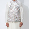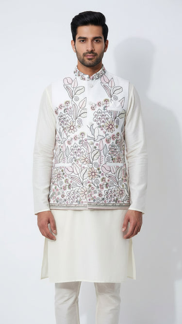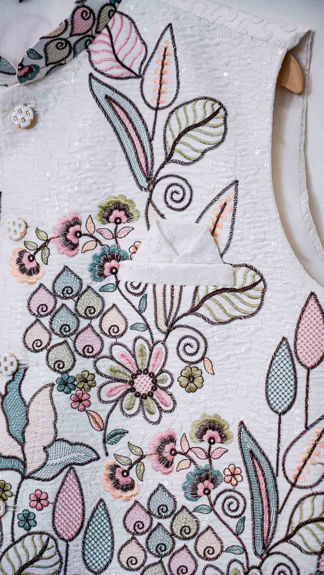 Impeccably tailored Nehru Jacket features a stand-up collar and intricate buttons. Exquisite zari and sequin embroidery elevates this piece to stand out. Perfect for weddings, cultural events, or formal occasions. Pair with a kurta or modern separates.