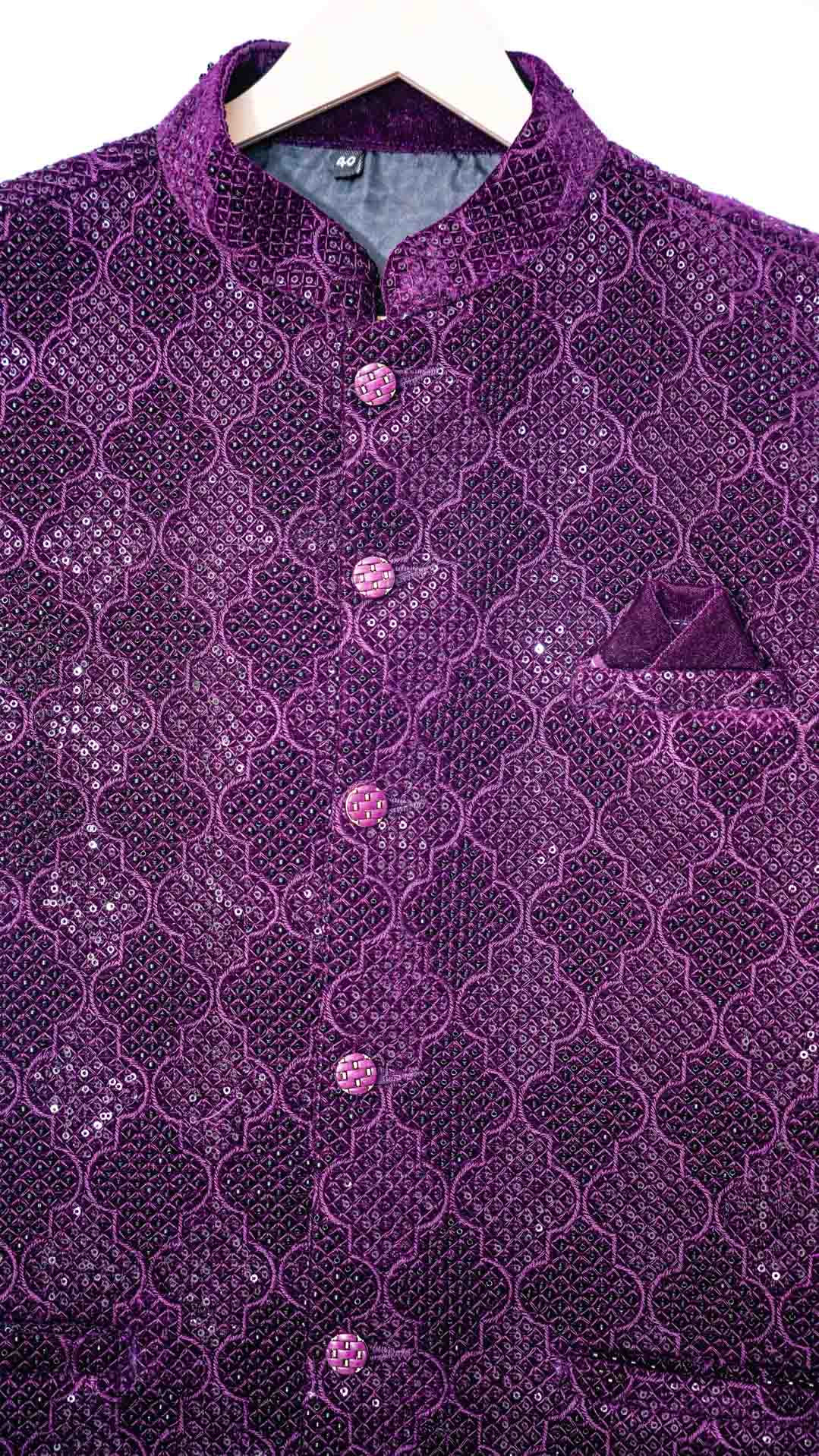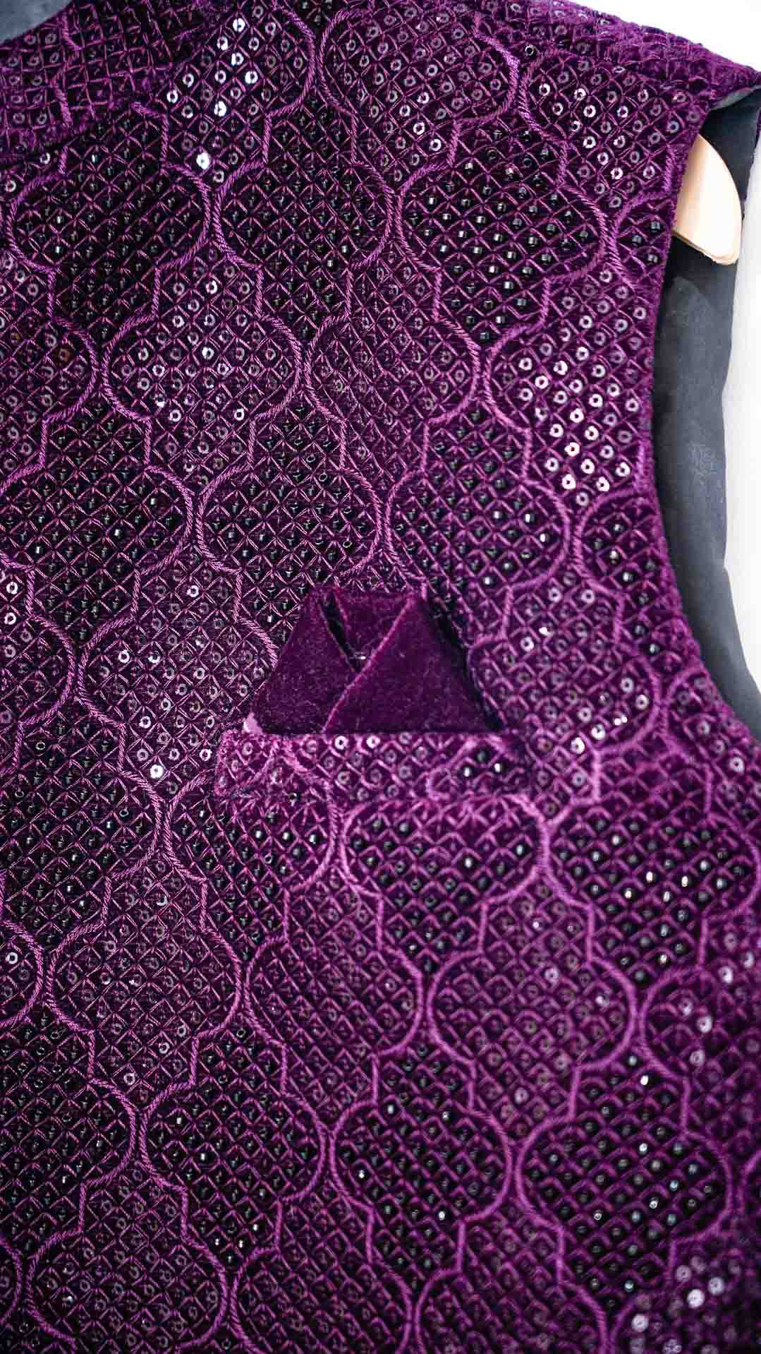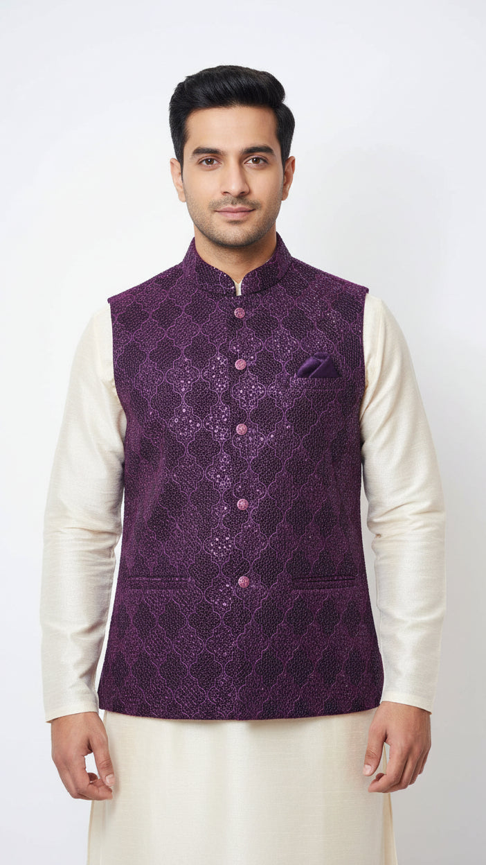Impeccably tailored Nehru Jacket also known as Modi coat features a stand-up collar and intricate buttons. Exquisite zari and sequin embroidery elevates this piece to stand out. Perfect for weddings, cultural events, or formal occasions. Pair with a kurta or modern separates.