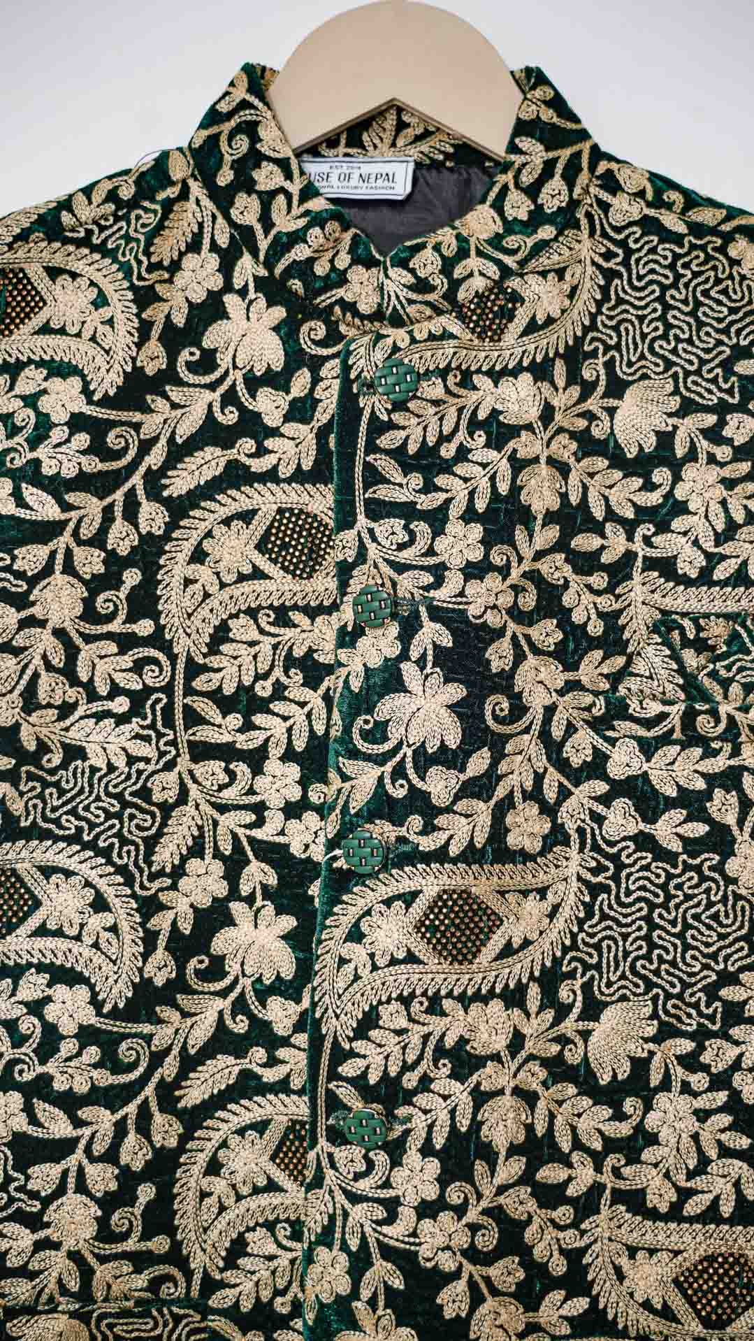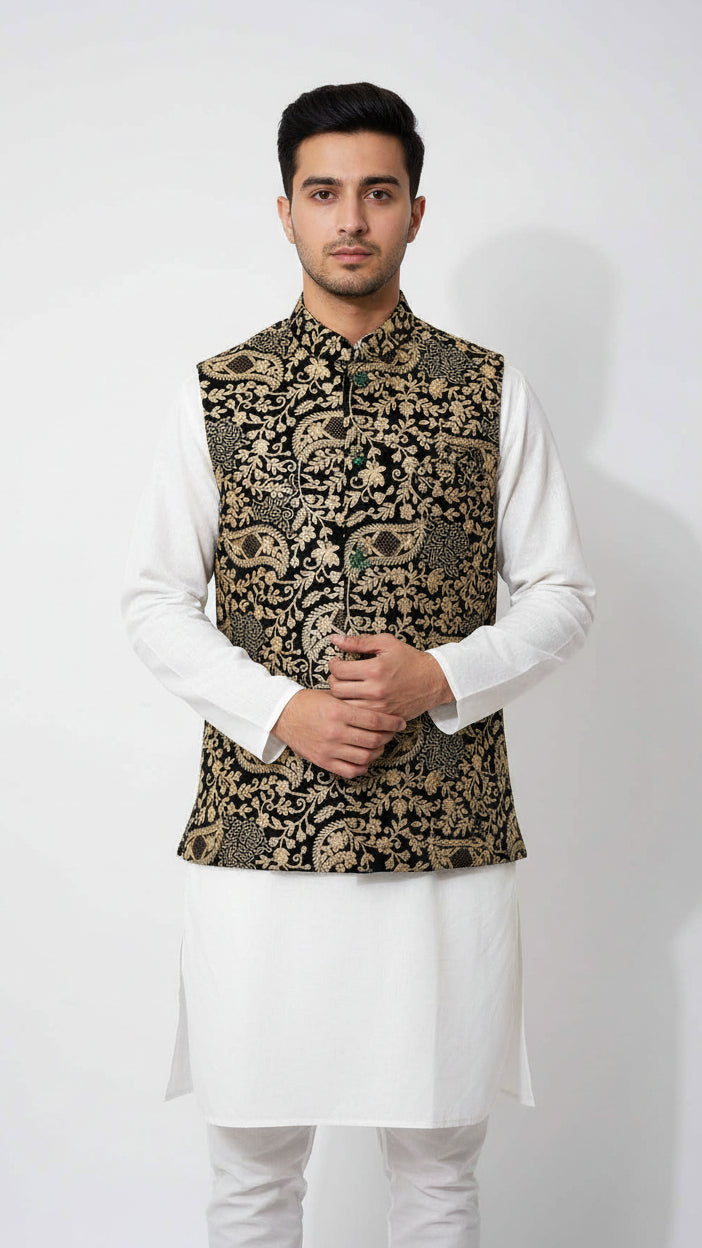 Impeccably tailored Nehru Jacket features a stand-up collar and intricate buttons. Exquisite zari and sequin embroidery elevates this piece to stand out. Perfect for weddings, cultural events, or formal occasions. Pair with a kurta or modern separates.