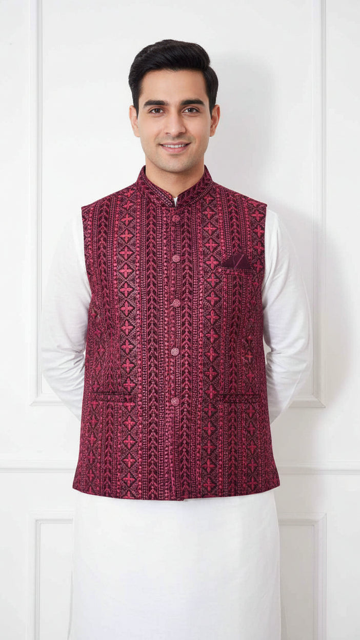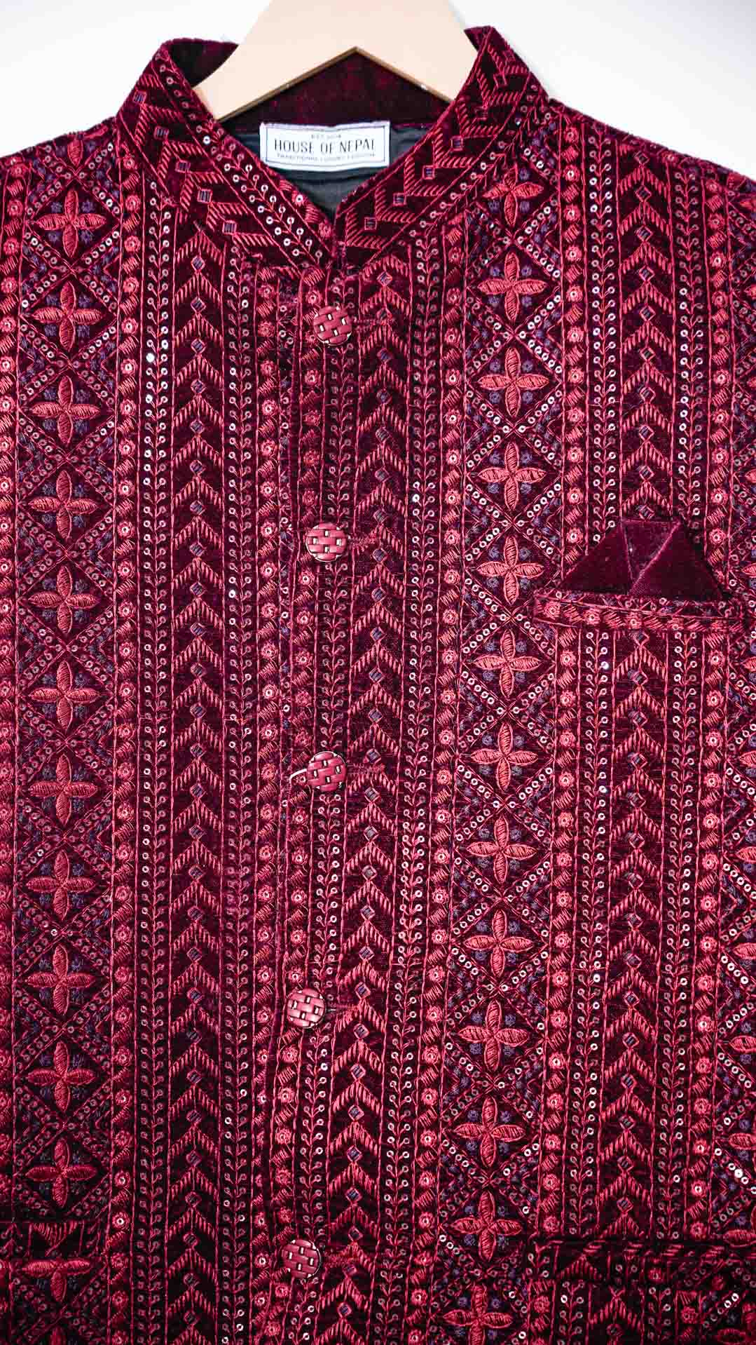 Impeccably tailored Nehru Jacket also known as Modi coat features a stand-up collar and intricate buttons. Exquisite zari and sequin embroidery elevates this piece to stand out. Perfect for weddings, cultural events, or formal occasions. Pair with a kurta or modern separates.