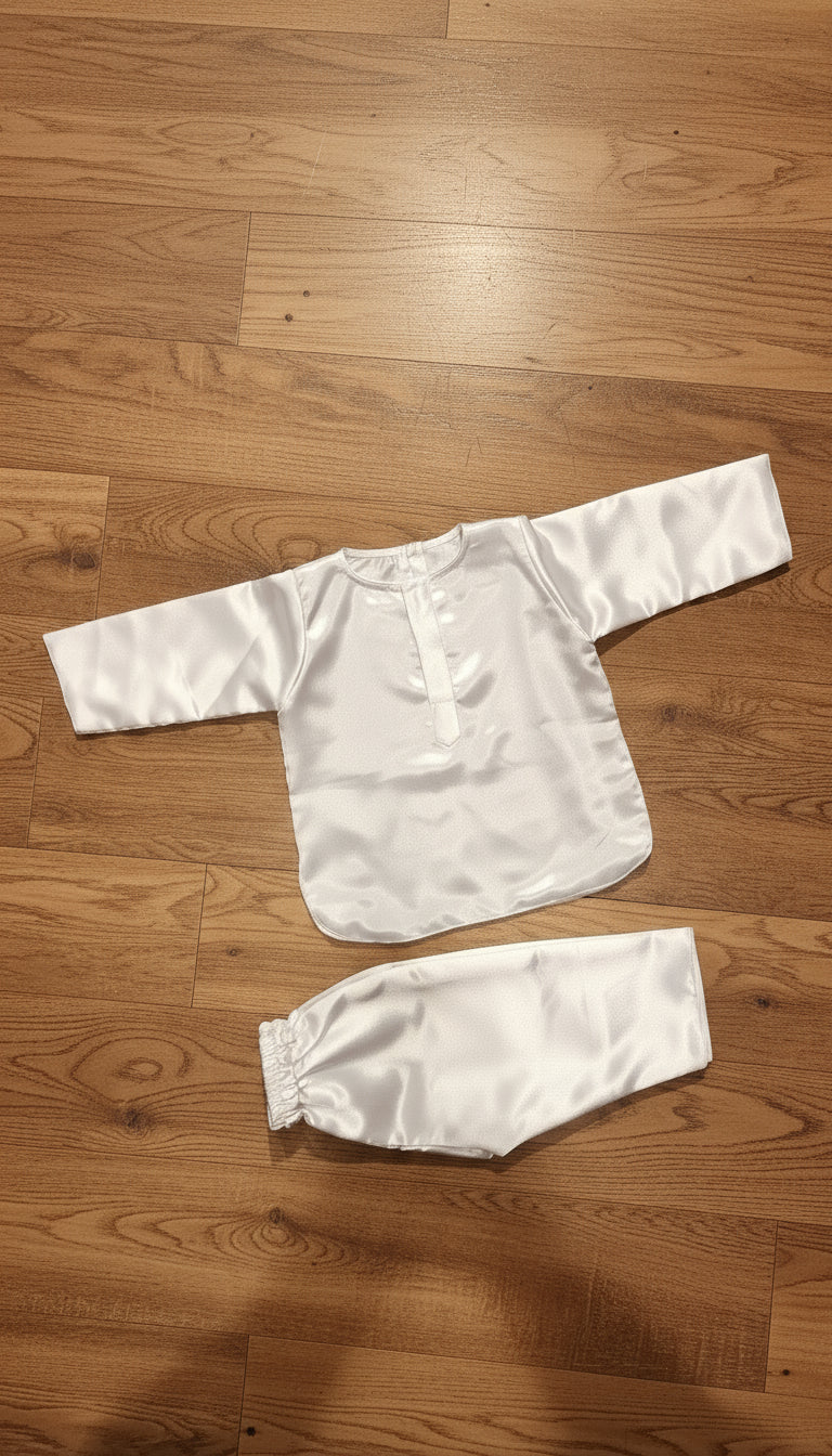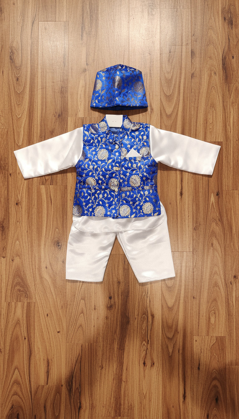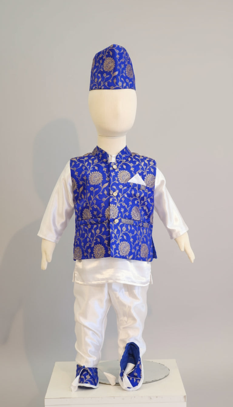 This complete set features a classic white silk kurta surwal (pants and top) with soft cotton inner lining, a beautifully embroidered waistcoat, a traditional dhaka topi (hat), and matching drawstring tie shoes for a coordinated look.