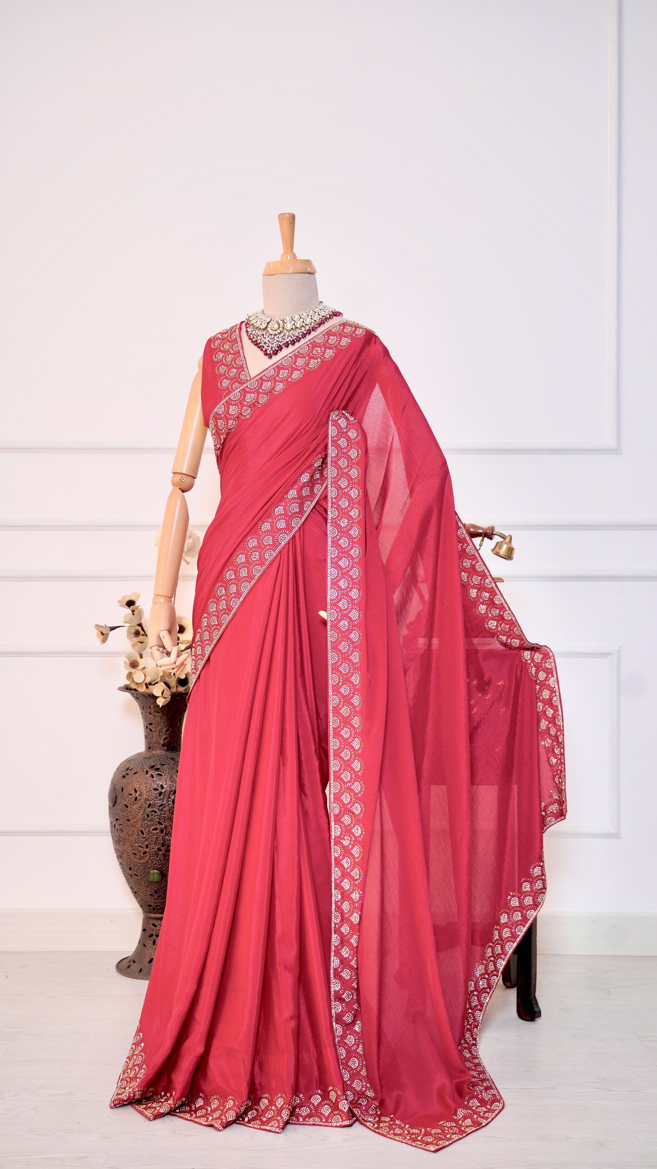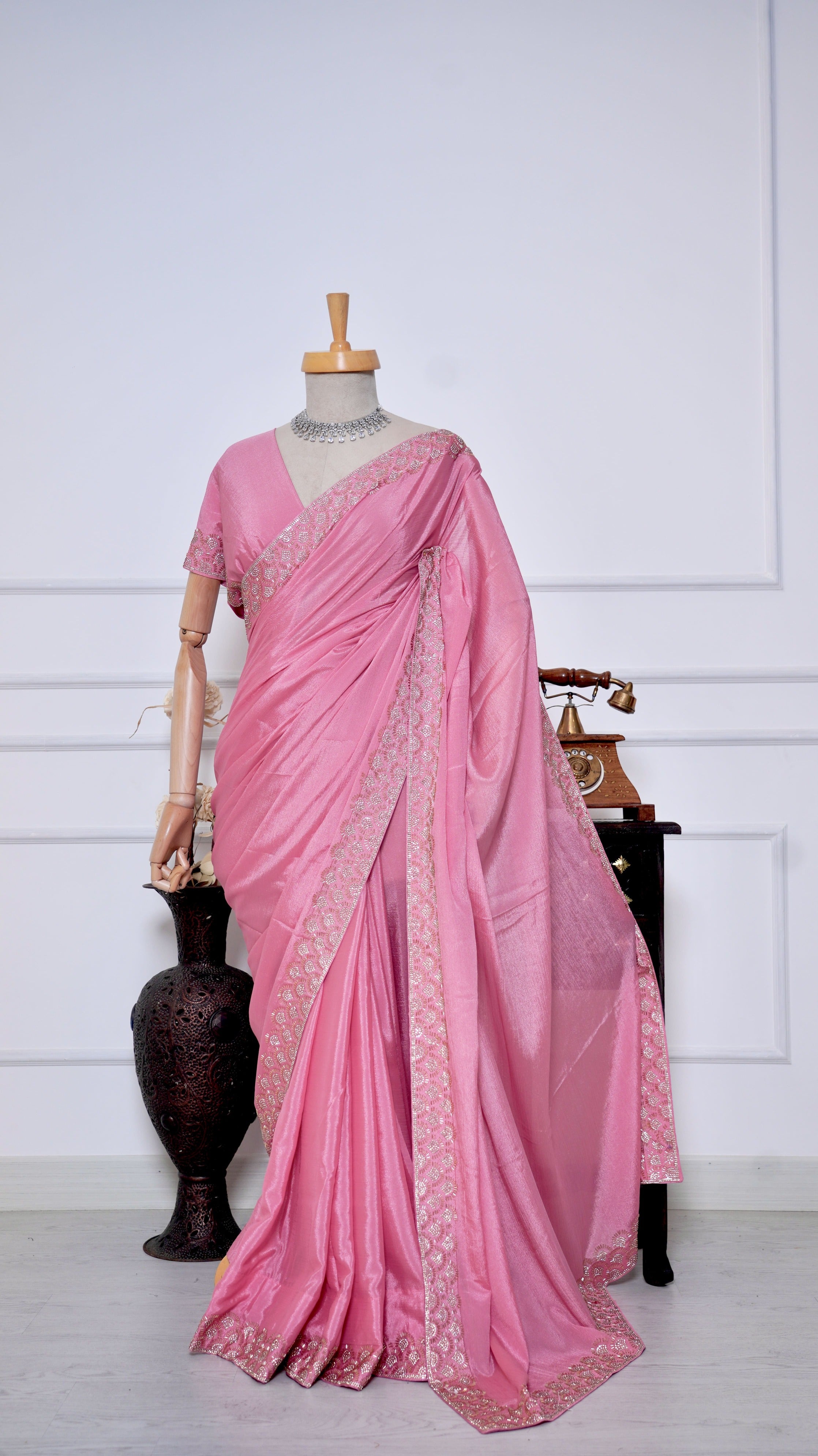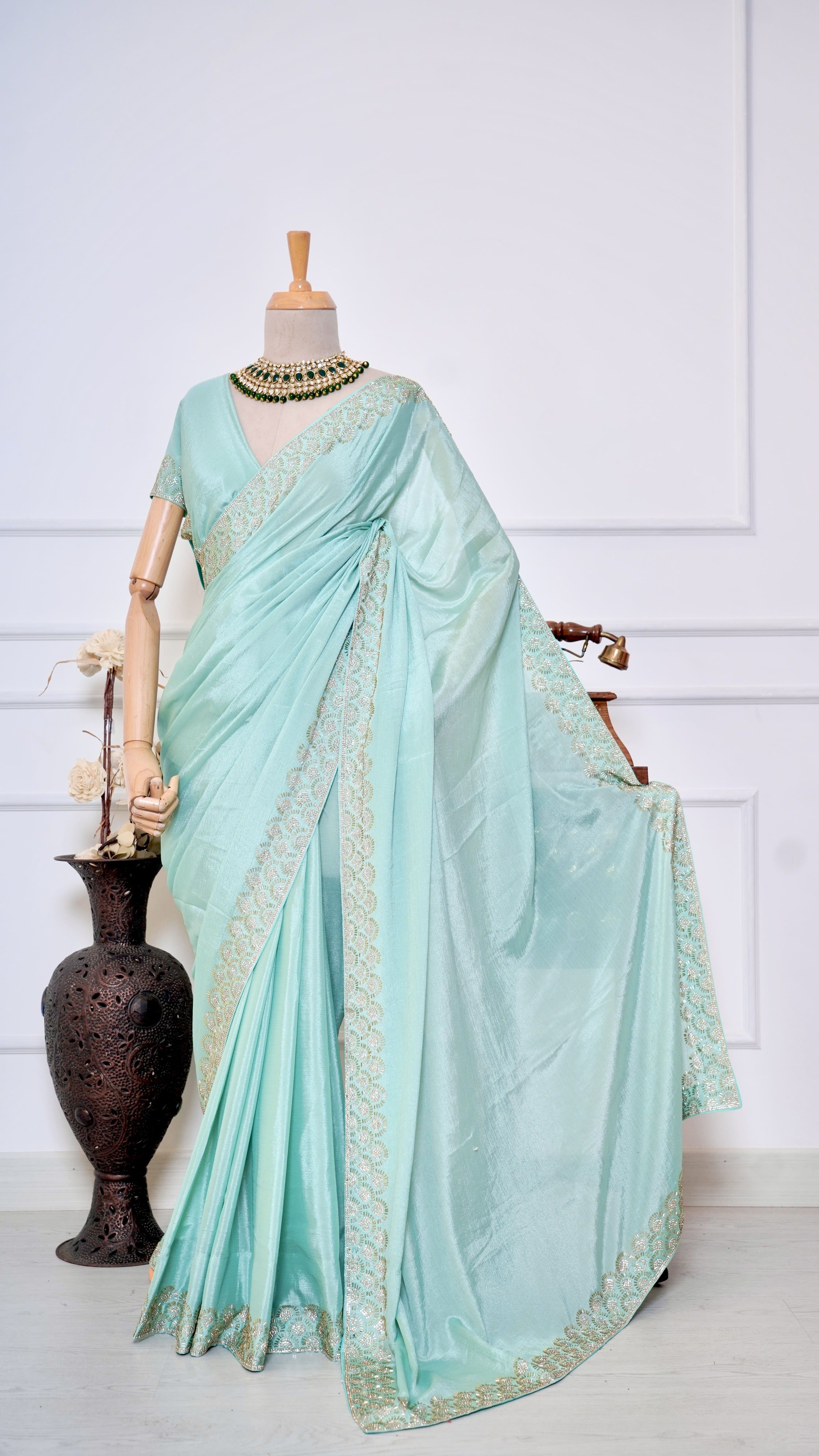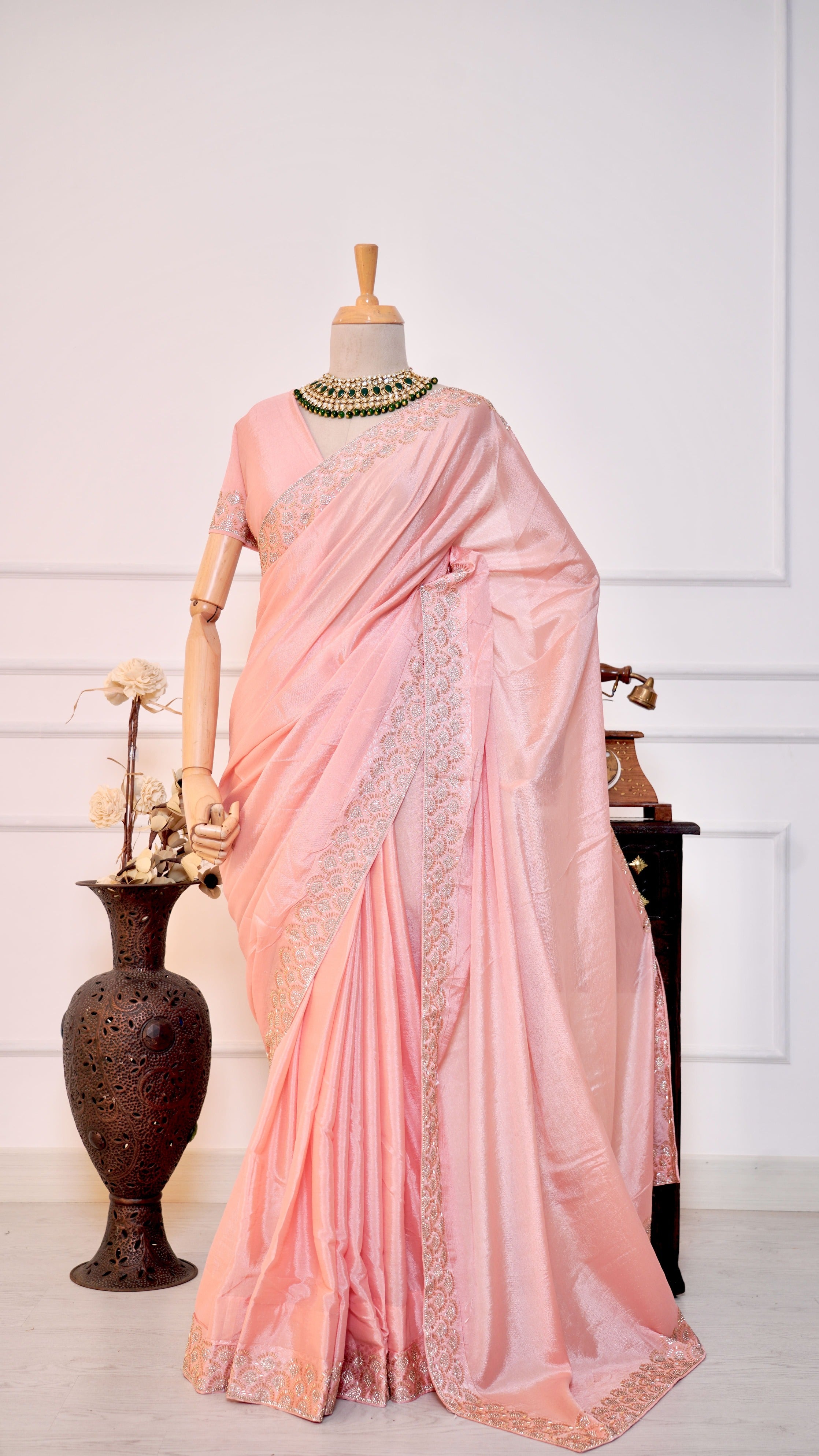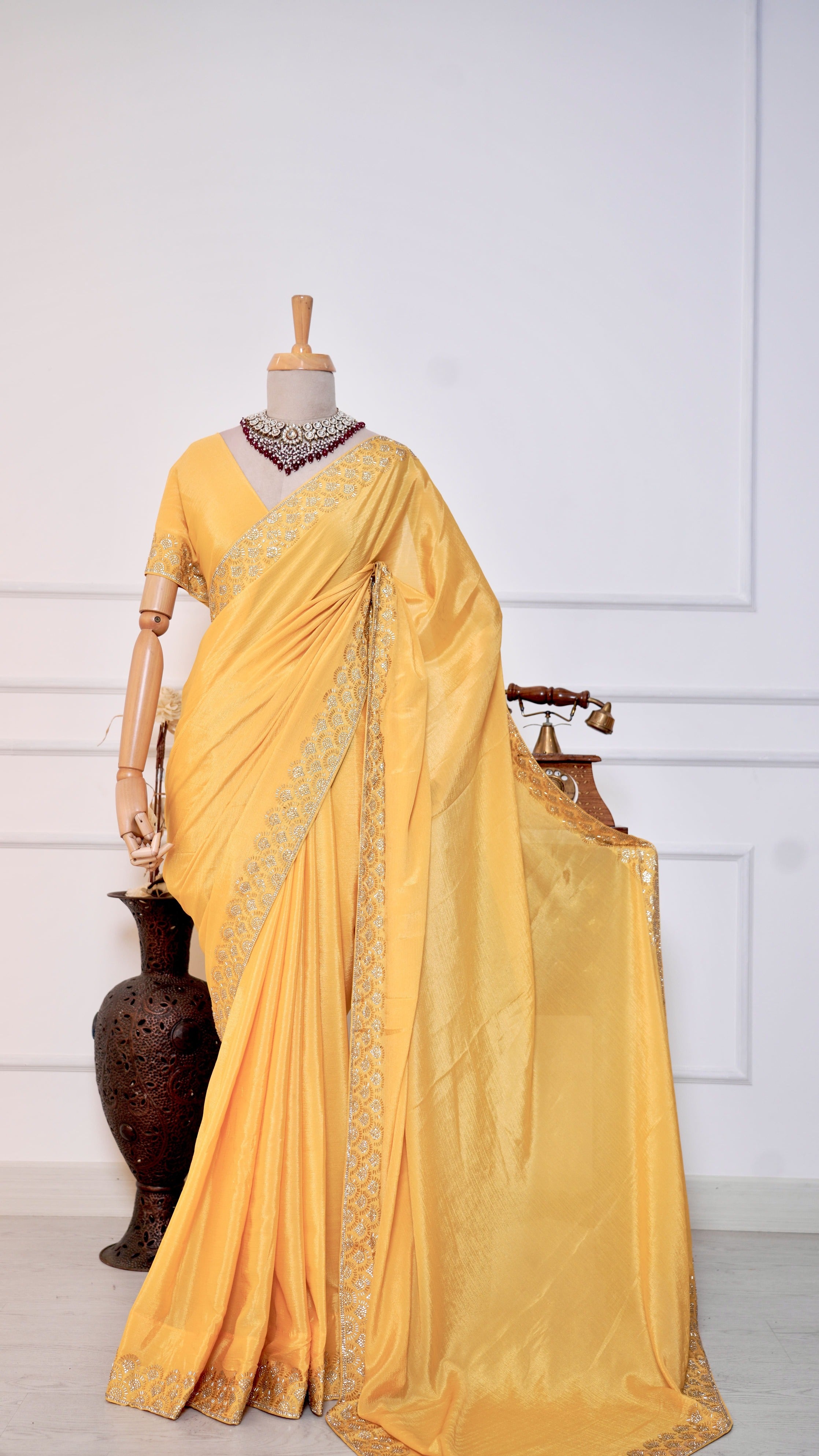 The intricate gold zari work adds a touch of opulence, creating a stunning interplay of texture and shine. Perfect for weddings, festive celebrations, and special occasions, this saree combines classic elegance with a touch of contemporary glamour, ensuring you make a memorable impression.