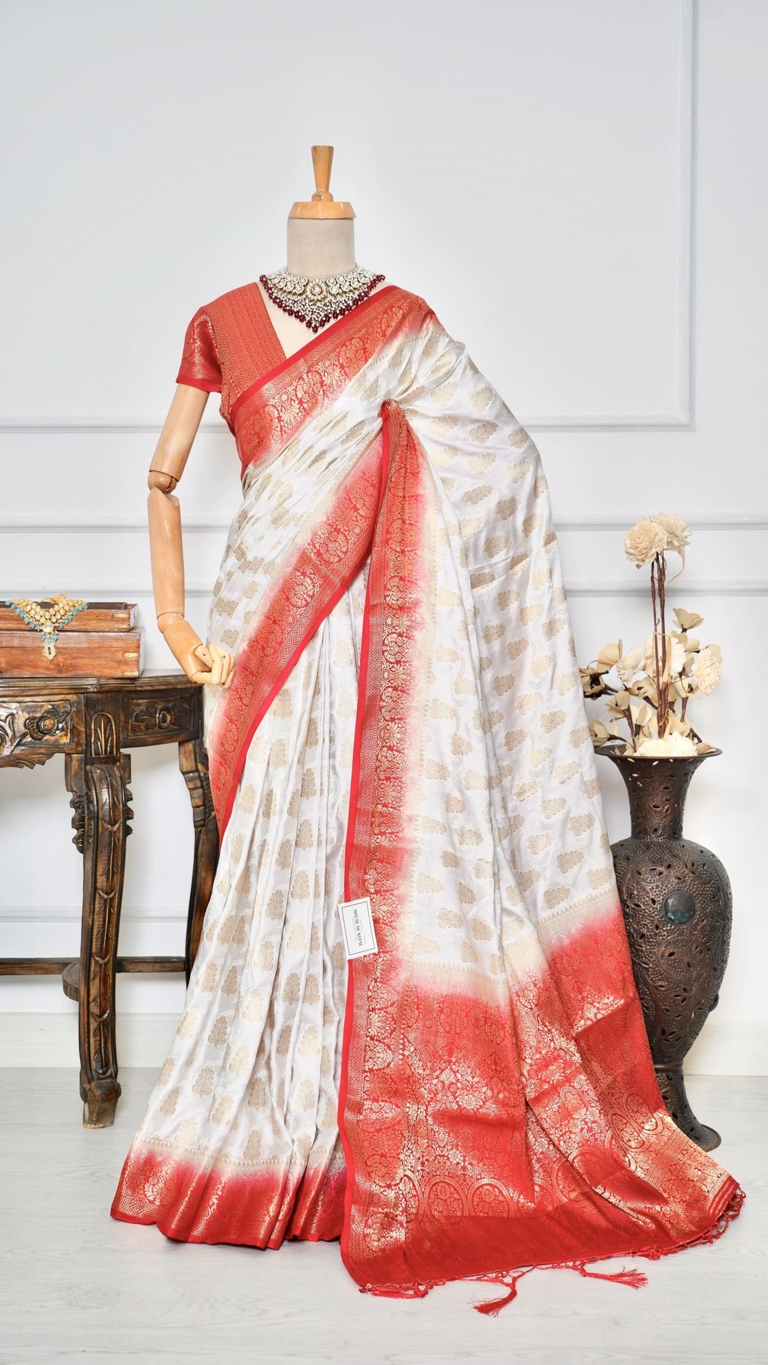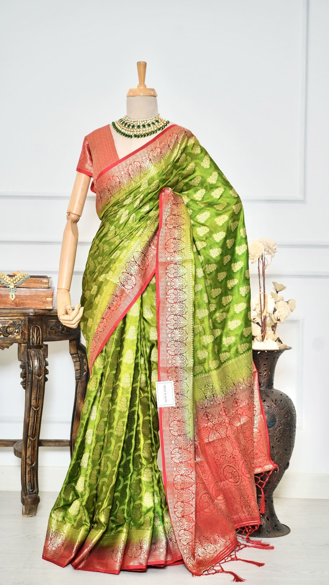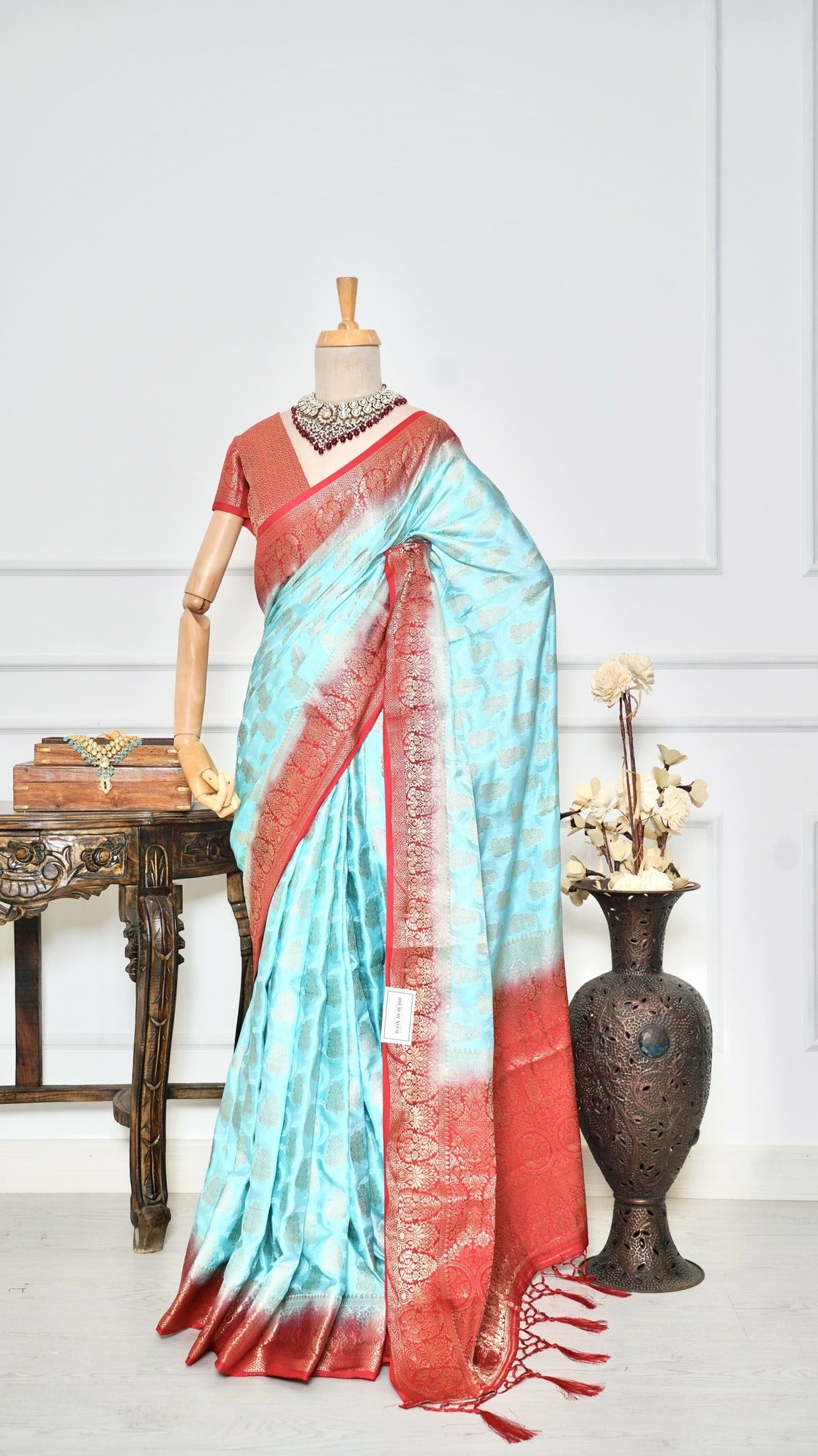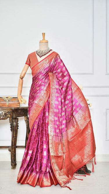 Crafted from premium Dola silk, this exquisite saree showcases a graceful dual-color palette that radiates timeless charm. Adorned with delicate butti work throughout, it adds a touch of subtle elegance and sophistication to your look. The fabric drapes beautifully, offering both comfort and style. Falls and pico are neatly done, ensuring it's ready to wear for any occasion—be it festive, formal, or celebratory. Perfect for those who appreciate understated luxury.