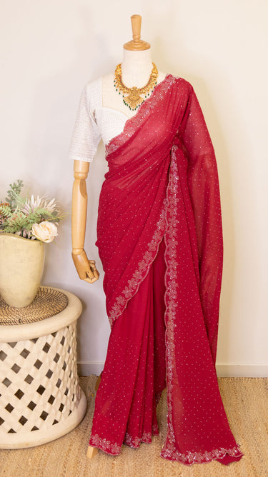 Experience elegance with this Georgette saree, featuring a fluid drape and a stunning Swarovski border. The soft, airy fabric is beautifully complemented by the sparkling crystals, adding a touch of glamour to any occasion. Perfect for weddings and special events, this saree offers a blend of sophistication and modern charm.